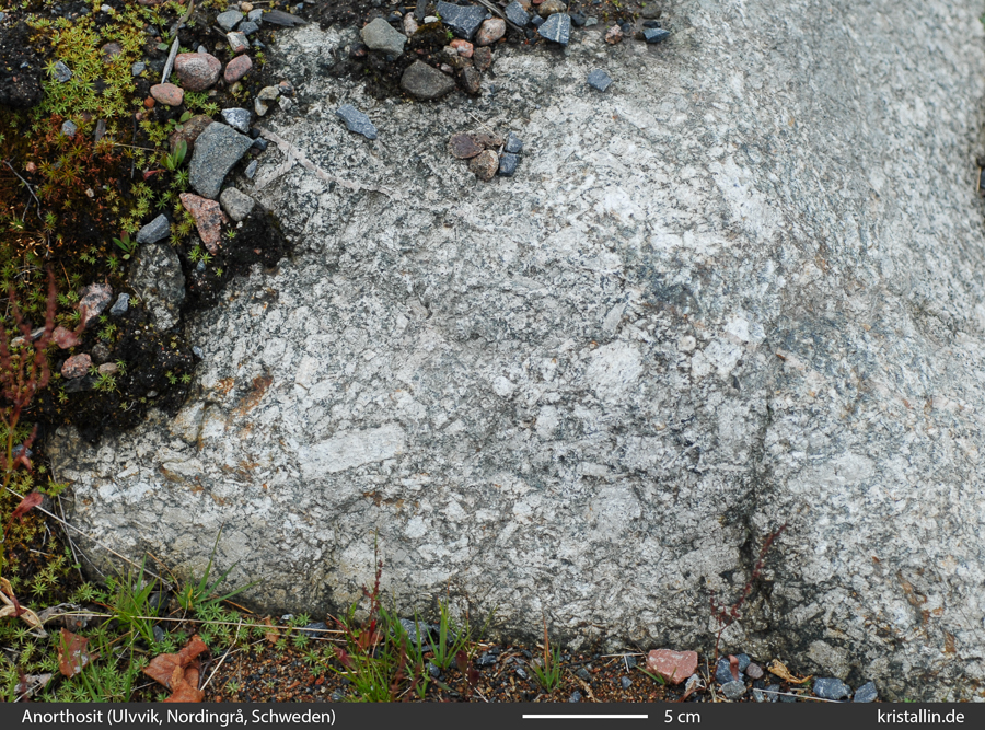 (11/27) Größere Teile des Anorthosits um Nordingrå sind frei von irgendwelchen Beimengungen. Diese Oberfläche ist schon etwas angewittert. Frischer Plagioklas ist nicht so hell.