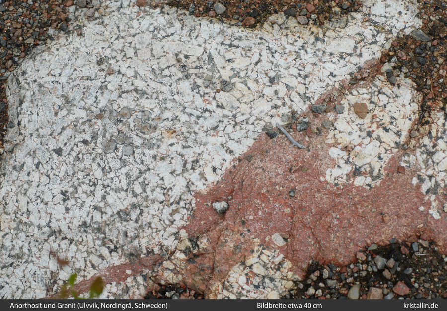(17/27) Mischgestein aus viel rotem Granit und Anorthosit.