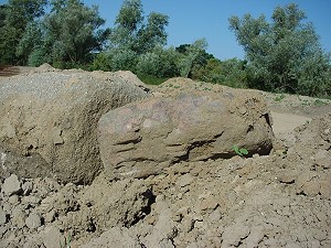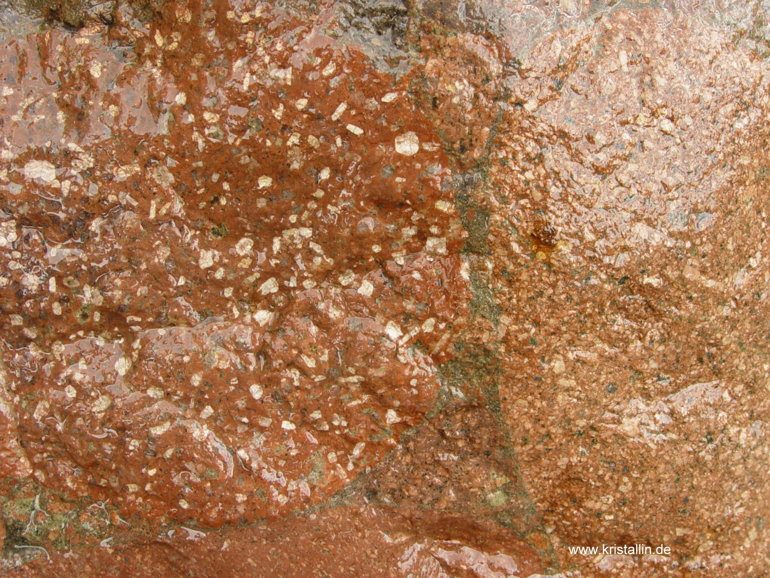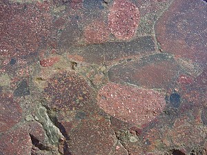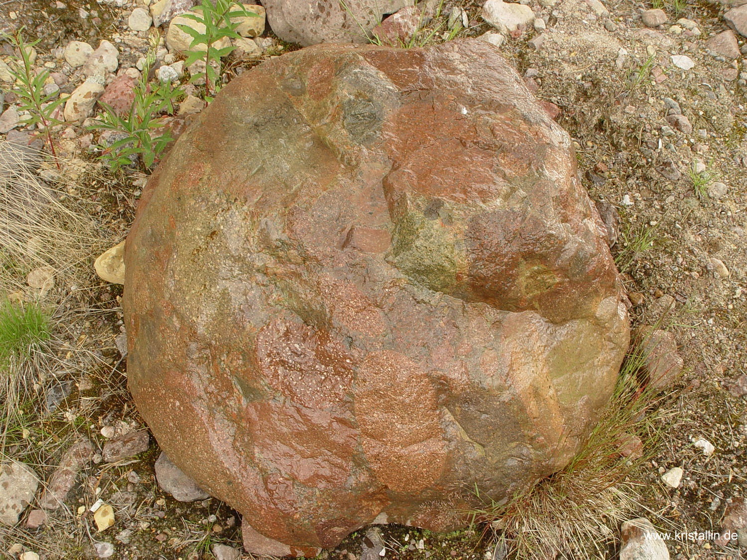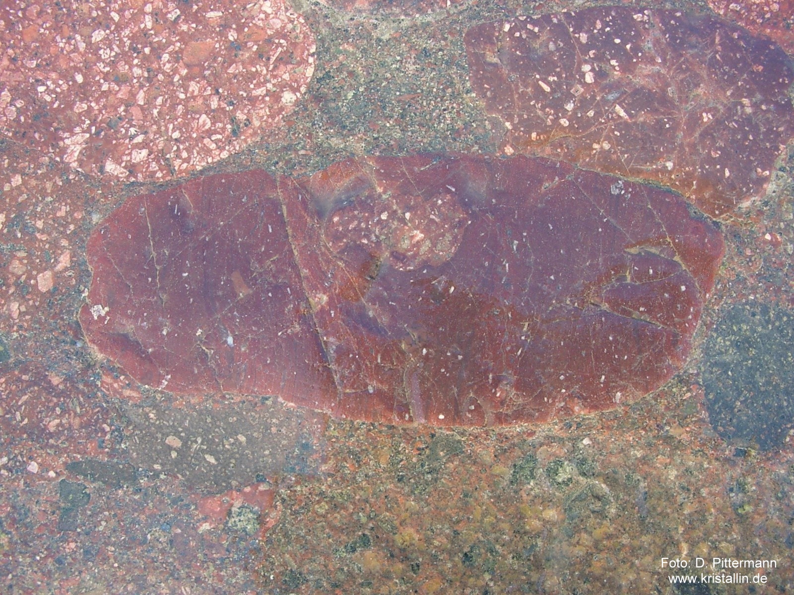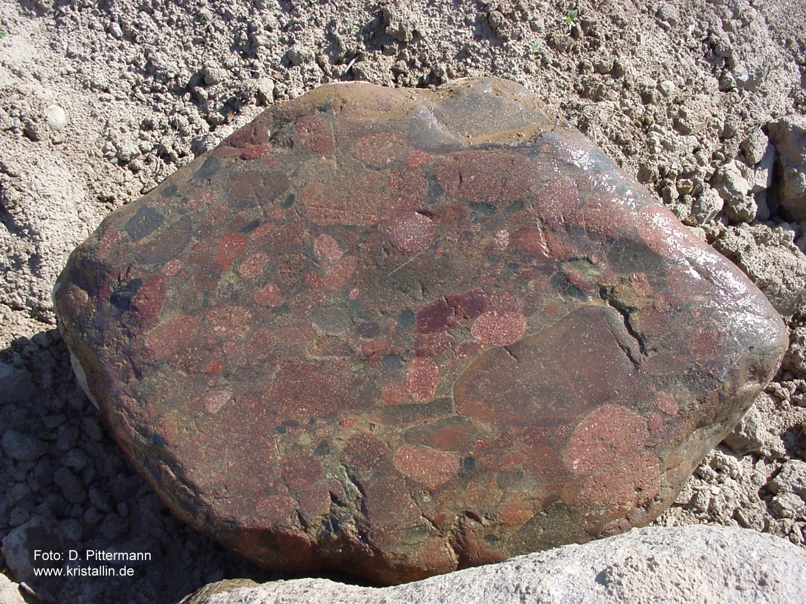 Bildung: Konglomerate sind Sedimentgesteine aus gerundeten und miteinander verkitteten Gesteinsbruchstücken. Diese Bruchstücke müssen in einem Konglomerat größer als 2 mm sein. Sind sie kleiner, handelt es sich um einen Sandstein. Die Gesteinsbruchstücke („Klasten“) bilden sich durch Verwitterung. Anschließender Transport in Bergbächen, Flüssen oder durch die Brandung an Küsten rundet sie zusätzlich. Sammeln sich solche Gerölle zu ganzen Lagen, bezeichnet man sie als Kies. Werden solche Kieslagen von Sand, Ton oder ähnlichen feinkörnigen Sedimenten zugeschüttet, bildet sich die Matrix, also das Füllmaterial zwischen den einzelnen Geröllen. Eine fortdauernde Ablagerung von Sedimenten auf der Oberseite erhöhte die Auflast in den tieferen Schichten und förderte die Verdichtung. Damit sich eine solche Sedimentpackung in ein festes Gestein verwandelt, bedarf es jedoch zusätzlich eines "Klebstoffs". Meist handelt es sich dabei um Quarz (SiO2) oder Kalzit (CaCO3). Diese gelangen, in zirkulierendem Wasser gelöst, ins Sediment. Die Löslichkeit von Kalzit ist jedem bekannt und seine Eignung als Bindemittel offensichtlich. Aber Quarz in Wasser gelöst? Auch wenn Quarz unter Alltagsbedingungen praktisch nicht wasserlöslich ist, ändert sich das grundlegend in alkalischen Wässern und bei hohen Temperaturen. Kommt solch mineralbefrachtetes Wasser in eine Region mit einem anderen pH-Wert oder veränderter Temperatur, werden Kalzit oder Quarz wieder ausgeschieden und verbinden das Umgebungssediment. Zum chemischen Gefälle und Temperaturschwankungen kommen die langen Zeiträume. Auch winzigste, im Wasser gelöste Mengen addieren sich in Jahrhunderten, wenn sie ständig ausgefällt werden. Herkunft: Konglomerate sind im Geschiebe gar nicht selten, aber ihre Herkunft läßt sich keineswegs immer bestimmen. Das Digerberg-Konglomerat jedoch, um das es hier geht, stammt aus Dalarna in Mittelschweden und ist ein vorzügliches Leitgeschiebe. Es ist unverwechselbar und besteht in seiner auffälligsten Form aus Geröllen von Dalarna-Porphyren. Damit gehört es zu den hübschesten und buntesten Gesteinen, die man finden kann. Es kann auch von dem erkannt werden, der es vorher noch nie gesehen hat. ![]() ![]() Dieses Digerberg-Konglomerat hat einen Durchmesser von 80 cm. Das Foto entstand in Dalarna, dicht beim Bärenpark am Berg "Grönklitten", nördlich vom Siljansee. Die Nahaufnahme zeigt das charakteristische der Digerberg-Konglomerate: Gerölle von unterschiedlichen Dalarna-Porphyren, die in eine Matrix aus feinkörnigem Sediment eingebettet sind. Im Bild unten sind zwei Gerölle rechts und links angeschnitten, unten ist der Rand eines dritten, hellbraunen zu sehen. In der Matrix stecken weitere kleine Gerölle. ![]() ![]() Solche Stücke findet man nicht nur in Schweden, wie das folgende Bild zeigt. ![]() ![]() Dieses ausnehmend schöne Digerberg-Konglomerat wurde von Dirk Pittermann bei Tarzow im nördlichen Mecklenburg gefunden. Es hat eine Länge von knapp einem Meter und befindet sich jetzt im Geschiebegarten in Raben Steinfeld, am östlichen Stadtrand von Schwerin. Sie können es dort besichtigen. (Anfahrtsskizze) Unterhalb noch einige Bilder, zuerst die Fundsituation. (Alle Bilder dieses Geschiebes: Dirk Pittermann, Zittow)