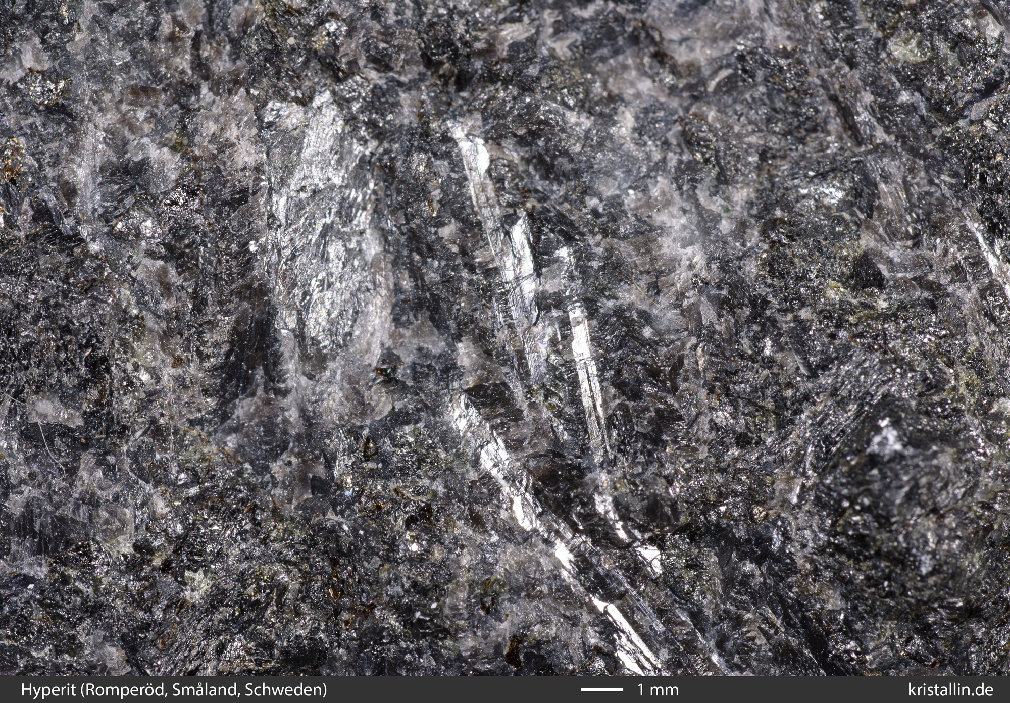 Die schlanken Plagioklase erkennt man nur bei guter Beleuchtung. Hätte der Feldspat eine so helle Farbe wie in anderen mafischen Gesteinen, dann wären die Hyperite voller kleiner weißer Nadeln. So ein Gefüge mit einzelnen größeren Plagioklasen in einer feinkörnigen Grundmasse nennt man „Dolerit“ (alte Bezeichnung „Diabas“). Da die Plagioklase hier aber sehr dunkel sind, kann man sie auf den ersten Blick kaum vom Pyroxen unterscheiden und deshalb wirken diese Gesteine massig und schwarz.