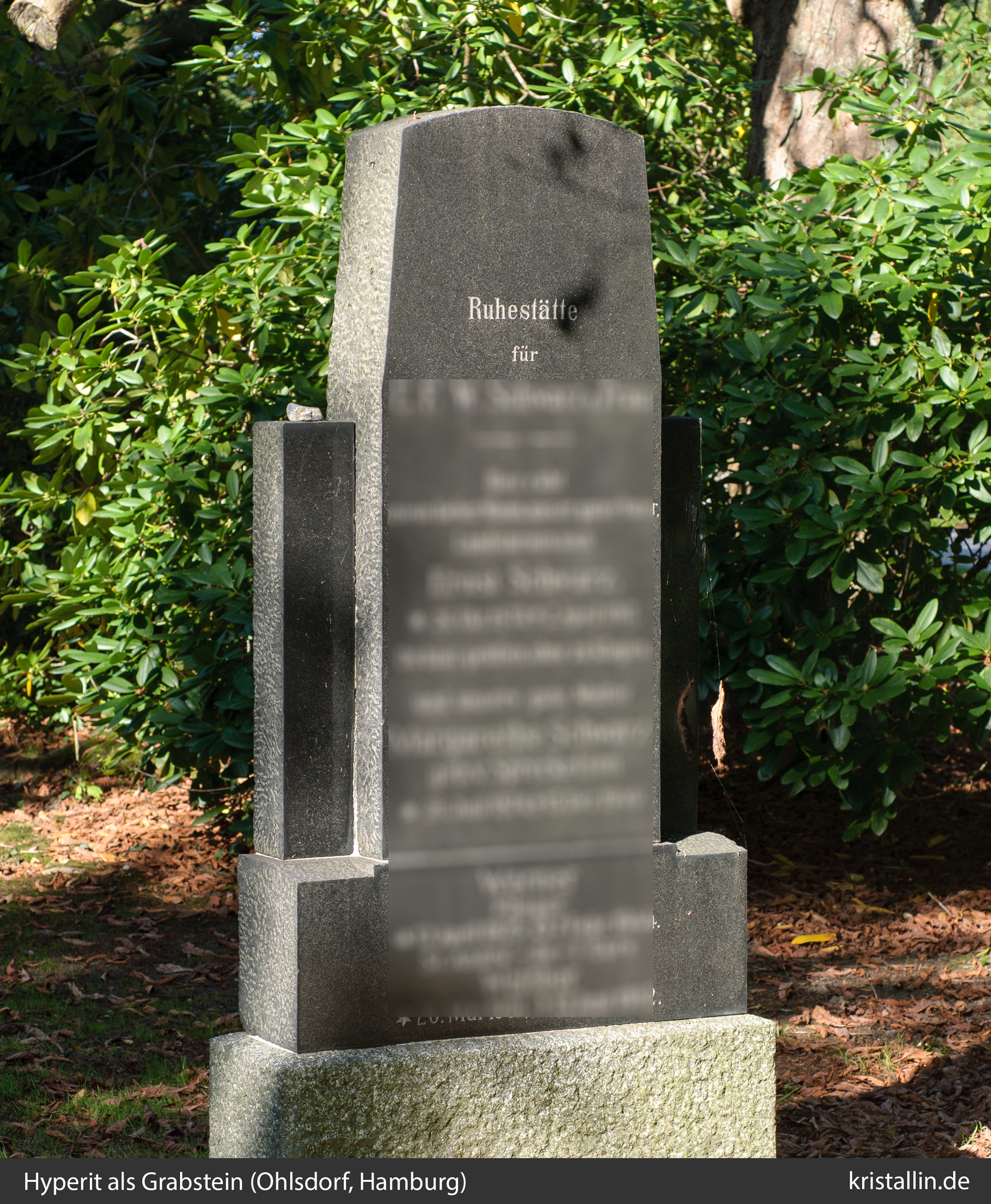 Es war vor allem die tiefschwarze Farbe, die den Hyperit begehrt machte. Ein großer Teil wurde als Grabsteine verwendet, die man noch heute auf unseren Friedhöfen findet. Die beiden folgenden Beispiele habe ich auf dem Ohlsdorfer Friedhof in Hamburg fotografiert.
