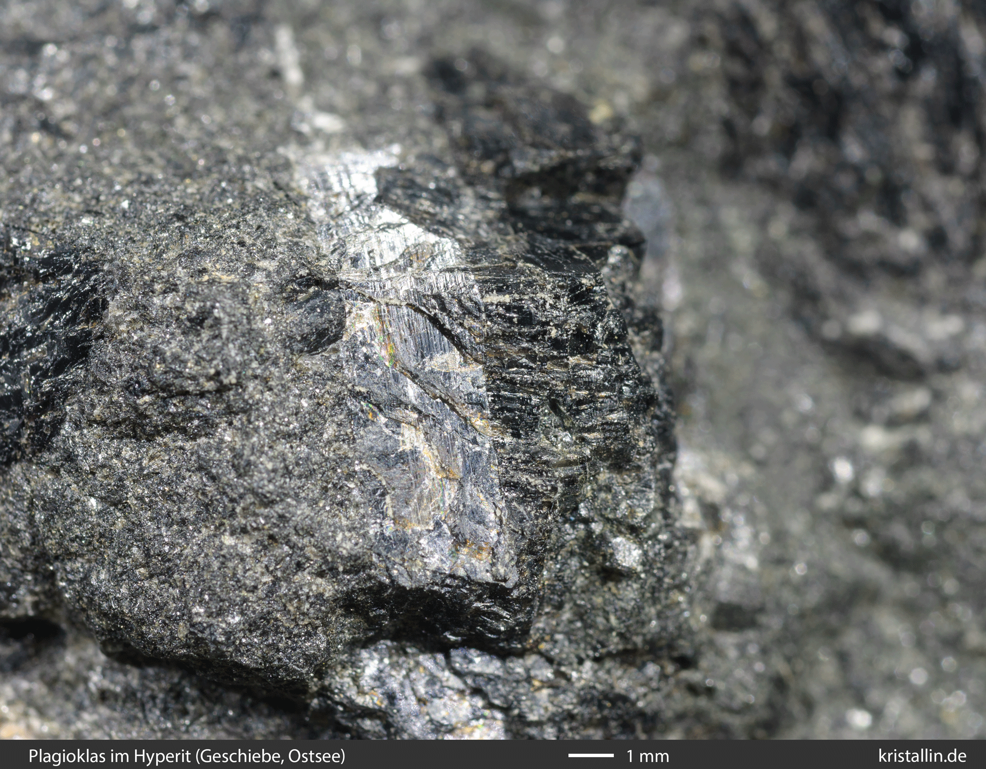 Hyperites with such large plagioclase crystals have been found several times as erratics in Northern Germany. It is therefore very likely that there are other coarse-grained deposits besides Romperöd. As erratics, hyperites can be recognised by their black colour. Furthermore the slender feldspars must be plagioclase. Therefore you have to find the typical twin stripes with a magnifying glass (picture 10).