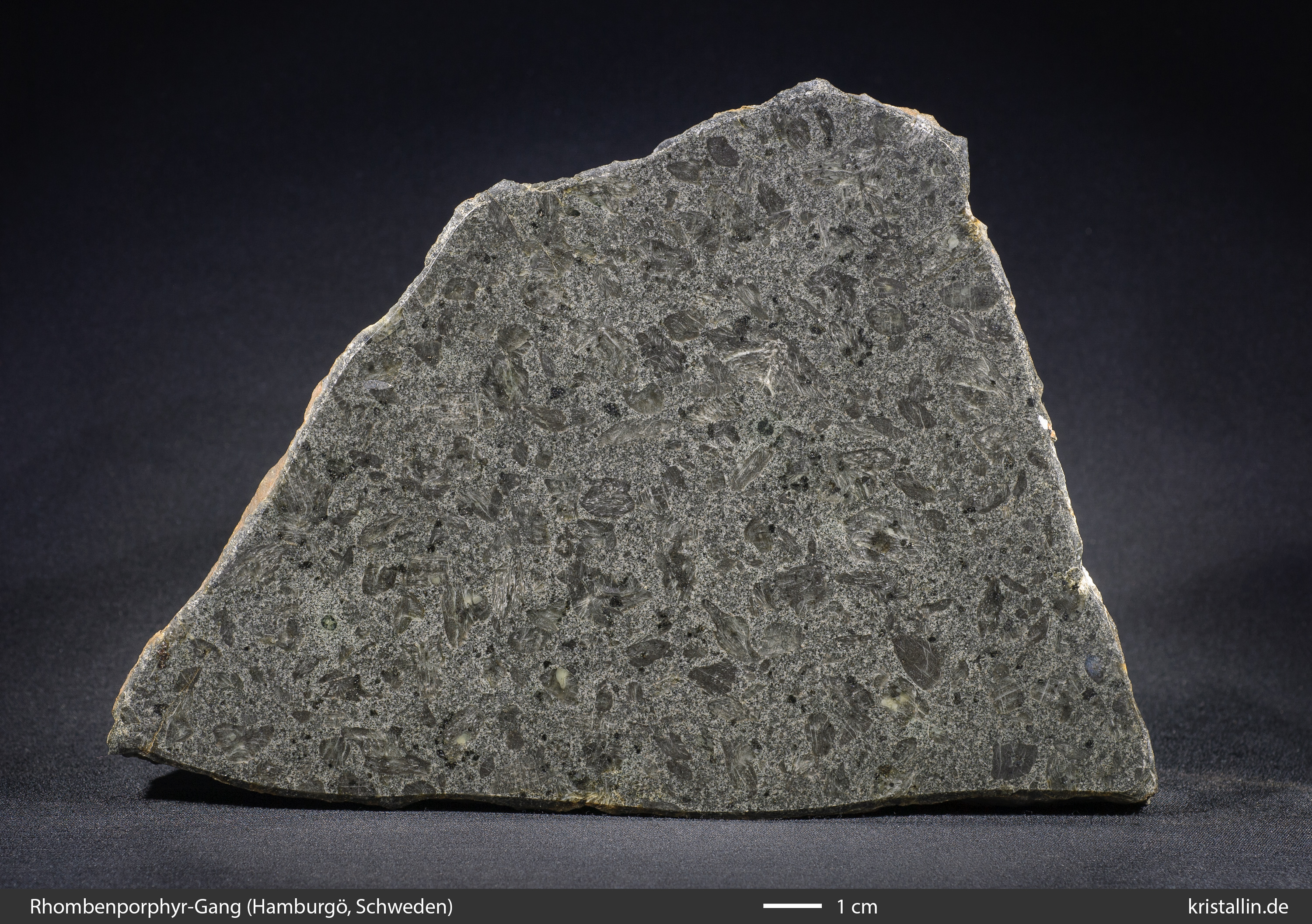 Wegen der körnigen Grundmasse werden auch Rhombenporphyr-Gänge ins Gespräch gebracht. Die an Land zugänglichen Gänge an der schwedischen Westküste sehen anders aus als die Geschiebe. Der häufigste Typ ist dieser hier: