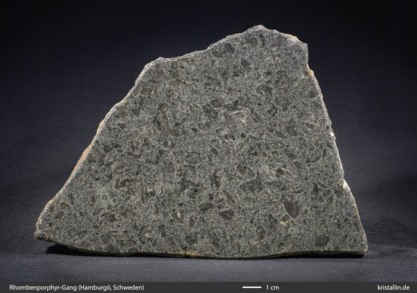 Das Geschiebe von Seeland (Dk) ist noch stärker porphyrisch und enthält viele Rhomben. Auch seine Grundmasse ist fleckig graubraun und enthält rötlich-braune Granate.