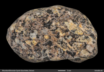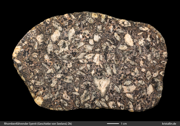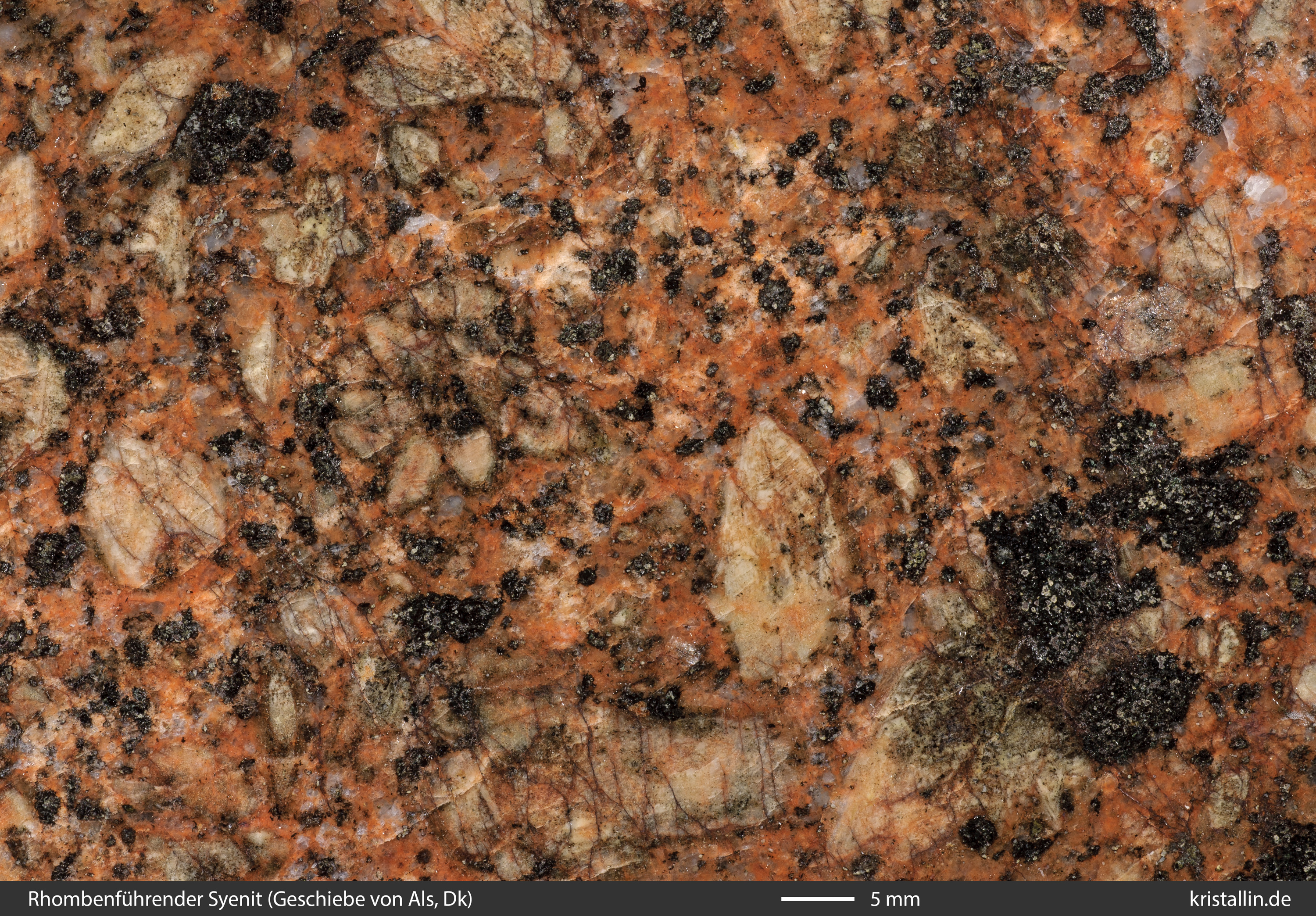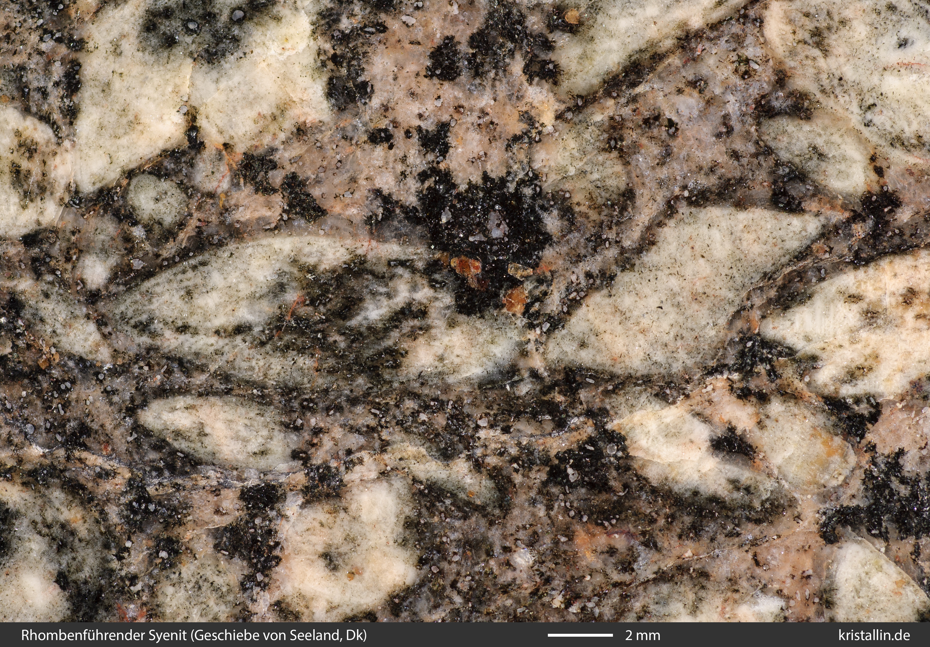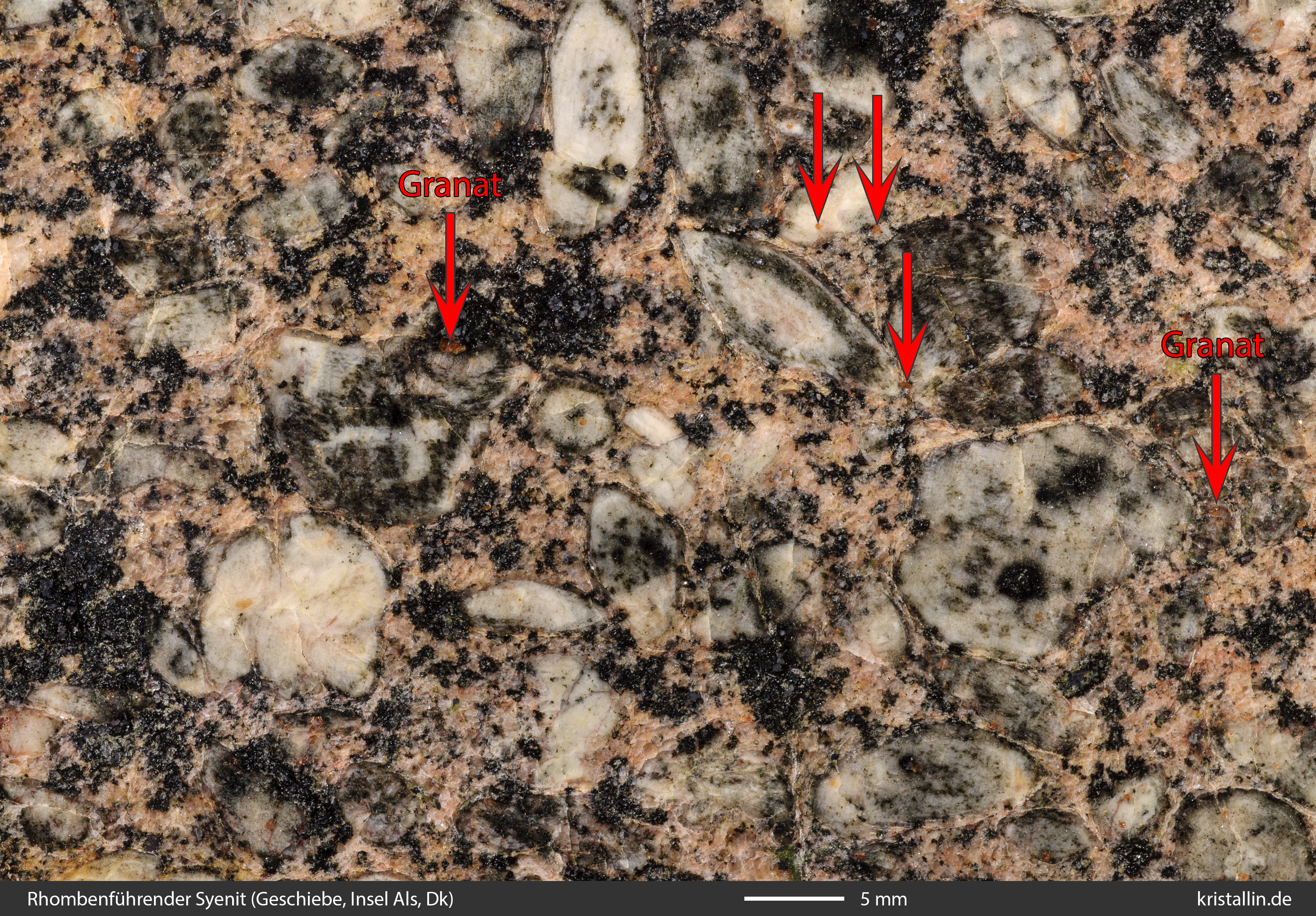 Wer sich mit Gesteinen in Norddeutschland beschäftigt, wird über kurz oder lang einen dieser rhombenführenden Syenite finden. Die Geschiebe sind an den Rhomben und der körnigen Grundmasse leicht zu erkennen. Oft stecken darin auch kleine Granate. Quarz fehlt oder macht nur einen kleinen Teil des Gesteins aus.