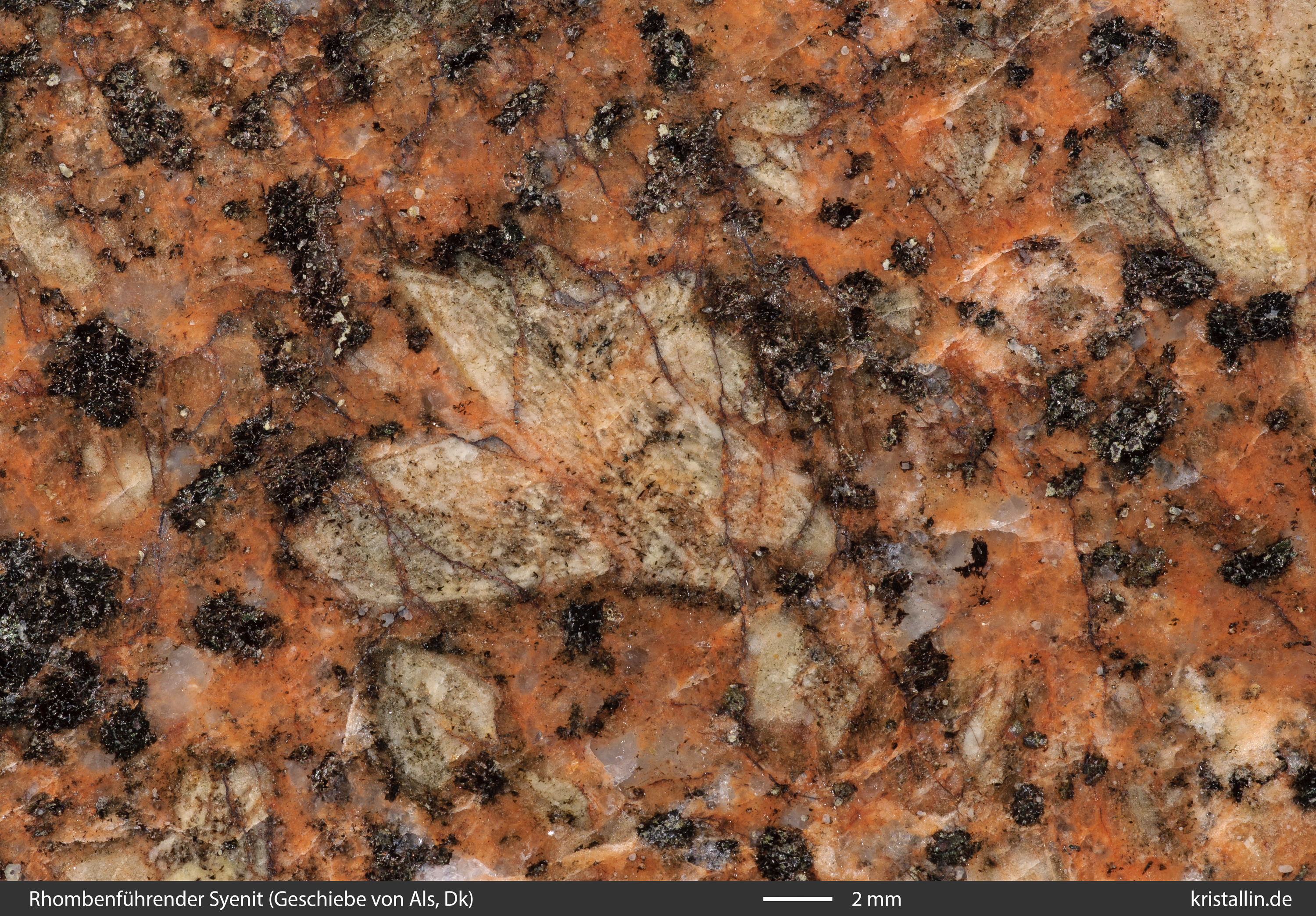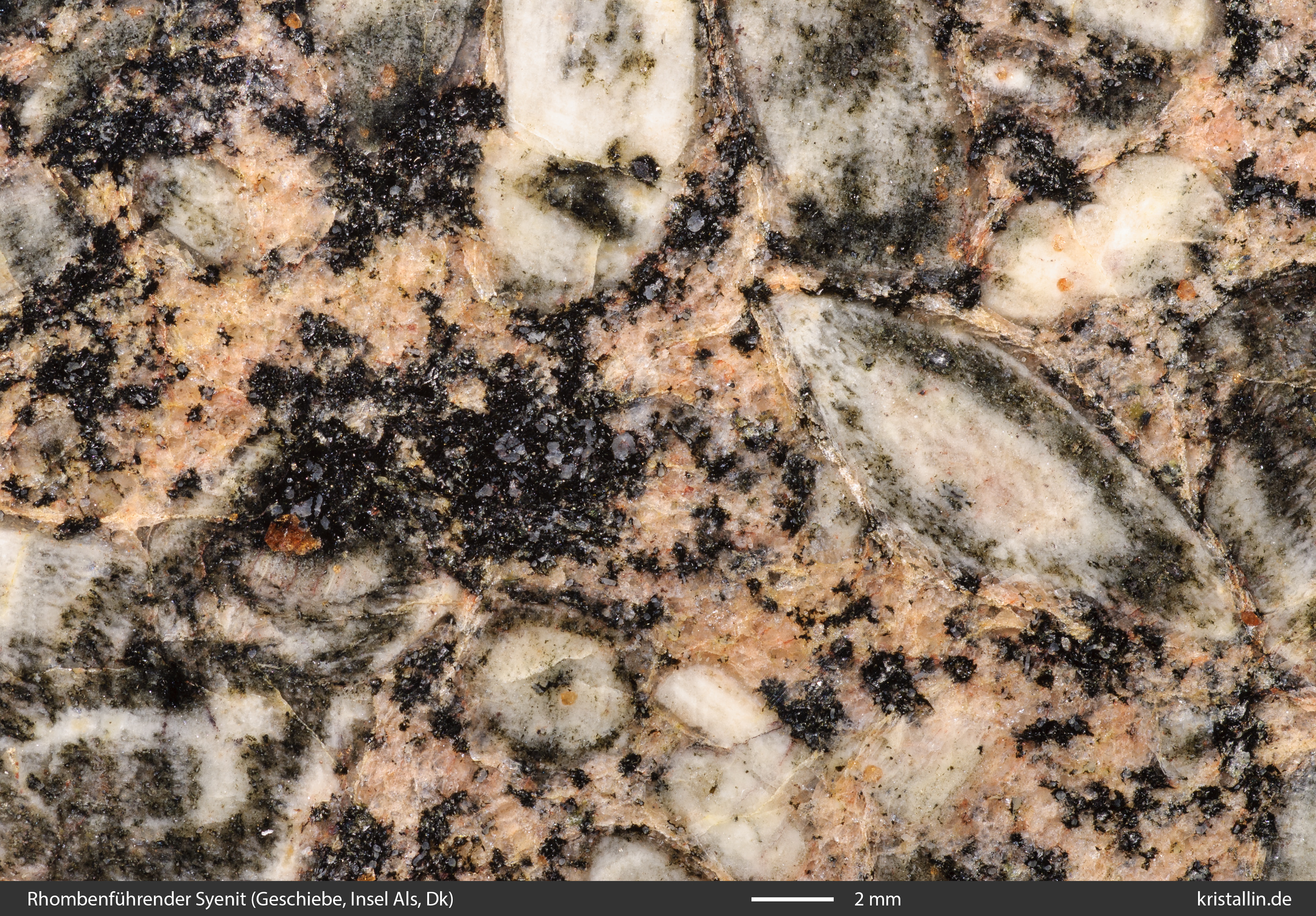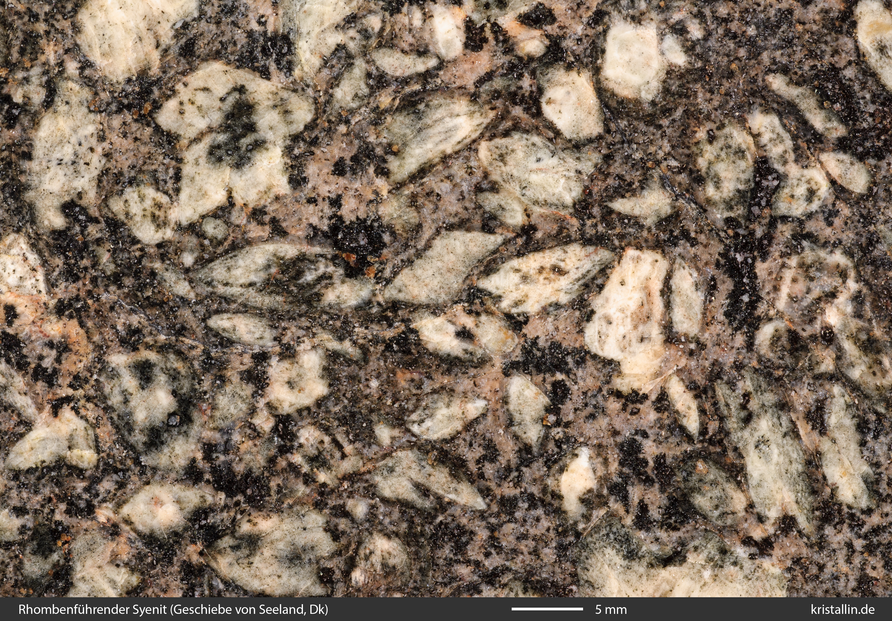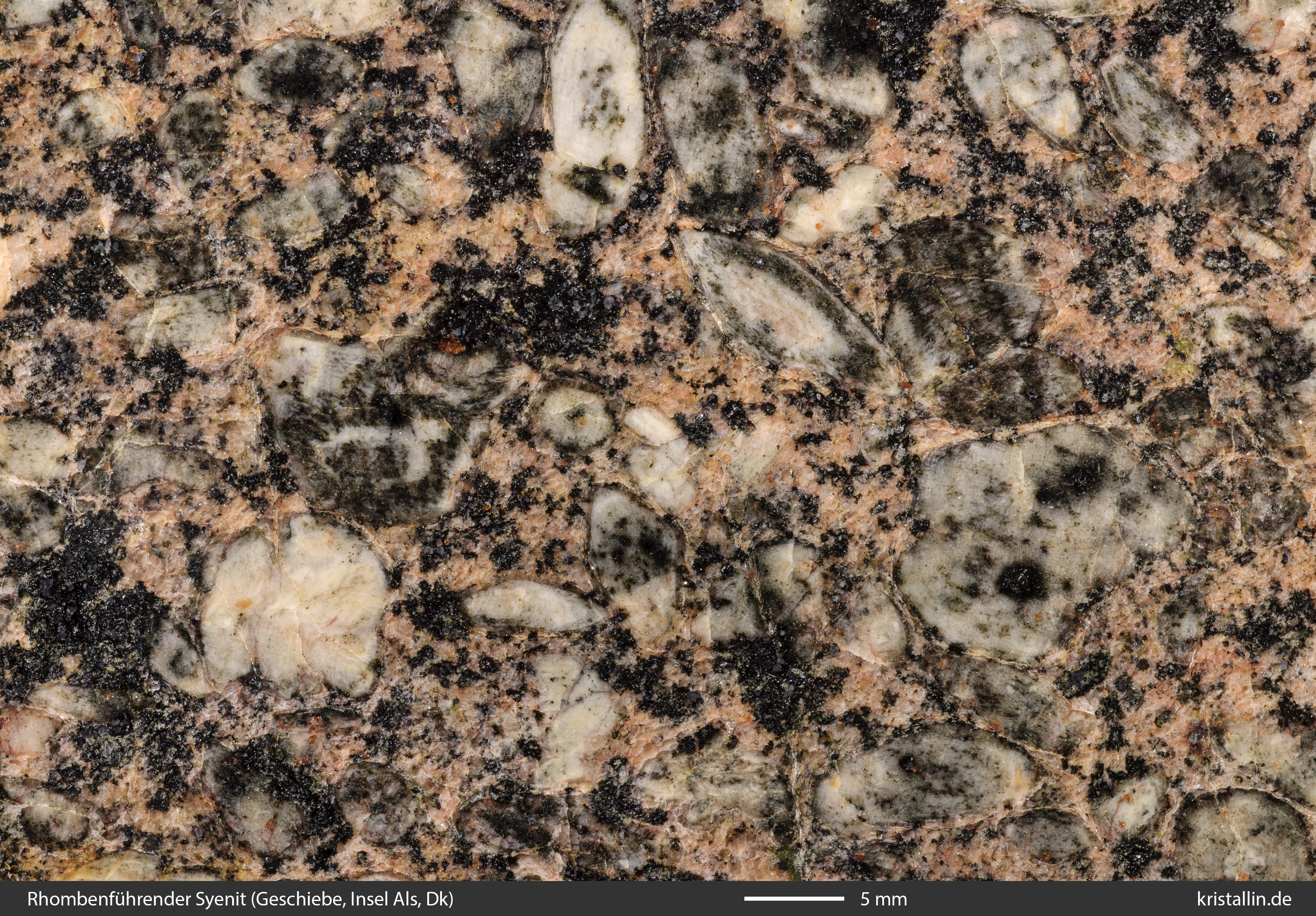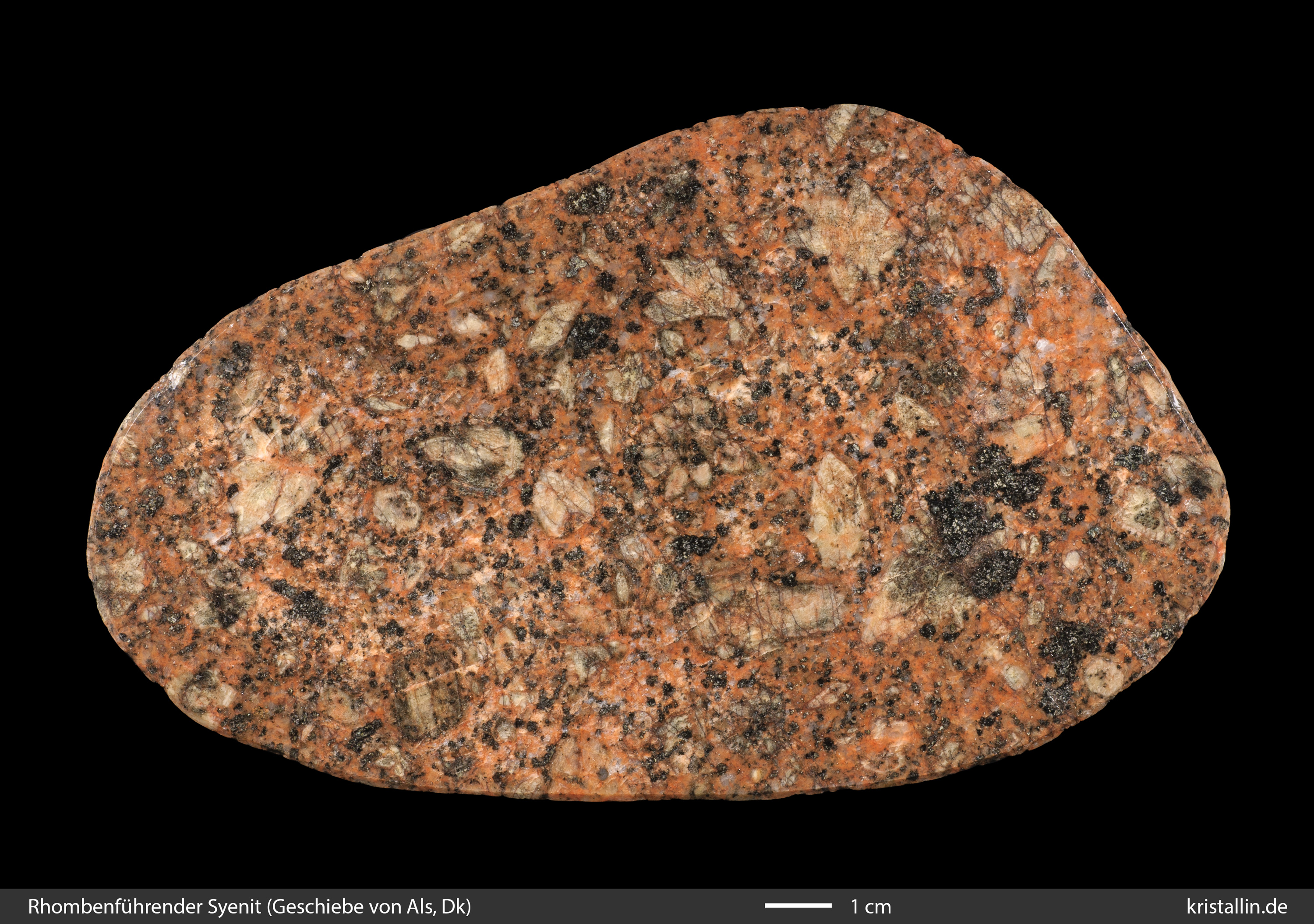 Diese Syenite kommen in verschiedenen Varianten vor und ähneln ein wenig den norwegischen Rhombenporphyren. Aber diese Geschiebe stammen nicht aus Norwegen und es handelt sich auch nicht um Rhombenporphyre aus Gängen. Die Herkunft dieser Gesteine ist unbekannt. Südschweden erscheint als Herkunftsregion wahrscheinlich.