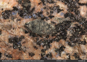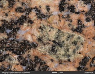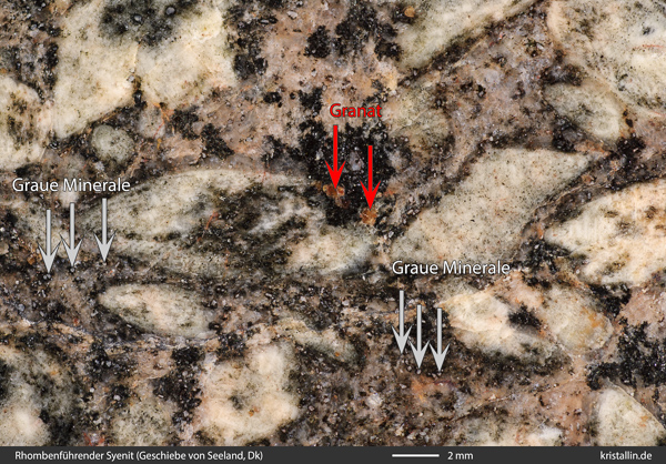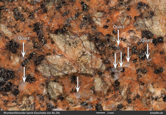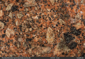 Hier ist die rötlich-braune Farbe auffällig, denn die meisten rhombenführenden Syenite sind eher grau und dunkler. Granat kommt hier nur spärlich vor, dafür ist etwas mehr Quarz enthalten, der als hellgraues Mineral leicht zu erkennen ist. Der Quarzgehalt ist aber so niedrig, dass auch dieses Stück ein Syenit ist.