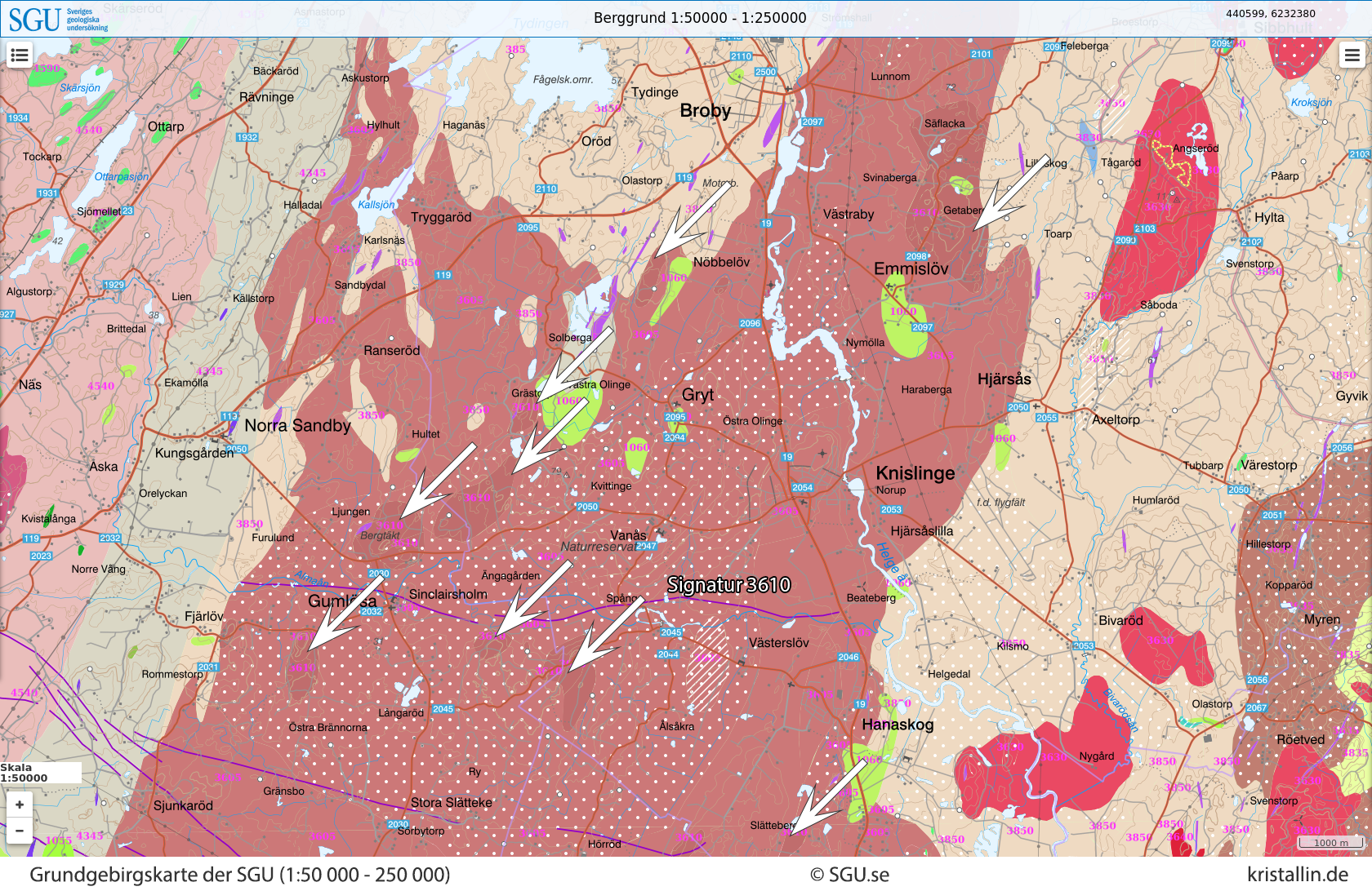 Informationen zum Gestein erhält man beim Klick in die Karte. Der ungefähre Gesteinstyp steht im ersten Eintrag unter „Bergart text“, in diesem Fall ist das „Syenitoid-granit“. Ganz unten findet man die Ziffer 3610 für den Gesteinstyp.