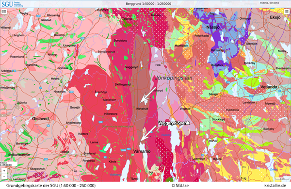 Der Vaggeryd-Syenit erstreckt sich über ca. 45 Kilometer als ein ausgeprägt längliches Vorkommen in N-S-Richtung. In der Karte ist das die braune Fläche in der Mitte. Die beiden Pfeile zeigen auf die Probenorte der folgenden Handstücke.