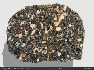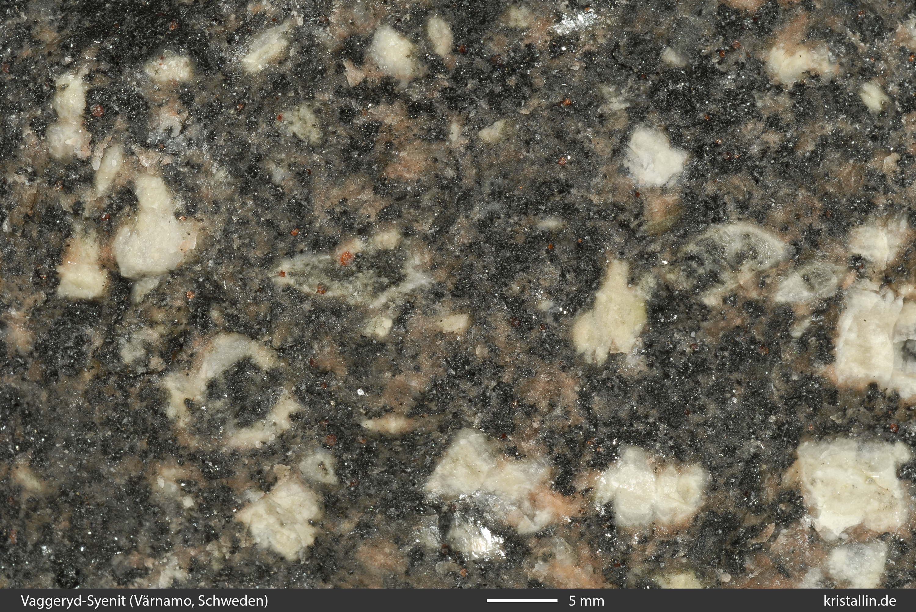 Aus dem weiter südlich gelegenen Steinbruch bei Värnamo kommen die folgenden beiden Proben. Dieser Vaggeryd-Syenit ist porphyrisch und enthält auch Granat.