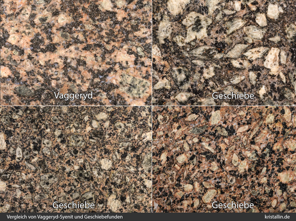 Damit ist der Vaggeryd-Syenit eine interessante Spur. Aber die Proben von Klevshult sind den Geschieben nicht ähnlich genug, wie das Vergleichsbild zeigt.