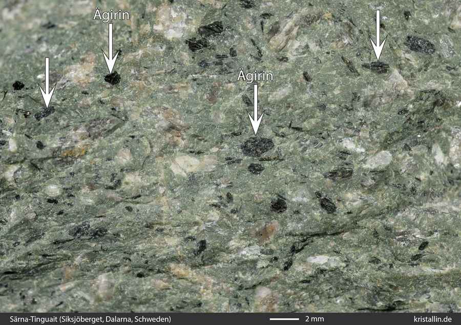 (7/30) Wenn die schwarzen Ägirinnadeln quer gebrochen sind, kann man den Kristallquerschnitt erkennen. (Bild ohne Pfeile)