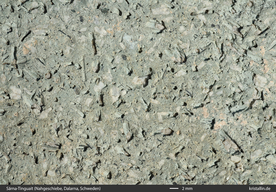 (25/30) Auch hier ist alles voller länglicher Löcher. Da saß mal der Nephelin. (Die kleinen Abschläge für den Salzsäuretest stammen von diesem Nahgeschiebe aus Schweden.)