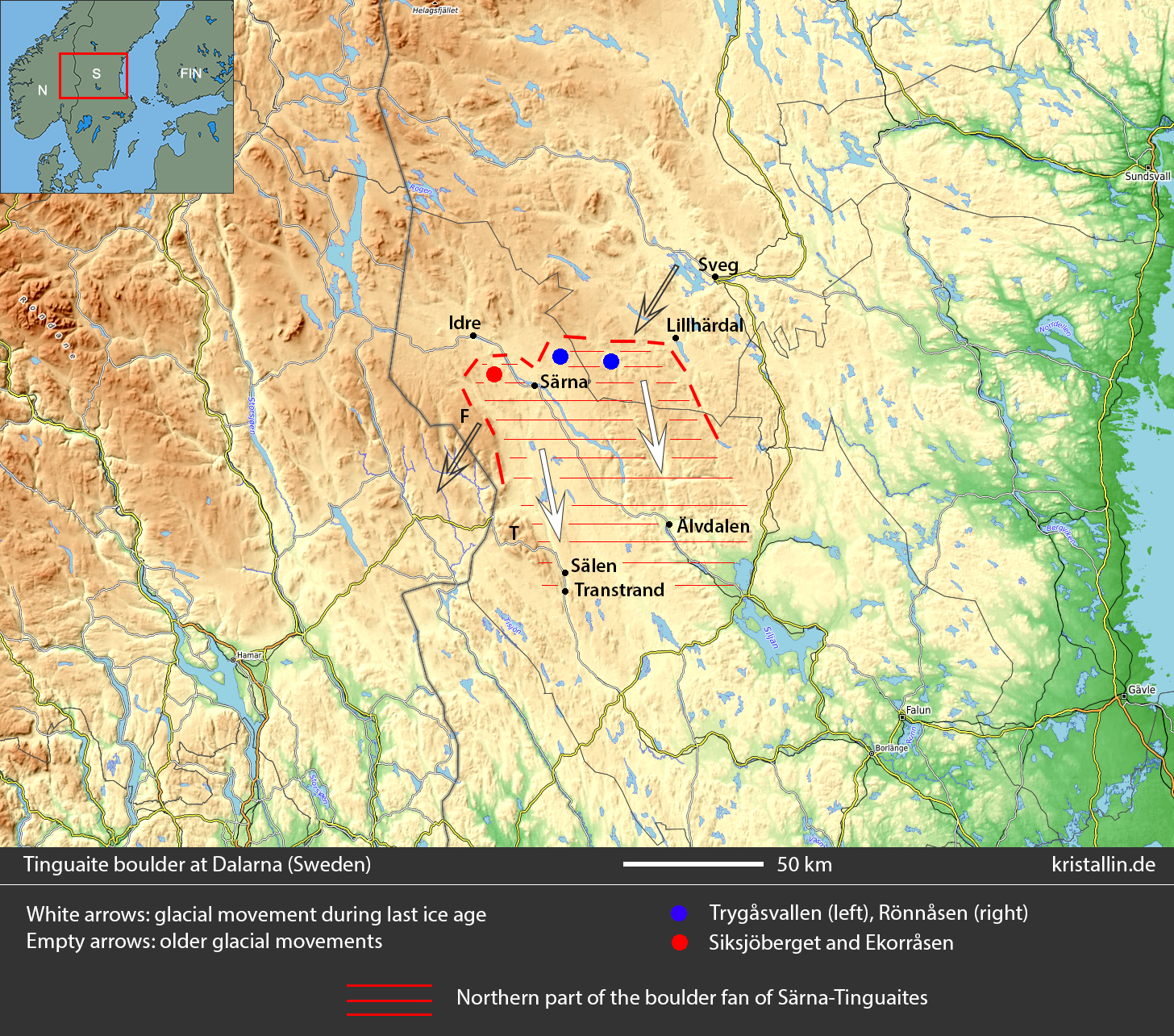 East of Fulufjället and along Västerdalälven the search is particularly useful, especially around Sälen and Transtrand. There you can find tinguaite erratics up to a height of several hundred metres above the valley floor.