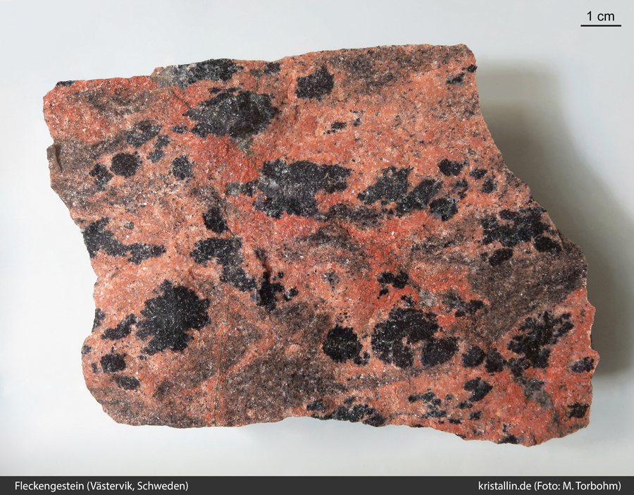 (10/55) Probe mit körniger Grundmasse. In der roten bis hellgrauen Grundmasse lassen sich stellenweise Quarz, Feldspat und Glimmer mit der Lupe klar unterscheiden. Die Flecken sind unregelmäßig verteilt und unterschiedlich groß. Loser Stein von einer Halde mit frischem Bauschutt südöstlich von Västervik (Lokalität 4, Pepparängsvägen).