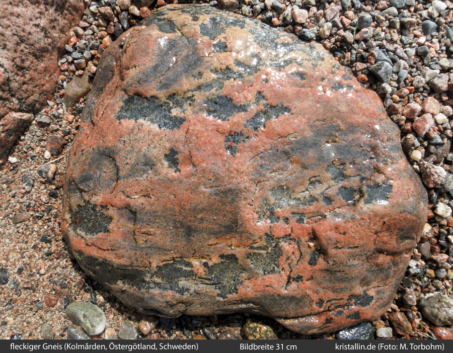 (29/55) Orangeroter Gneis mit sehr großen dunklen Flecken. Der Gesteinstyp ist im Gebiet von Kolmården häufig anzutreffen. Fundort: Strand des Campingplatzes in Kolmården.