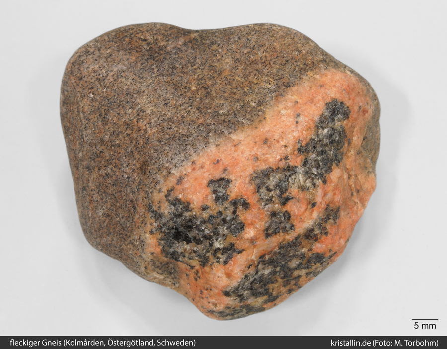 (34/55) Brauner, feinkörniger Gneis mit einer gröber kristallisierten Partie aus dunklen Flecken mit orangefarbenen Säumen.