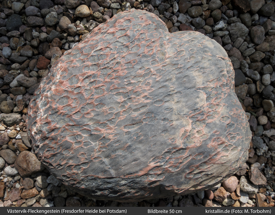 (43/55) Großes Västervik-Fleckengestein von etwa 40 cm Breite! Die dunklen Cordierit-Flecken verwittern leichter als die Saumzone und die Grundmasse, daher besitzen Kiesgrubenfunde manchmal eine Oberfläche mit löchrigen Vertiefungen. Fundort: Kiesgrube Fresdorfer Heide bei Potsdam; Sammlung G. Engelhardt.