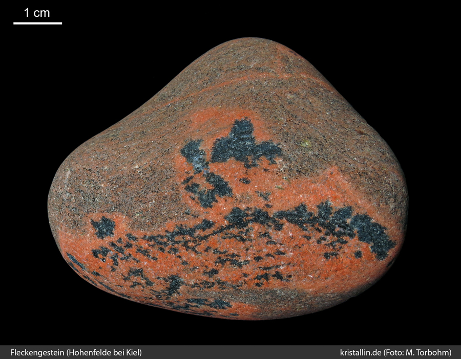 (54/55) Kein Leitgeschiebe sind solche Gneisgefüge mit diffusen Flecken oder Schlieren und roten bzw. farbigen Säumen. Der Fund ähnelt sowohl Fleckengneisen aus dem Gebiet von Kolmården (z. B. Abb. 35) als auch dem Västervik-„Fleckengneis“ in Abb. 13. Bläuliche Partien innerhalb der schwarzen Flecken dürften Cordierit sein.