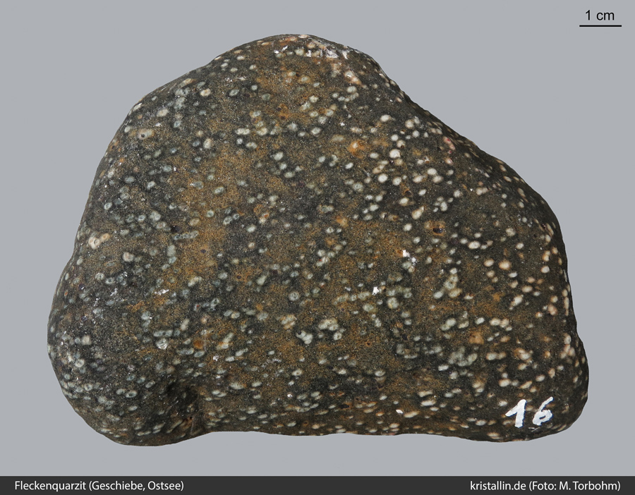 (1/34) Typischer grauer Fleckenquarzit. Die gelbgrüne Färbung in den Vertiefungen ist der Verwitterung geschuldet.