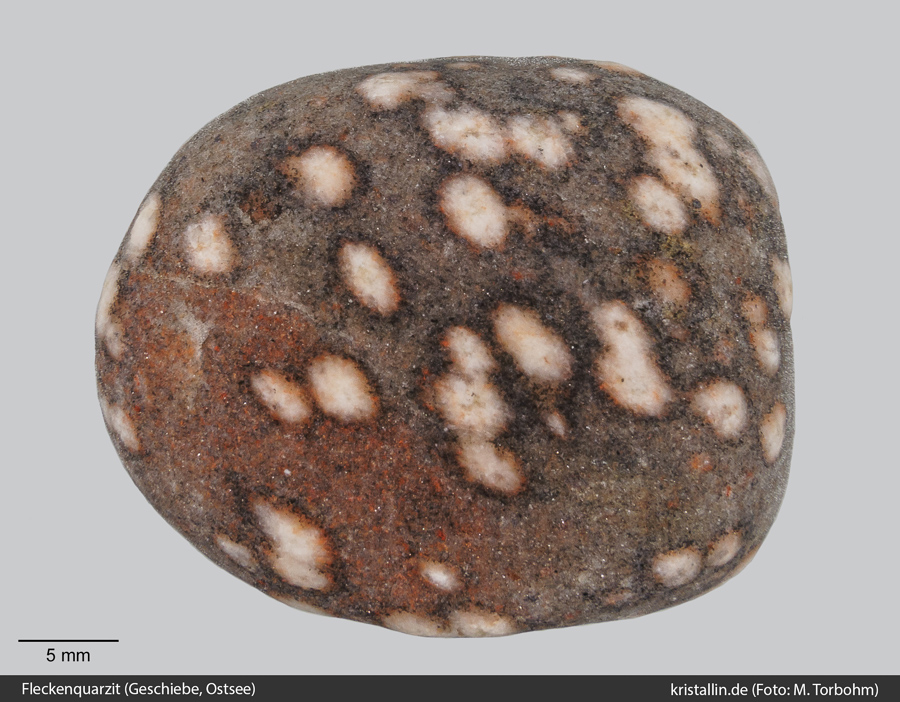 (5/34) Kleines Fleckenquarzit-Geschiebe (Västervik-Typ) mit grauer, örtlich etwas rötlich verfärbter Grundmasse aus Quarz und Biotit, weiße Flecken mit dunklen, biotitreichen Säumen. Fundort: Møns Klint/DK.