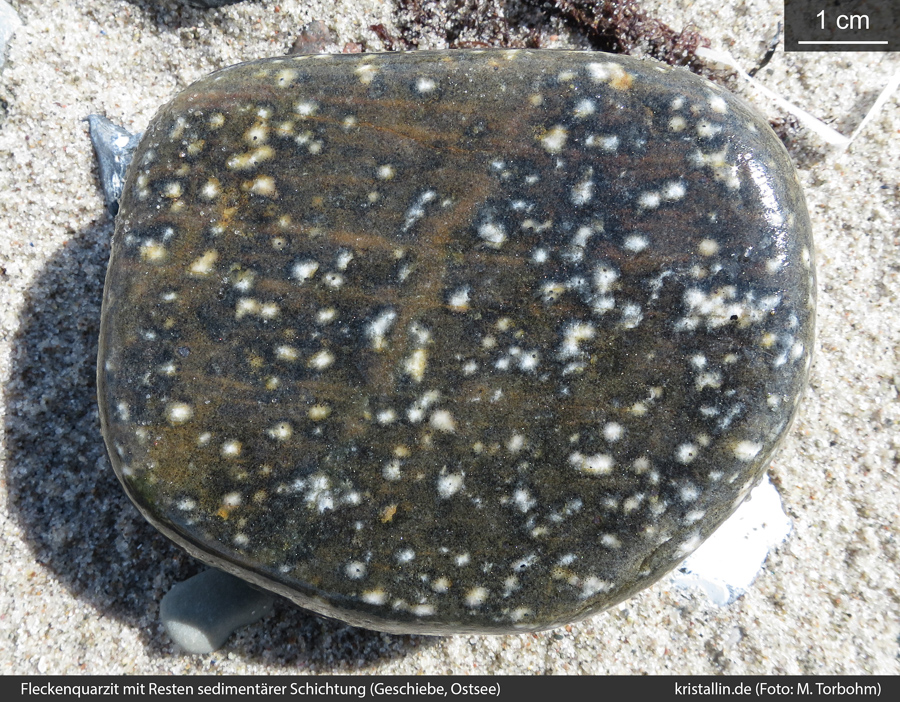 (7/34) Dunkelgrauer Fleckenquarzit mit grünlichen Anteilen und reliktischer sedimentärer Schichtung (waagerechte Streifung). Strandgeröll von Fehmarn.