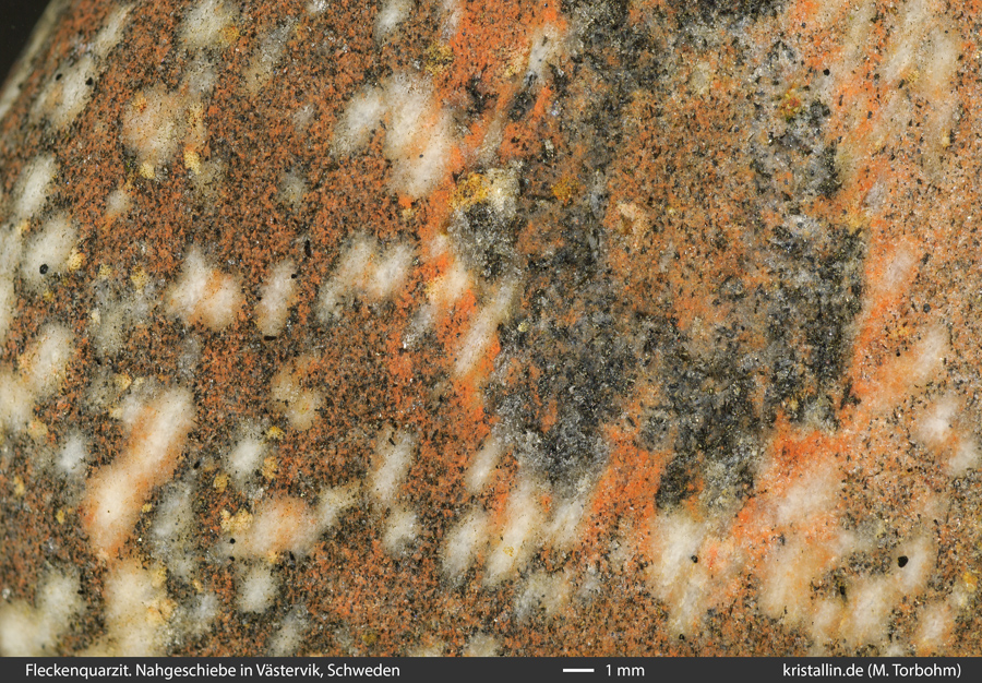 (16/34) Die weißen Flecke besitzen keine Säume und sind durch leichte tektonische Deformation ausgelängt. Da die Glimmerminerale in der Grundmasse nur teilweise eine Vorzugrichtung zeigen, dürfte die Deformation nur schwach gewesen sein. Der große, schwarze Fleck enthält neben Biotit auch bläulich-grauen Cordierit.