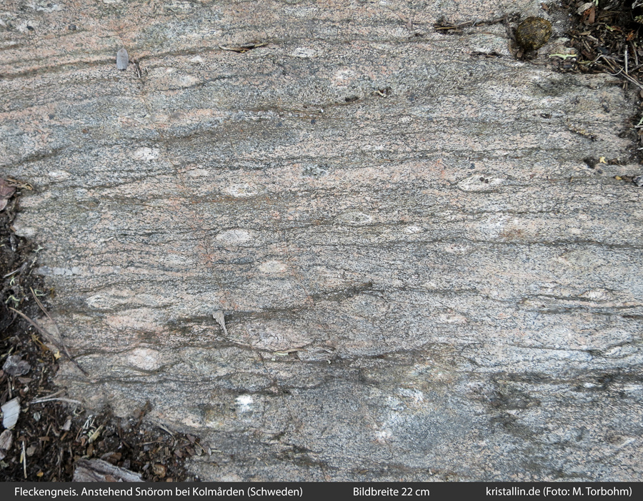 (34/34) Anstehender Quarz-Feldspat-Biotit-Gneis mit weißen, elliptischen Flecken bis 2 cm Länge von Snörom bei Kolmården. (Lokalität 6), Bildbreite 22 cm.