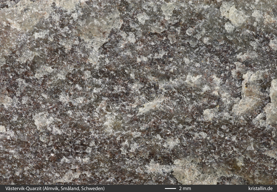 (3/26) Die Nahaufnahme der Bruchfläche zeigt das quarzittypische Gefüge, in dem keine einzelnen Quarzkörner mehr erkennbar sind und der Bruch quer durch das Gefüge geht.