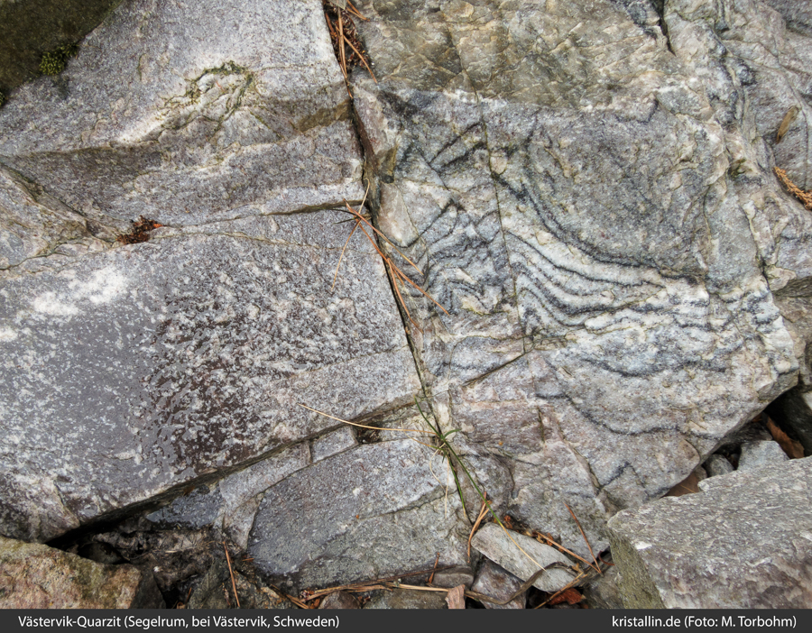 (14/26) Hellgrauer Västervik-Quarzit mit gefalteten Sedimentstrukturen, die durch Bruchtektonik gegeneinander verstellt wurden.