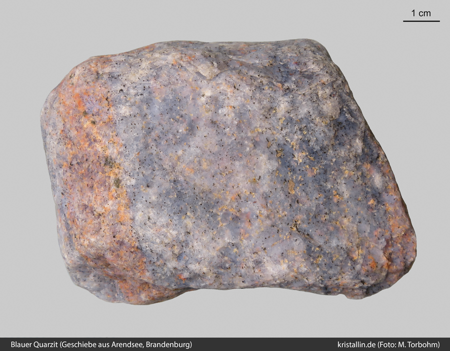(25/26) Blauer Quarzit mit hellrotem Feldspat und Glimmer. (Aufnahme unter Wasser) Der Geschiebefund zeigt eine weitgehende Übereinstimmung mit der Anstehendprobe (voriges Bild).