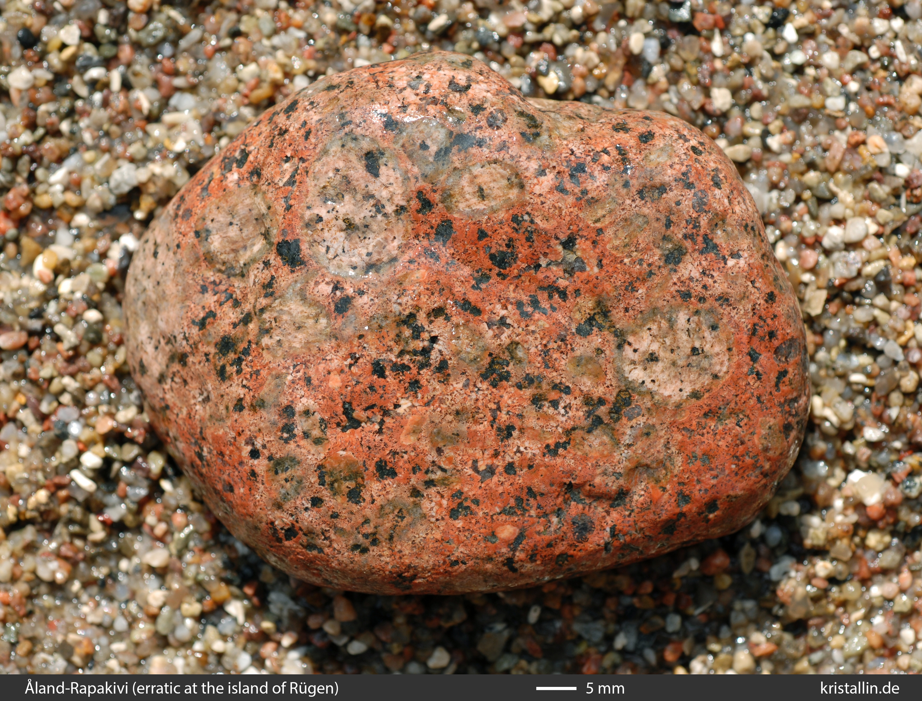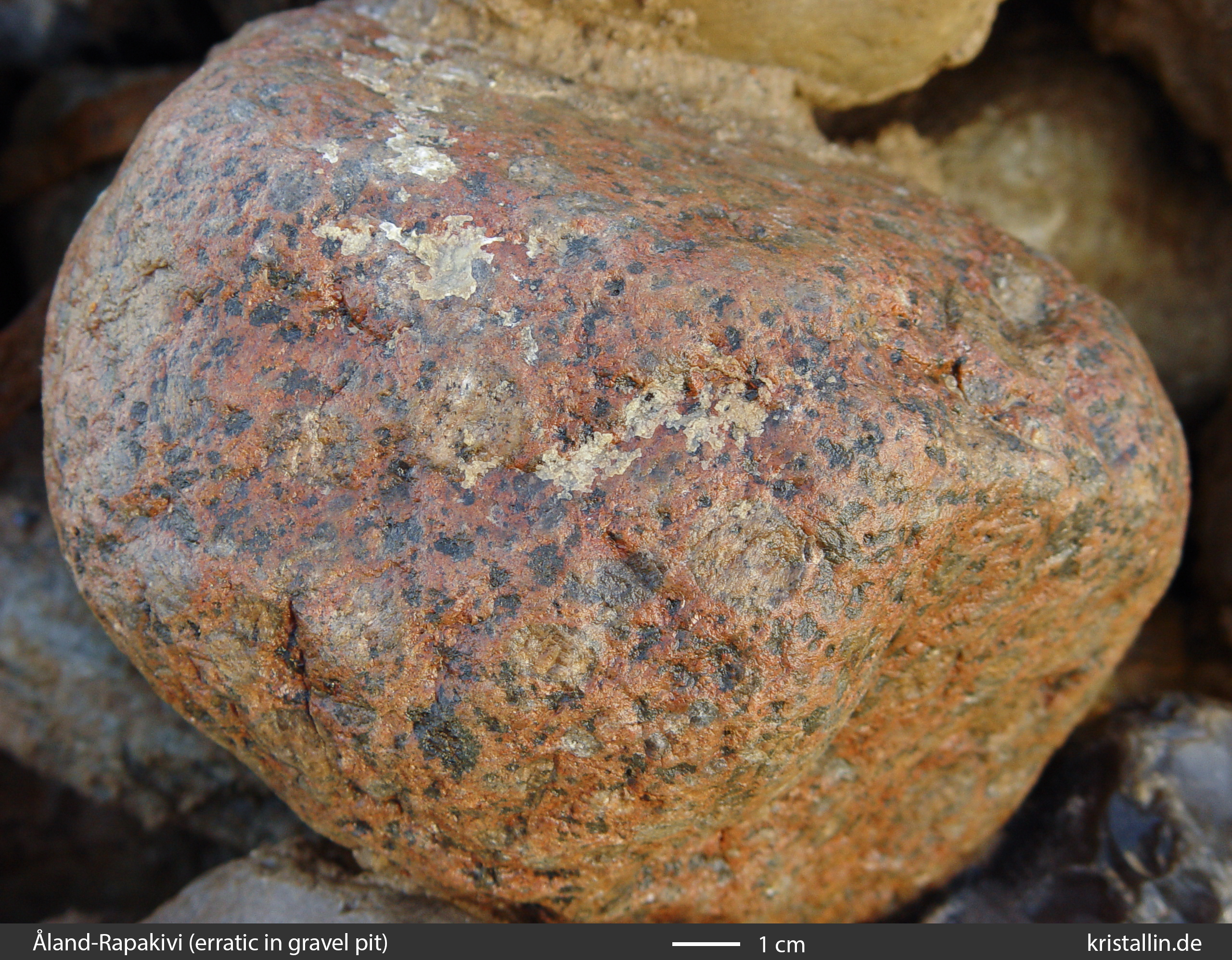 In northern Germany rapakivis can be found as erratics. This is because of several ice ages that transported rocks from Scandinavia to the south. Rapakivis can be found at the edge of fields, in gravel pits, on the beaches of the Baltic Sea and in old cobblestones. The vast majority of these rapakivis are from Åland, a group of islands in the southwest of Finland.