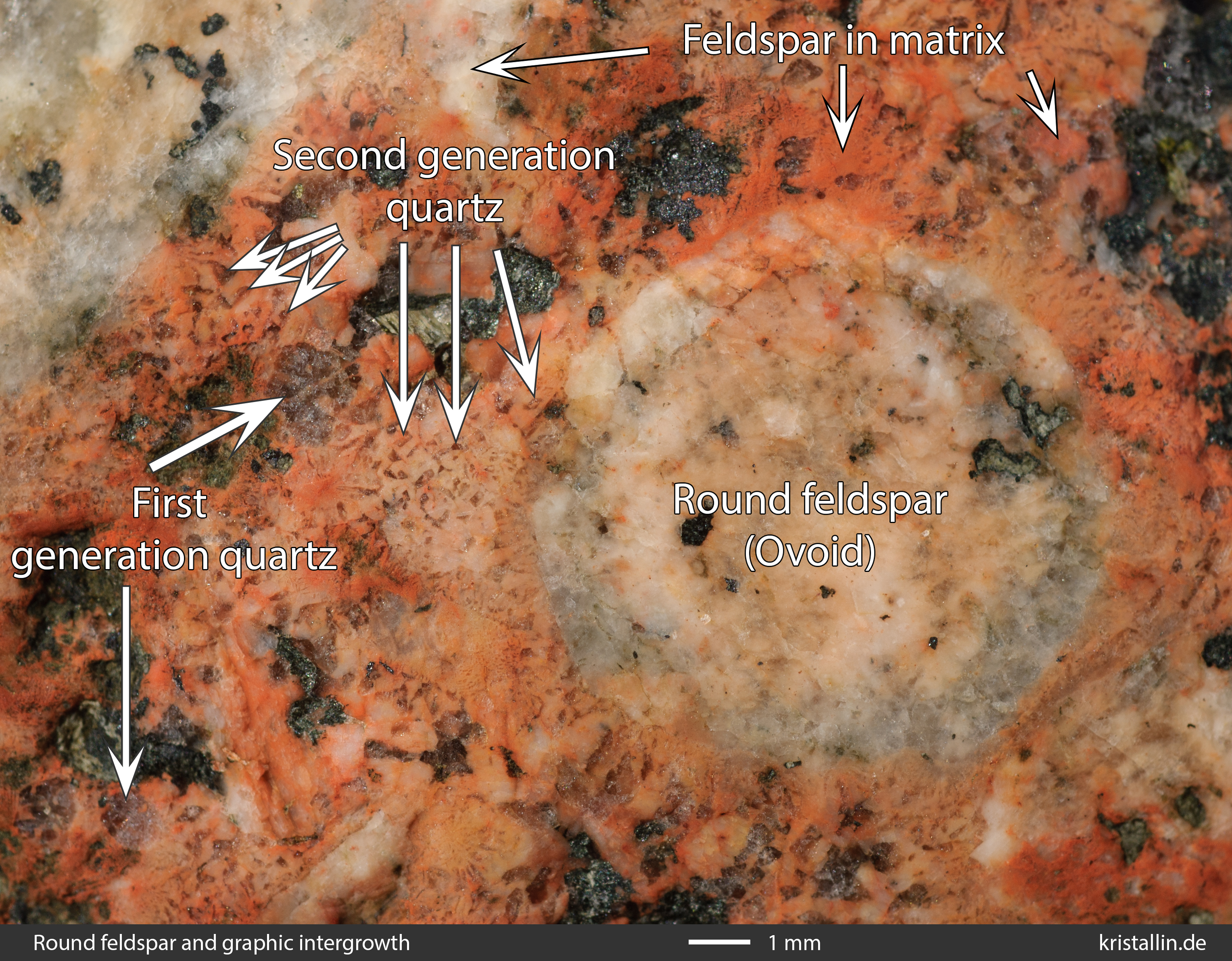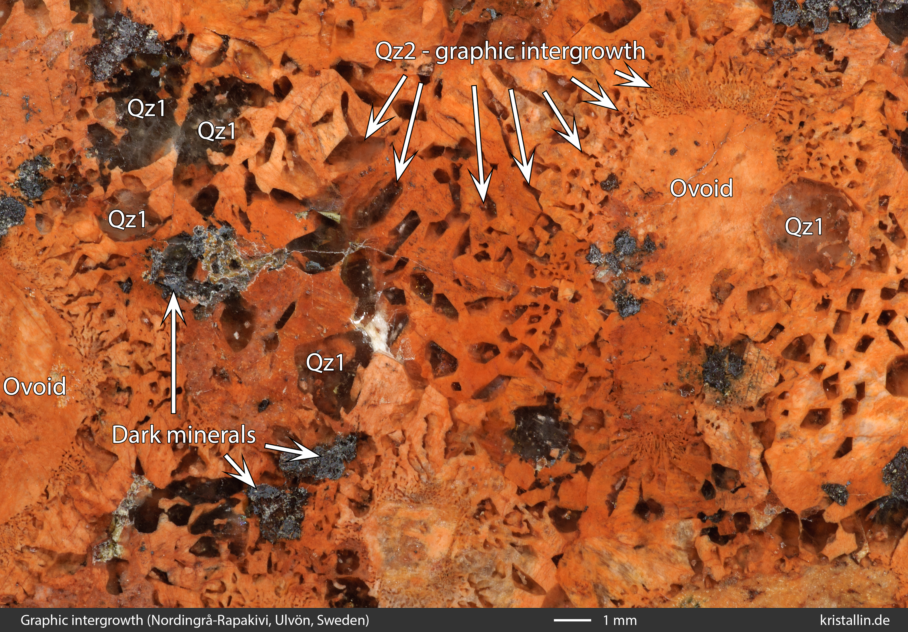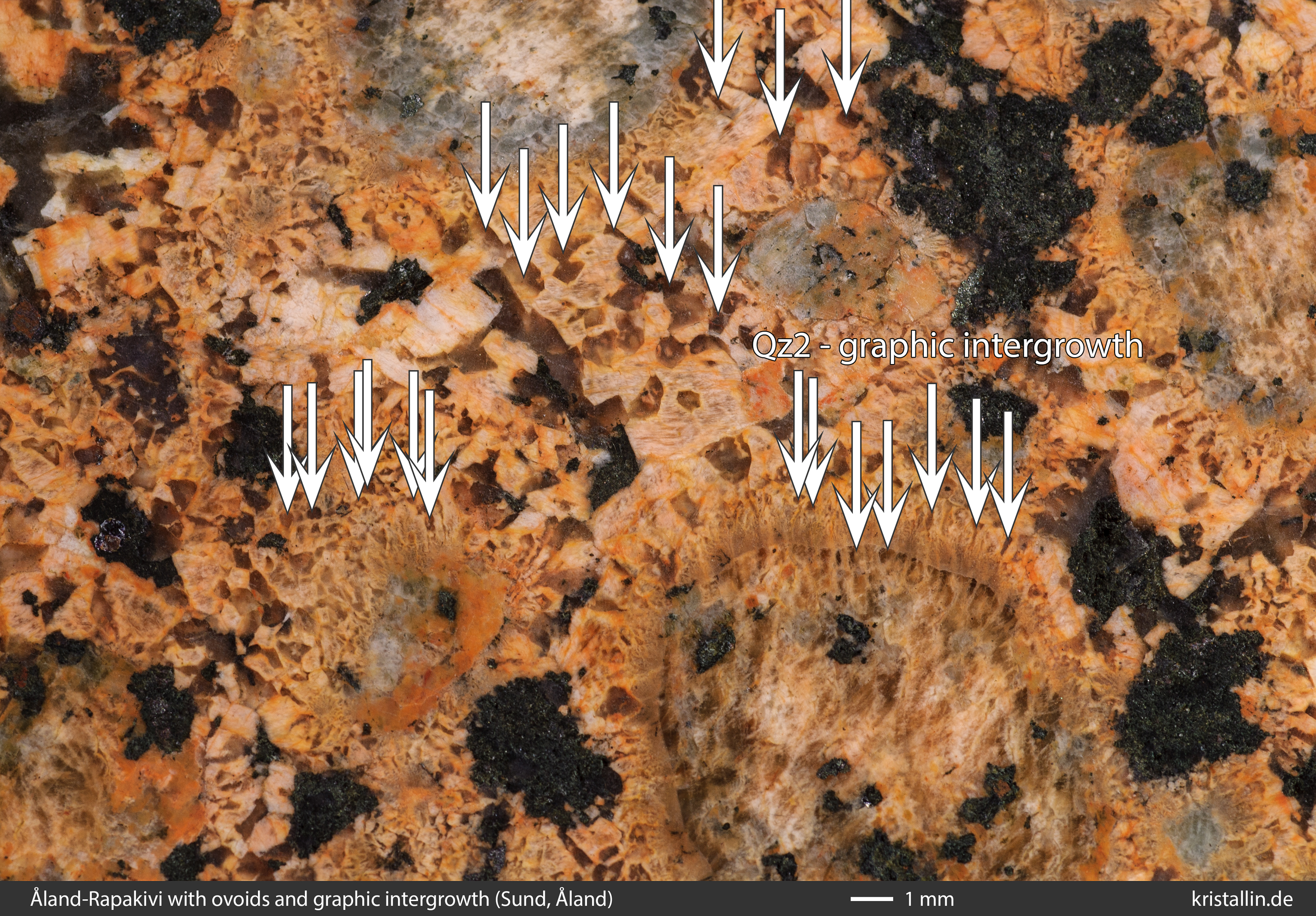 (There are also graphic intergrowths in other rocks, albeit rarely. They are only a clear sign of a Rapakivi together with round alkali feldspars and the round quartz of the first generation).