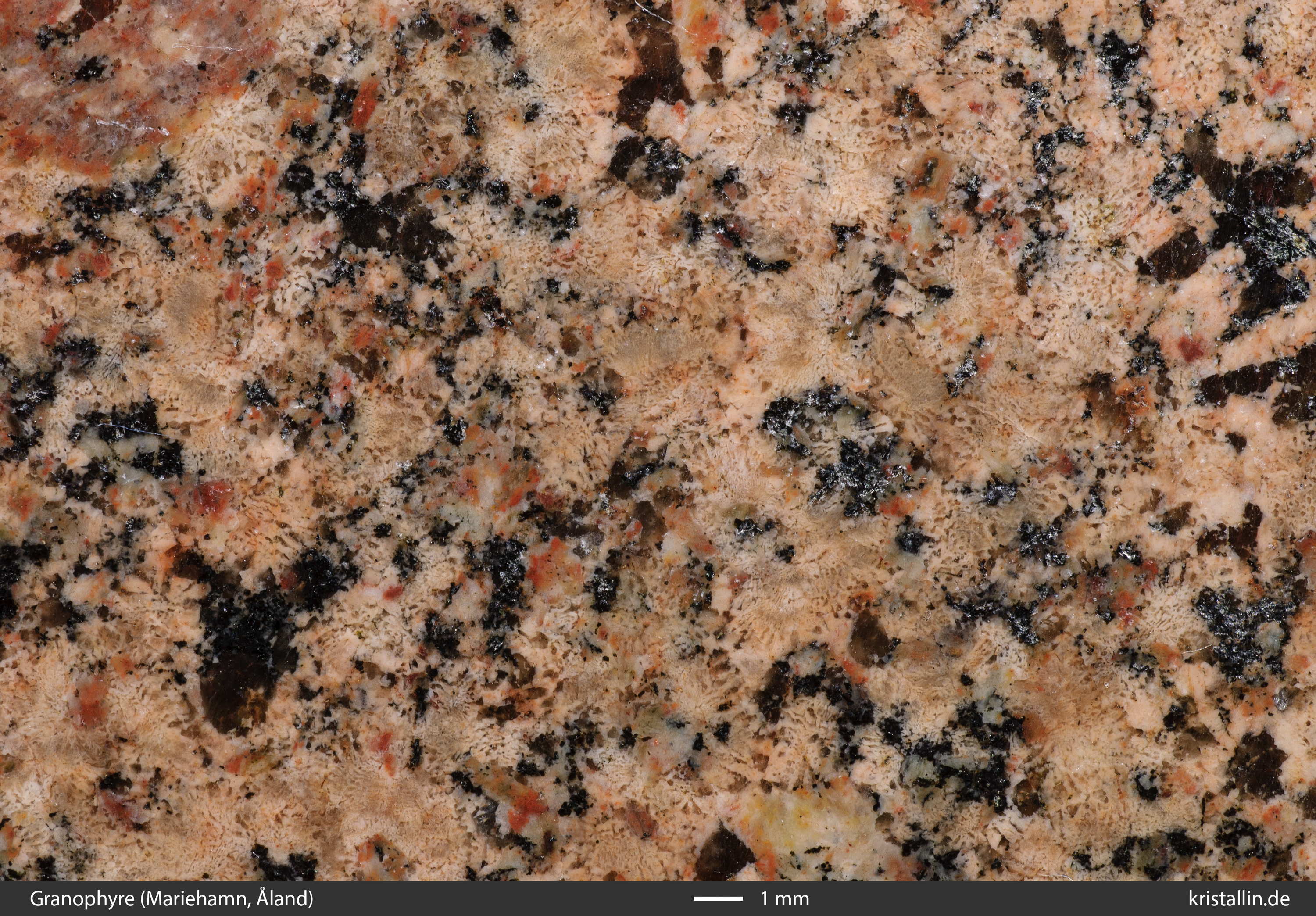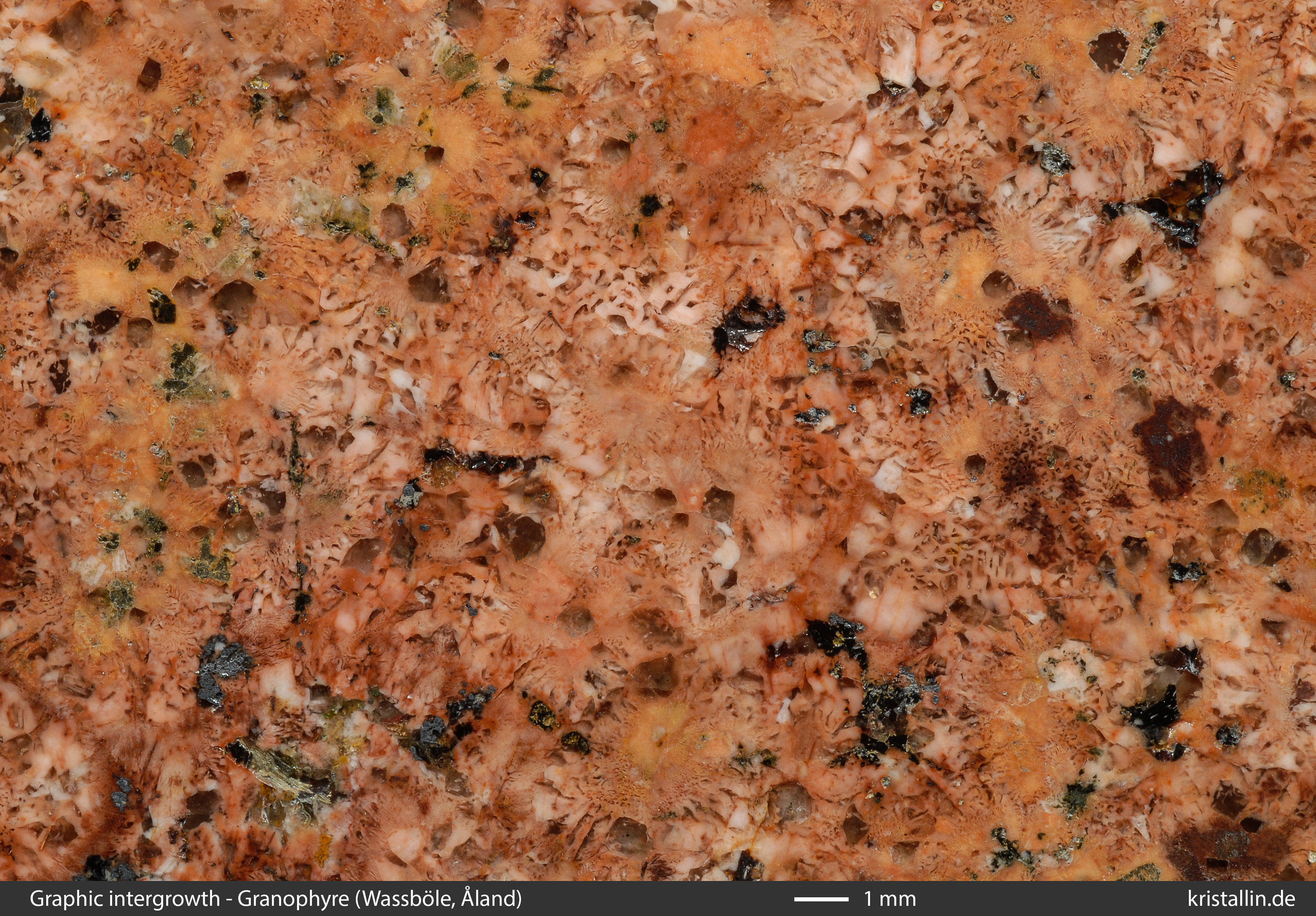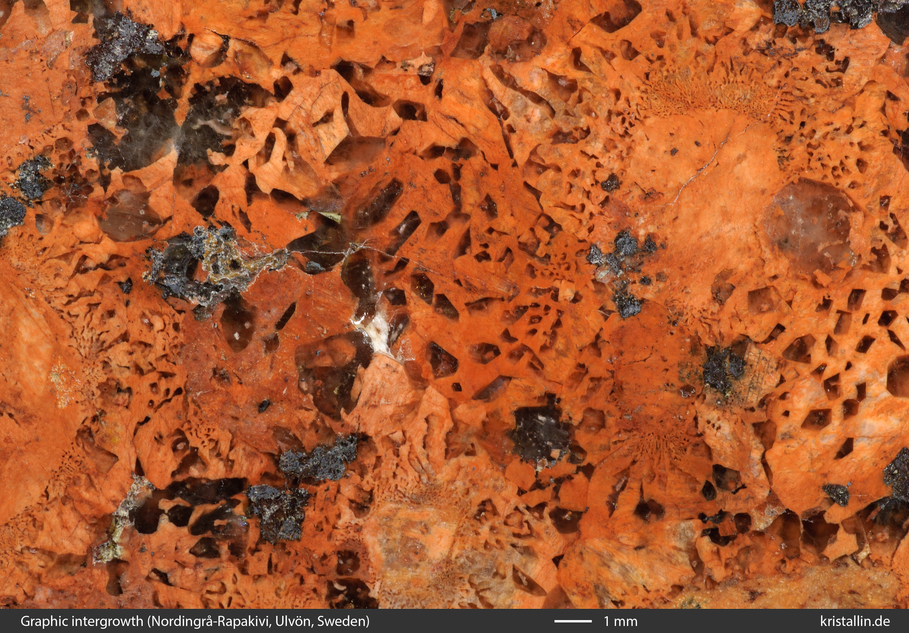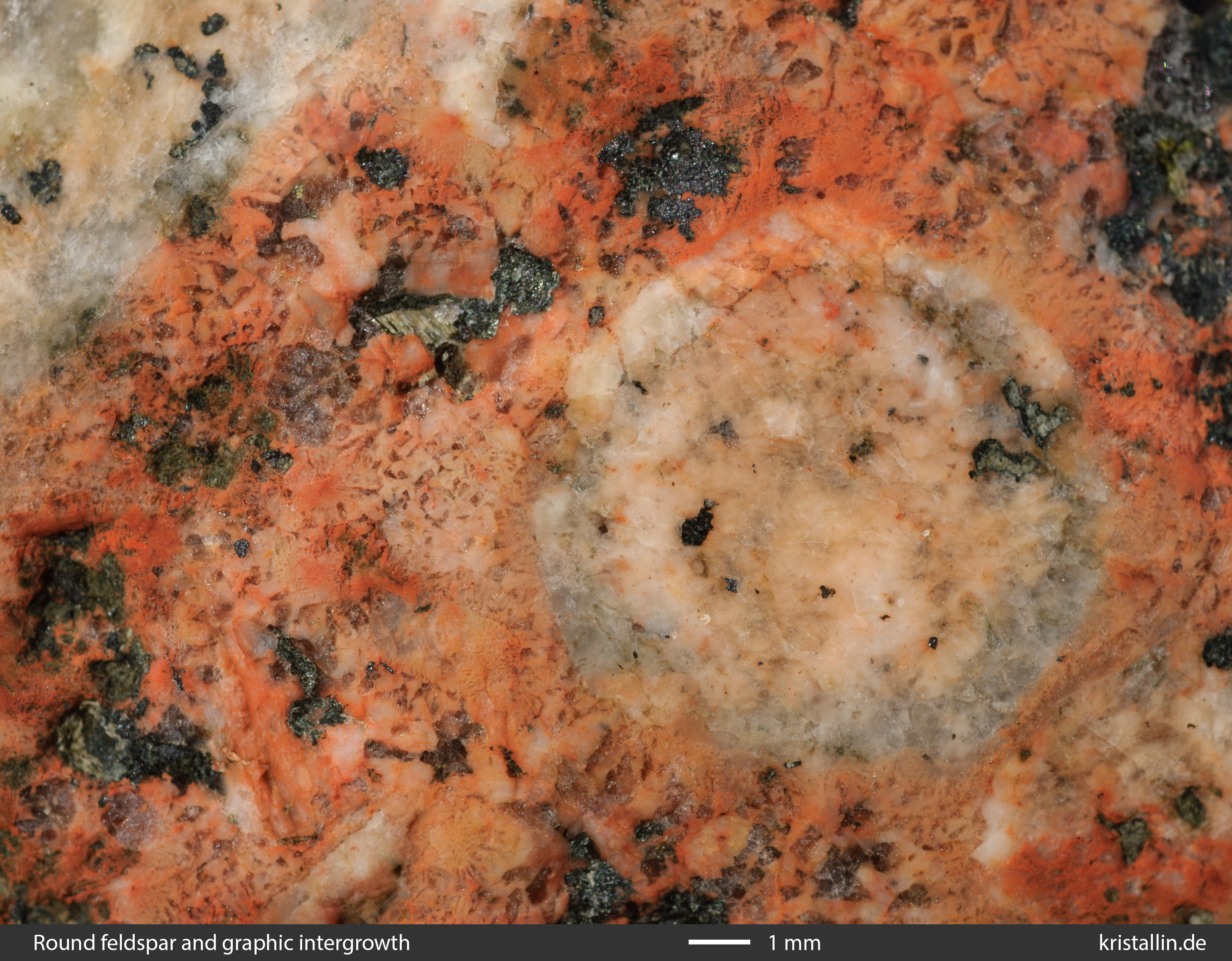 (There are also graphic intergrowths in other rocks, albeit rarely. They are only a clear sign of a Rapakivi together with round alkali feldspars and the round quartz of the first generation).