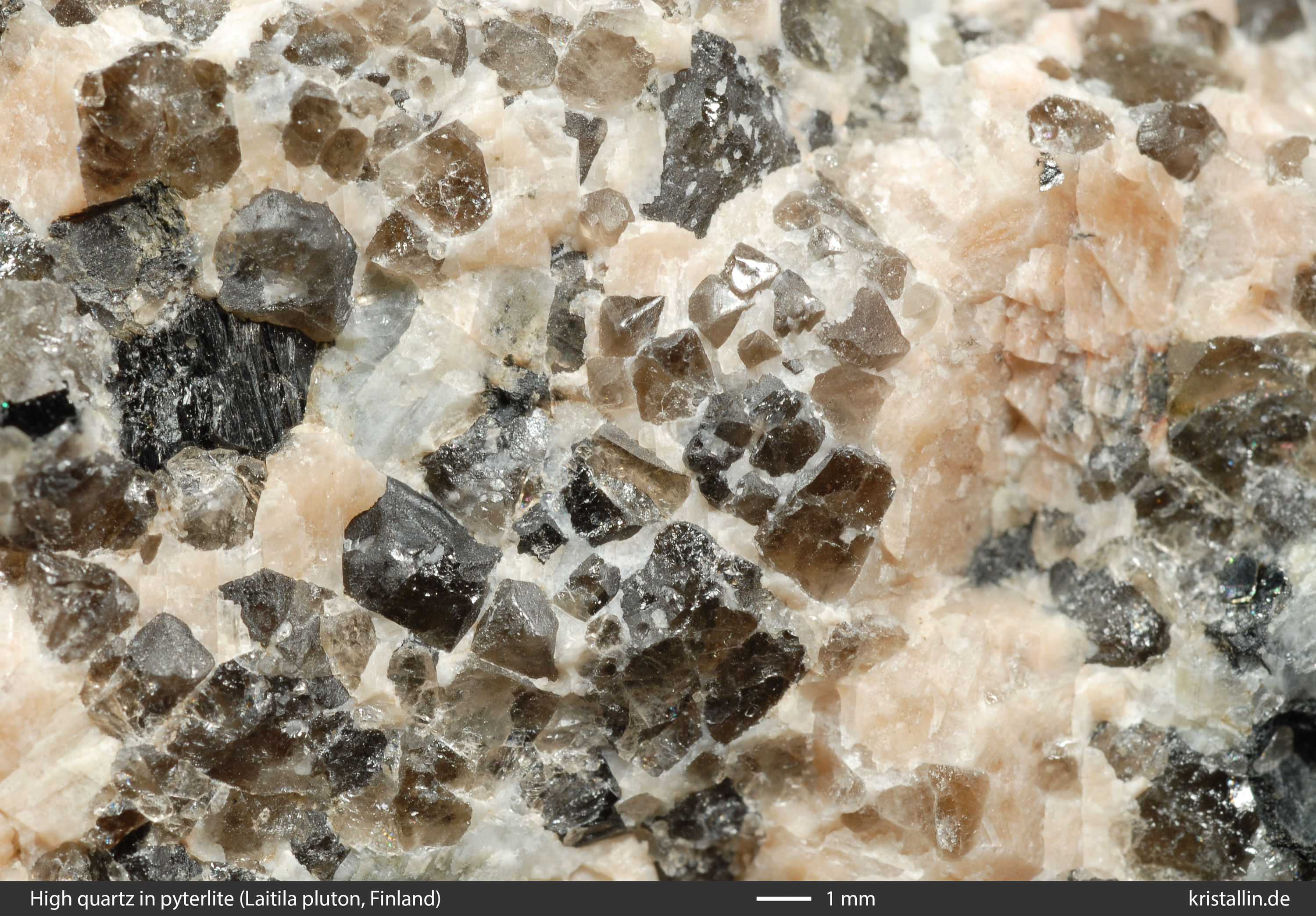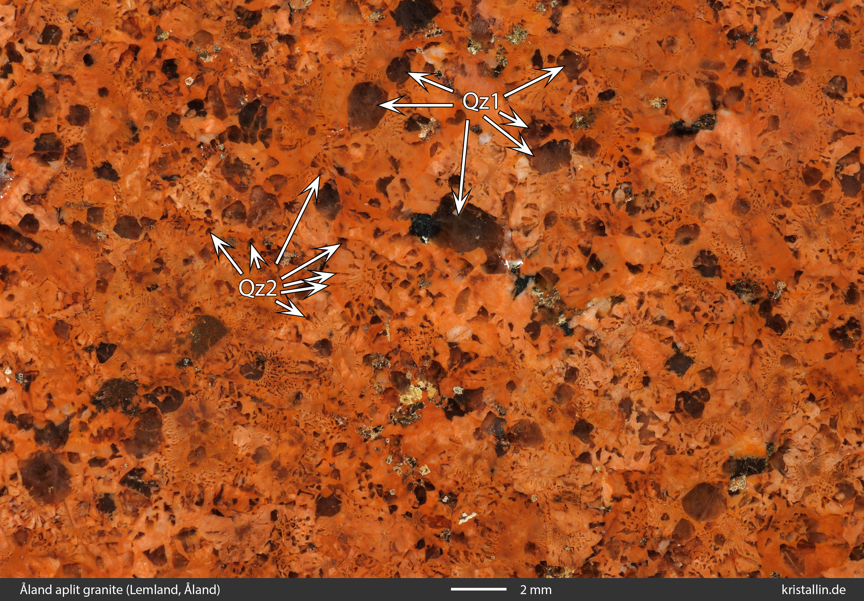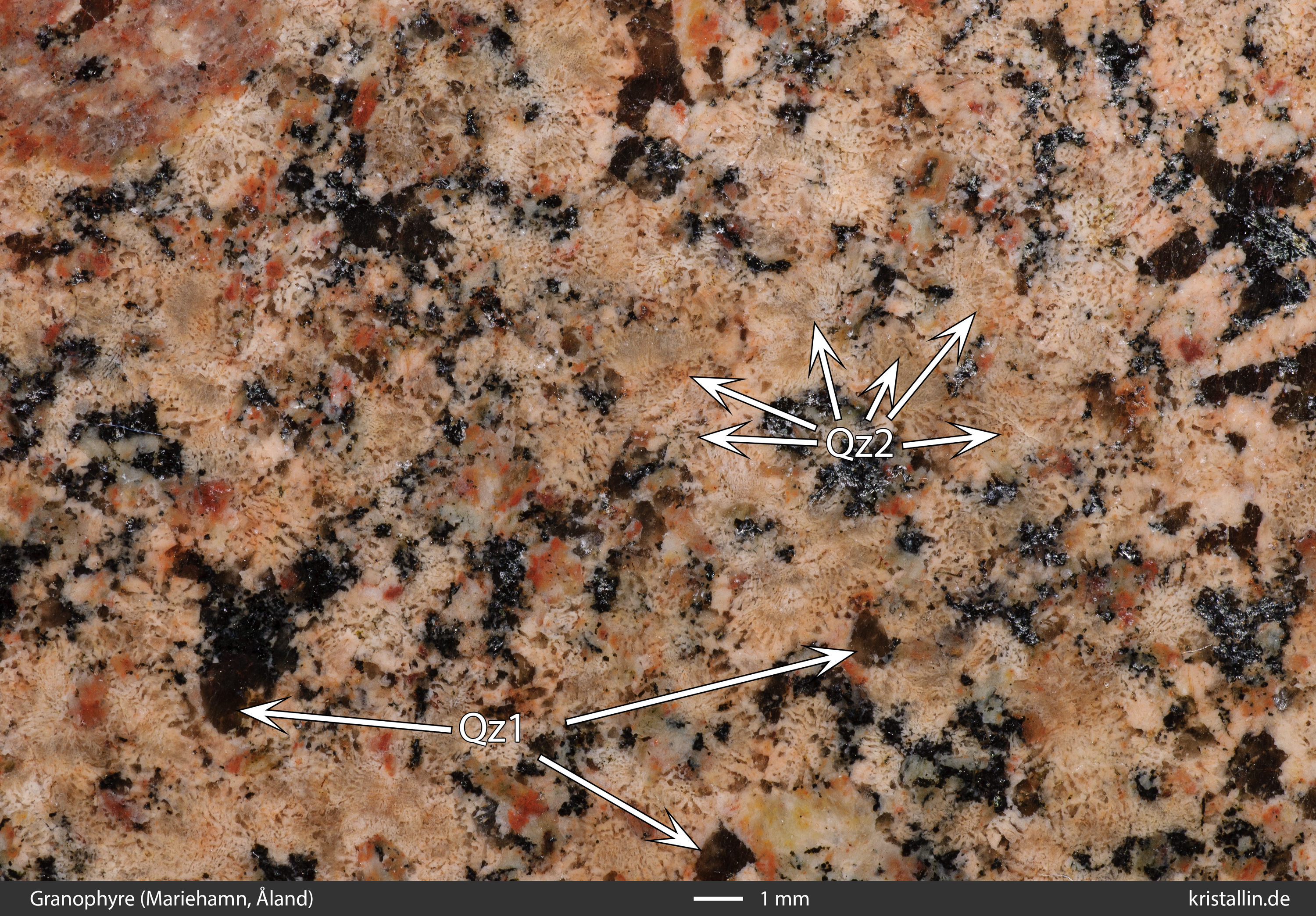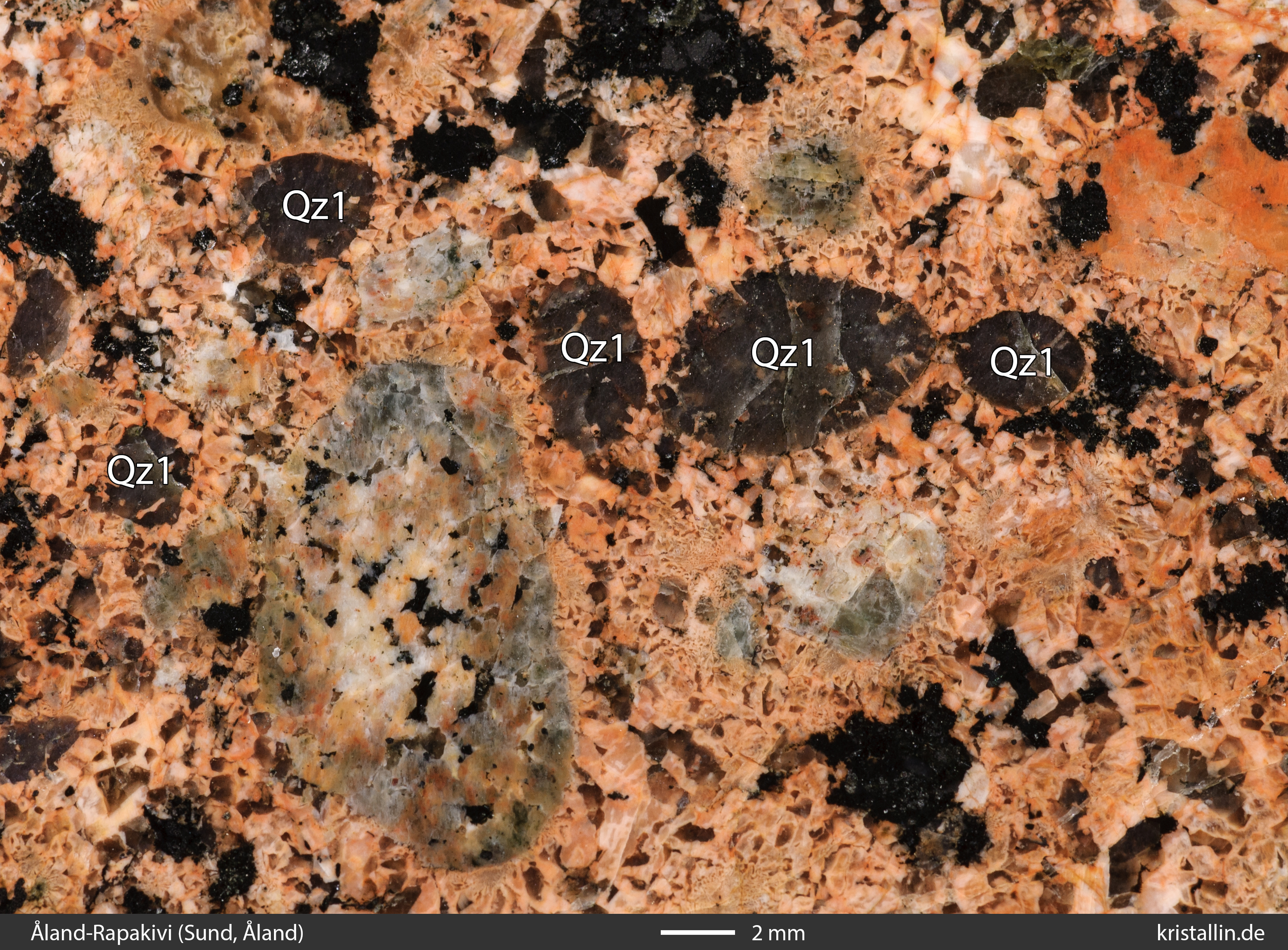 All rapakivis with round feldspars contain two generations of quartz. The older quartz is the first generation and is visible to the naked eye. These quartz are always roundish and their rim looks embayed.