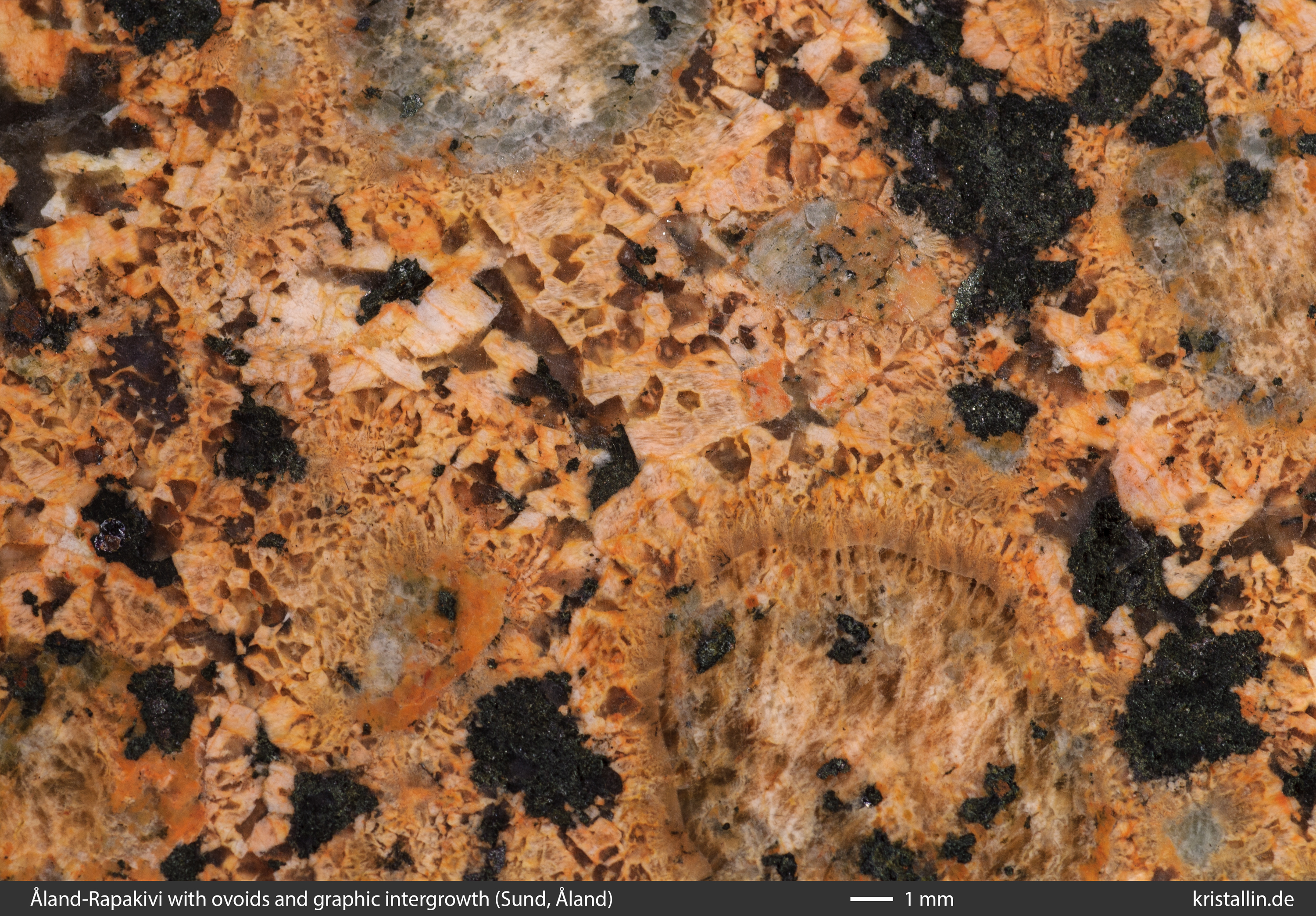 Graphic intergrowths are mainly found in the wiborgites, i.e. the rapakivis with rimmed ovoids. In the pyterlites, the quartz looks slightly different.