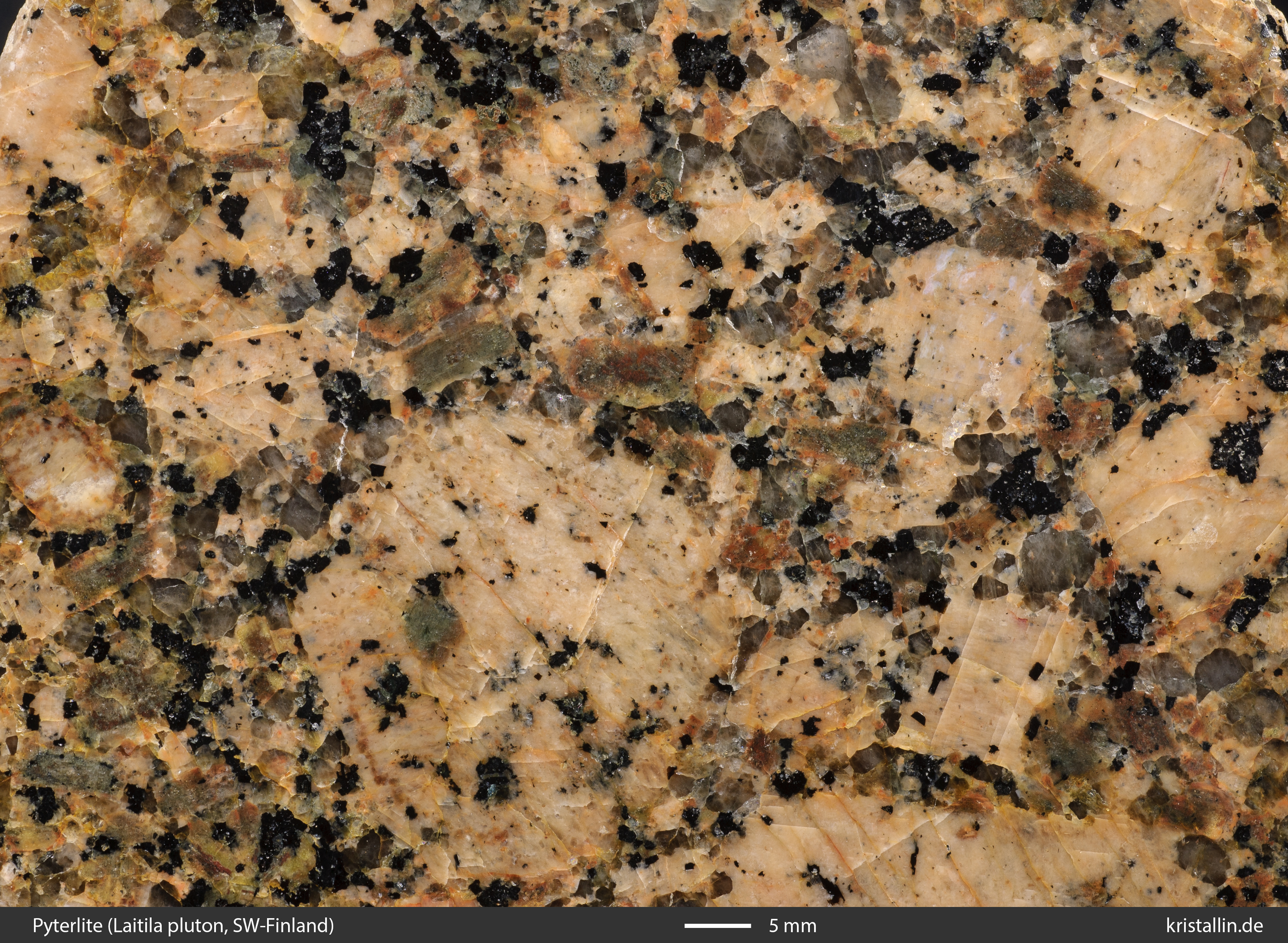 The two specimens (14/15) are from the Vehmaa-Laitila-Pluton in SW-Finland. They are quite typical pyterlites for this region.