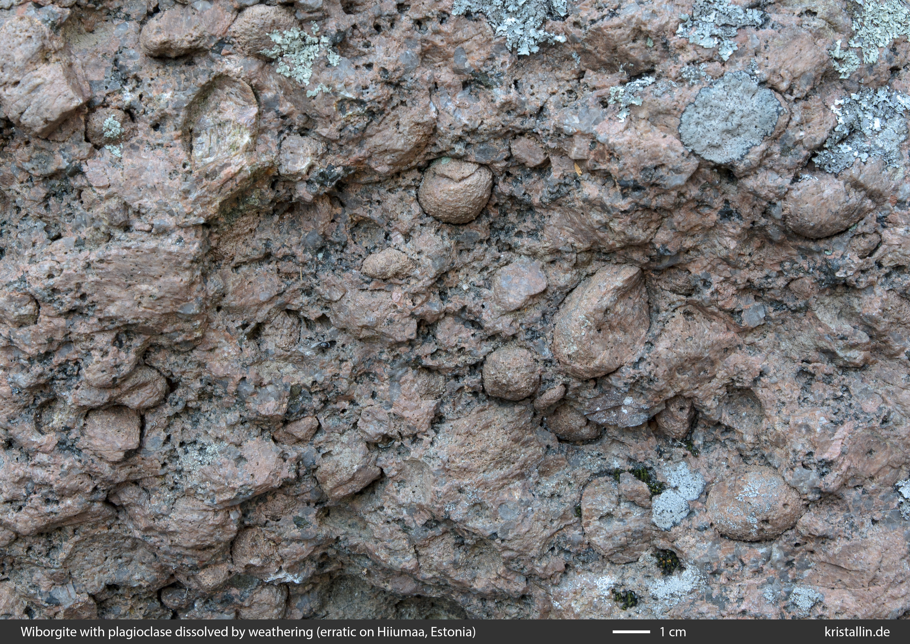 Rapakivis with round feldspars (ovoids) come in two varieties. In one, most ovoids have a rim of plagioclase. This granite is called "wiborgite", derived from the town of Wiborg ("Выборг"), which is now in Russia.