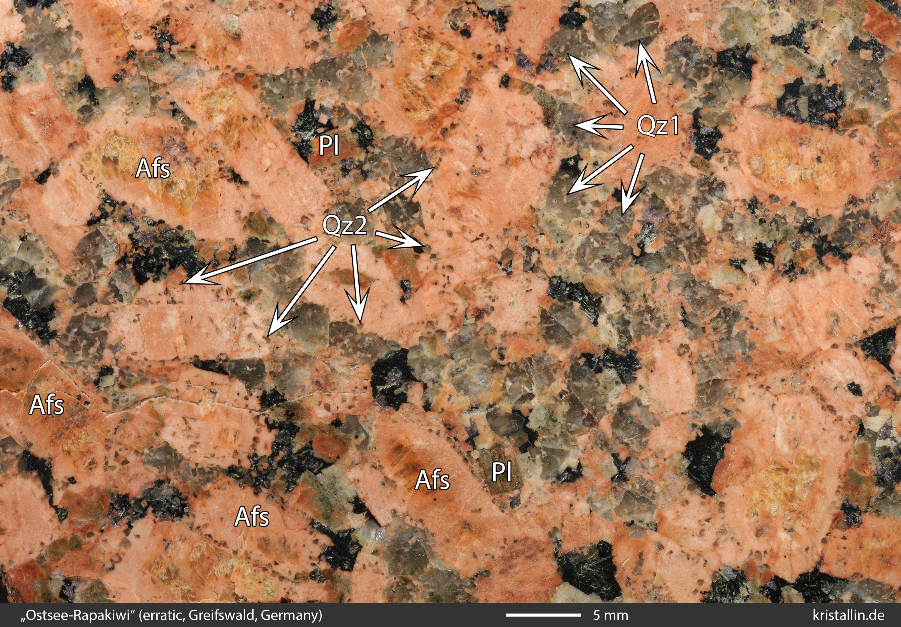 A nice example of a porphyritic rapakivi with two generations of quartz is the "Ostsee-Rapakiwi" (erratic near Greifswald, Germany). It always contains a lot of corroded quartz and a lot of small quartz lined up on the outside of the feldspar.
