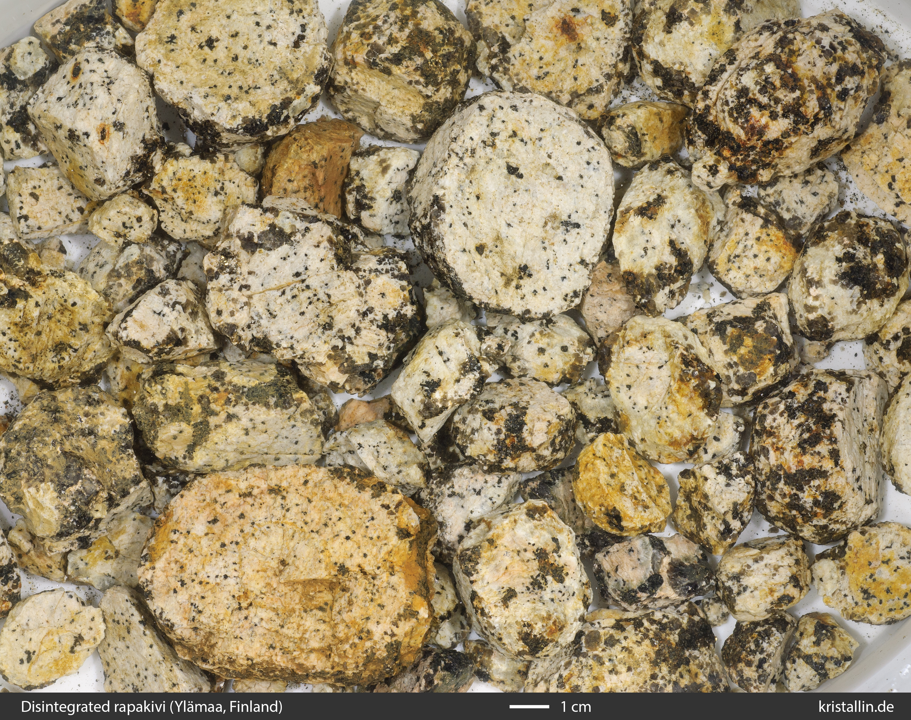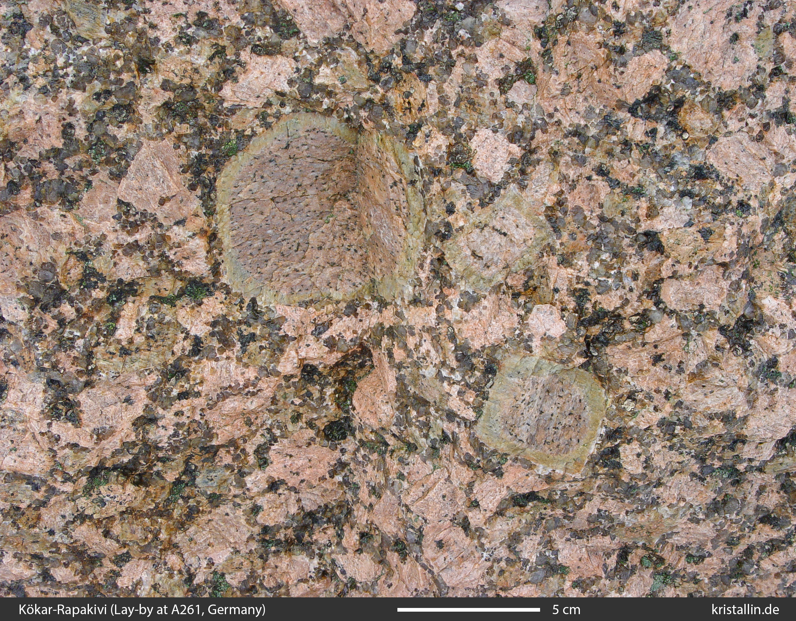 The name-giving decomposition ("rapa kivi") occurs mainly in coarse-grained wiborgite or pyterlite. Long ago, this observation led to a granite with round feldspars being generally referred to as "Rapakivi" in Finland. This is problematic for geologists because these textures gradually change into textures without ovoids.