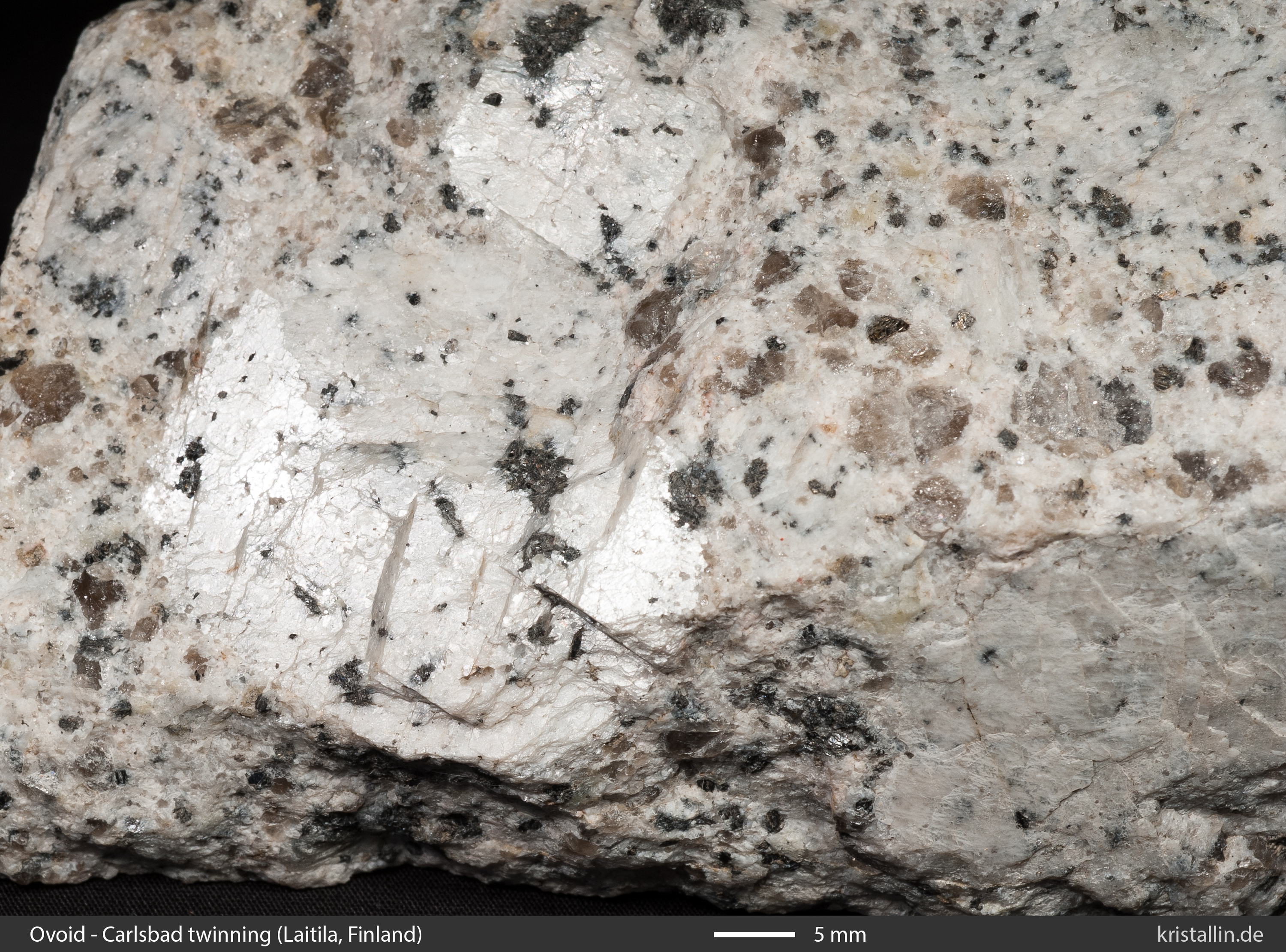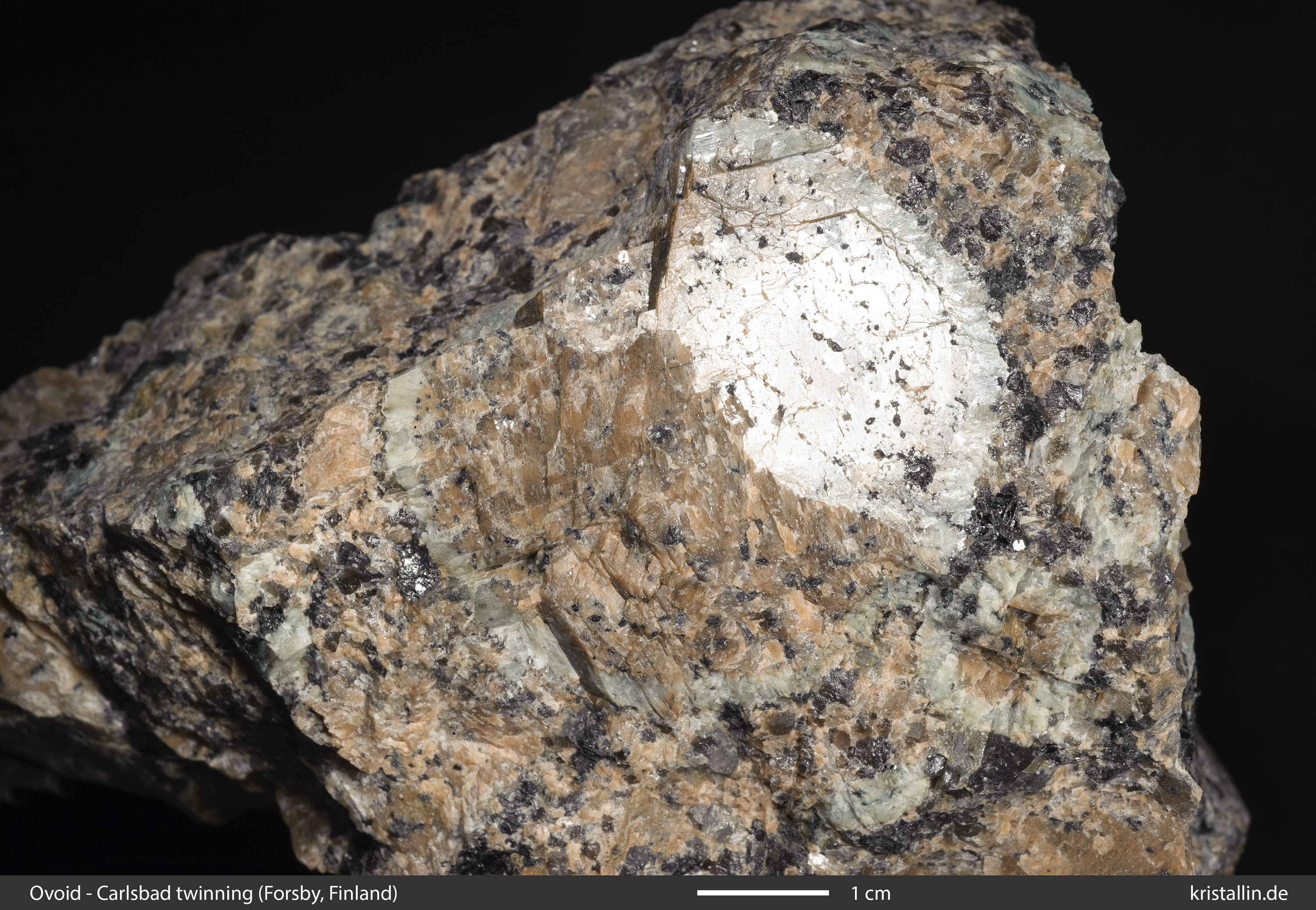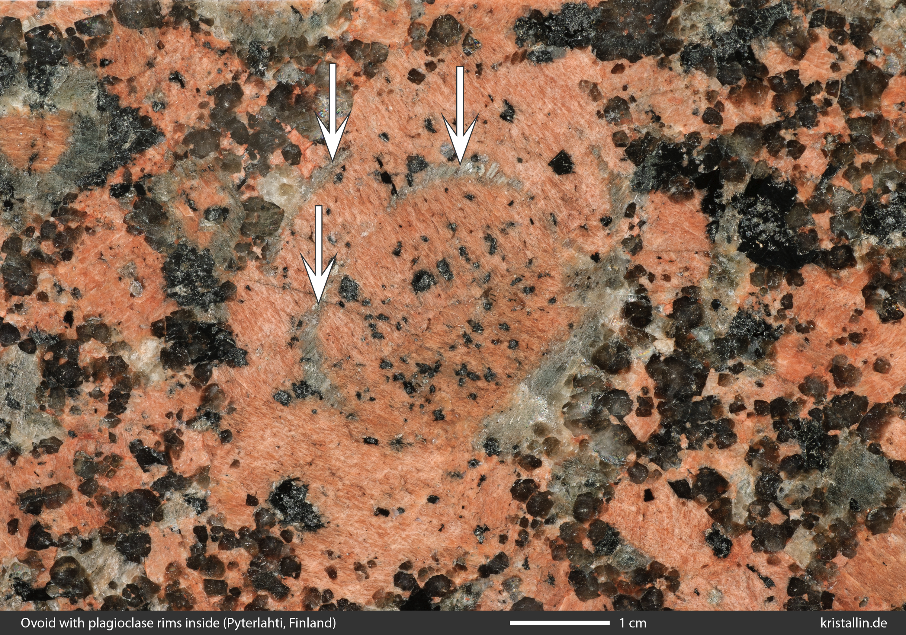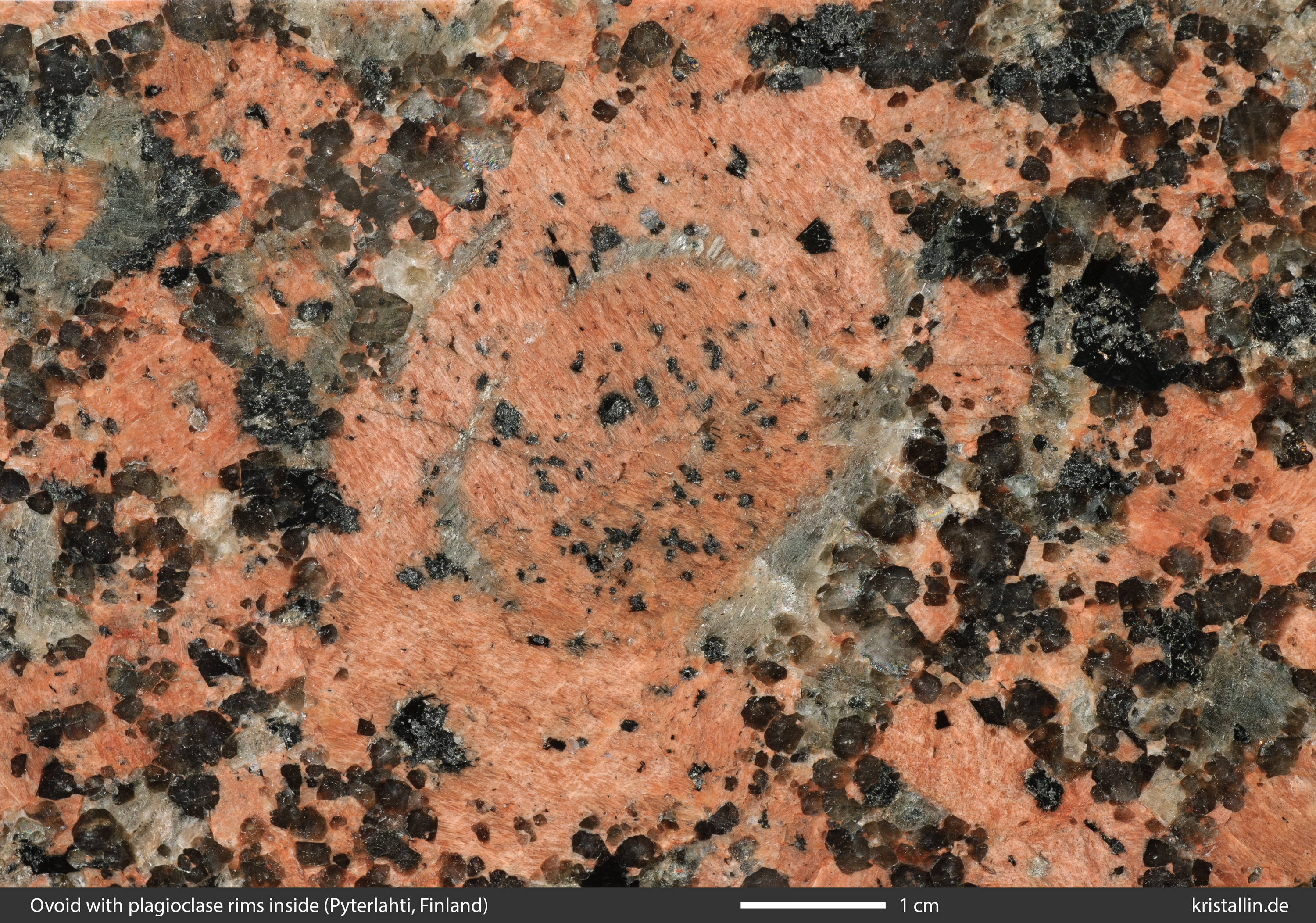 The rim around the ovoids is always plagioclase, while the core is always an alkali feldspar (orthoclase). The core is usually a single crystal, sometimes Carlsbad twins.