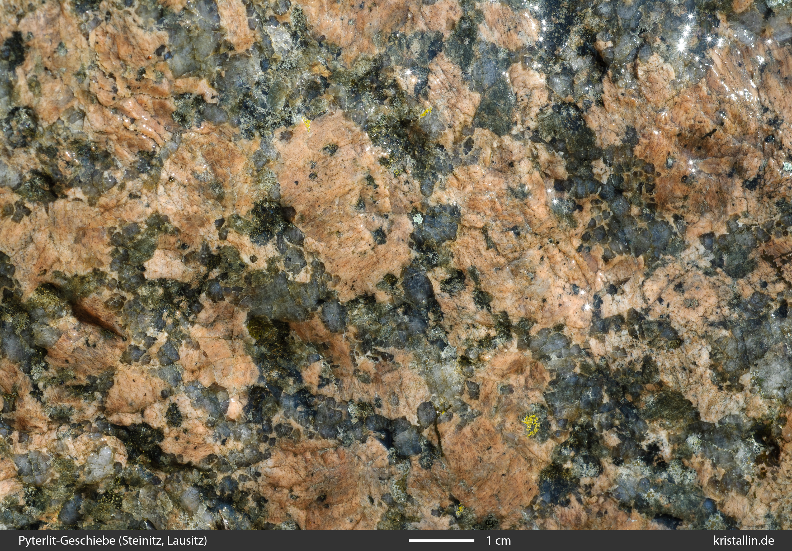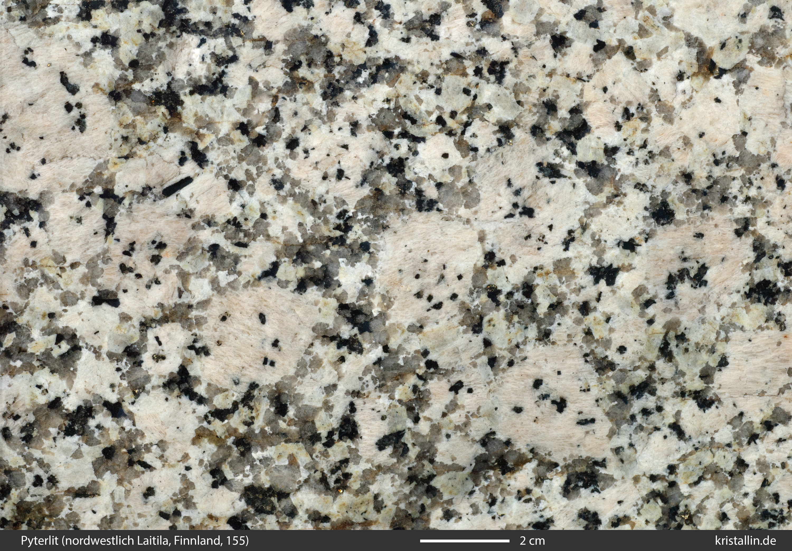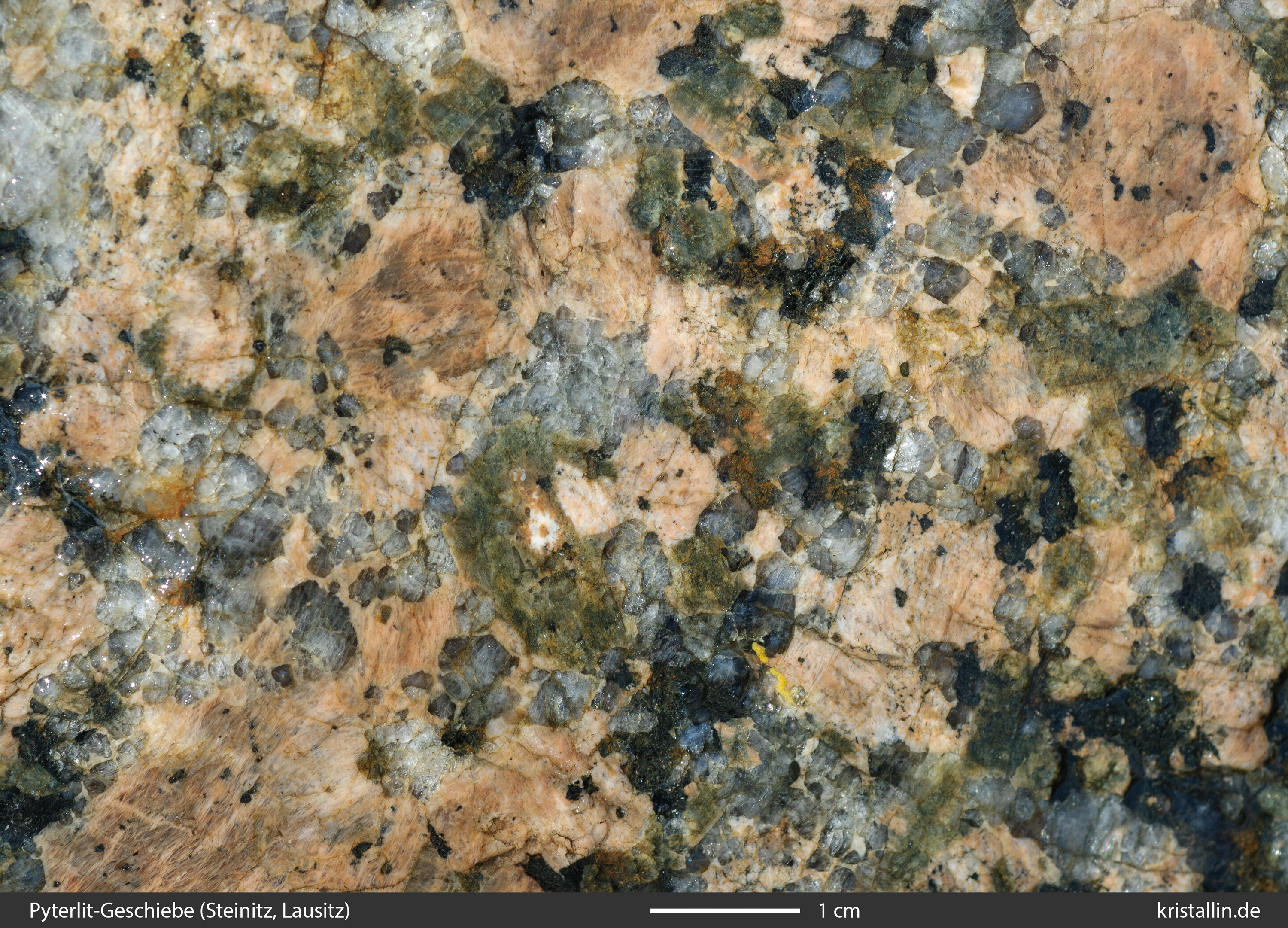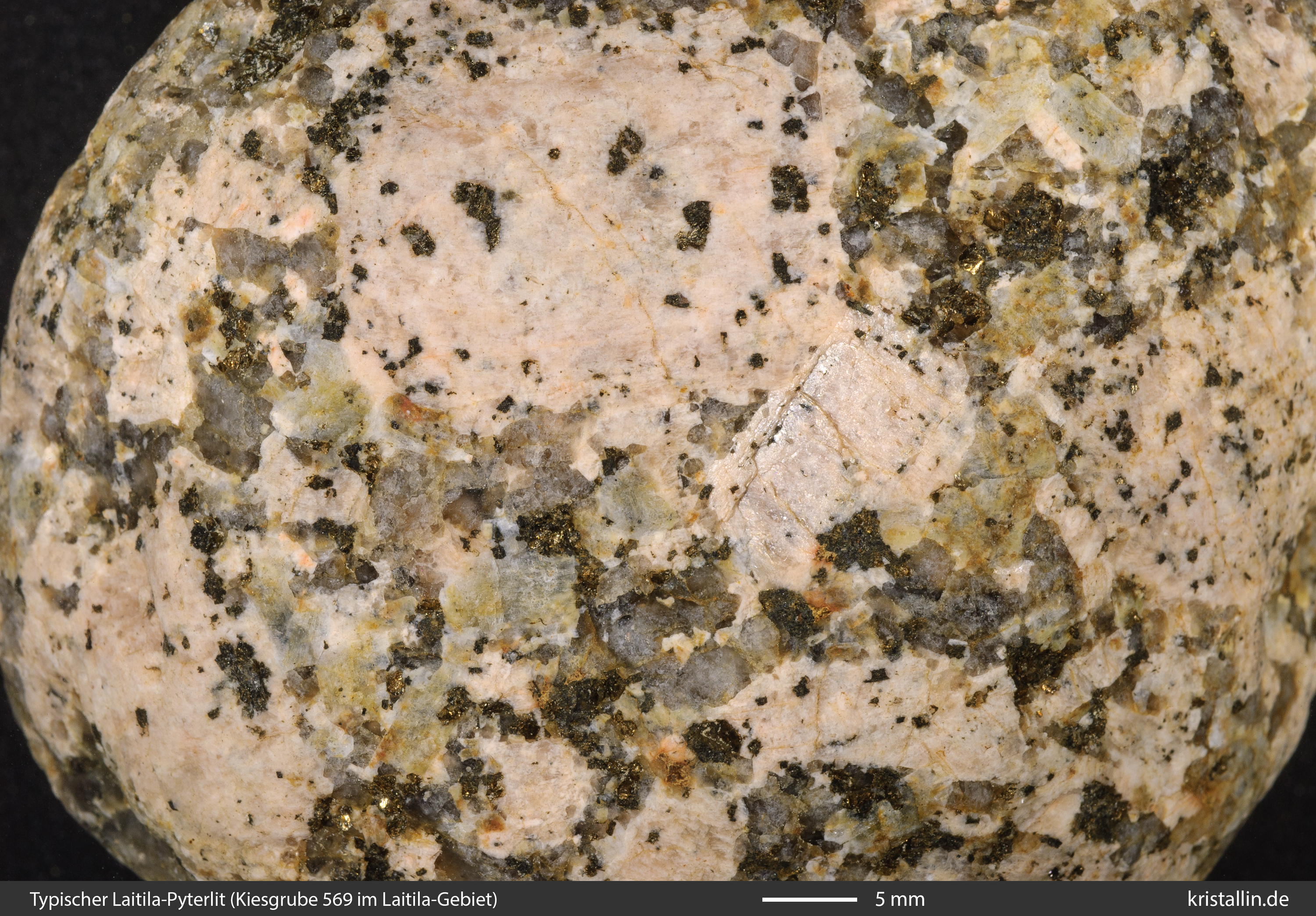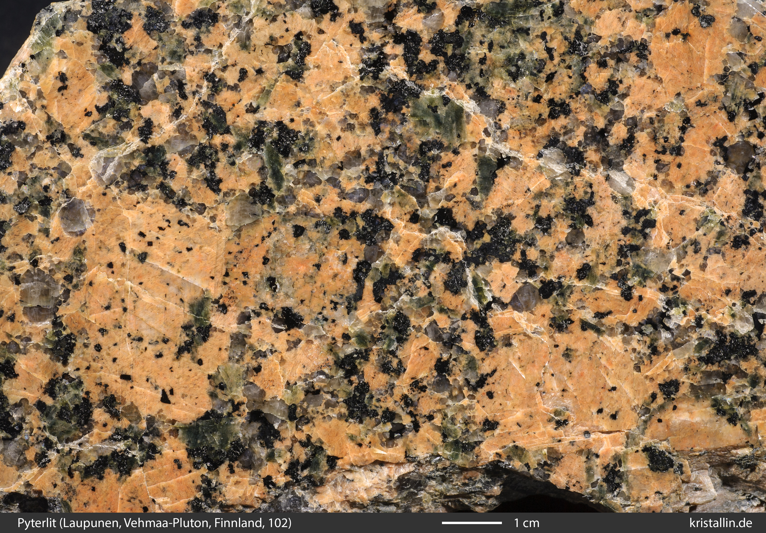 Der Alkalifeldspat ist in dieser Probe zwar etwas dunkler als bei den meisten Laitila-Vehmaa-Pyterliten, dafür ist das Gefüge als Ganzes charakteristisch.