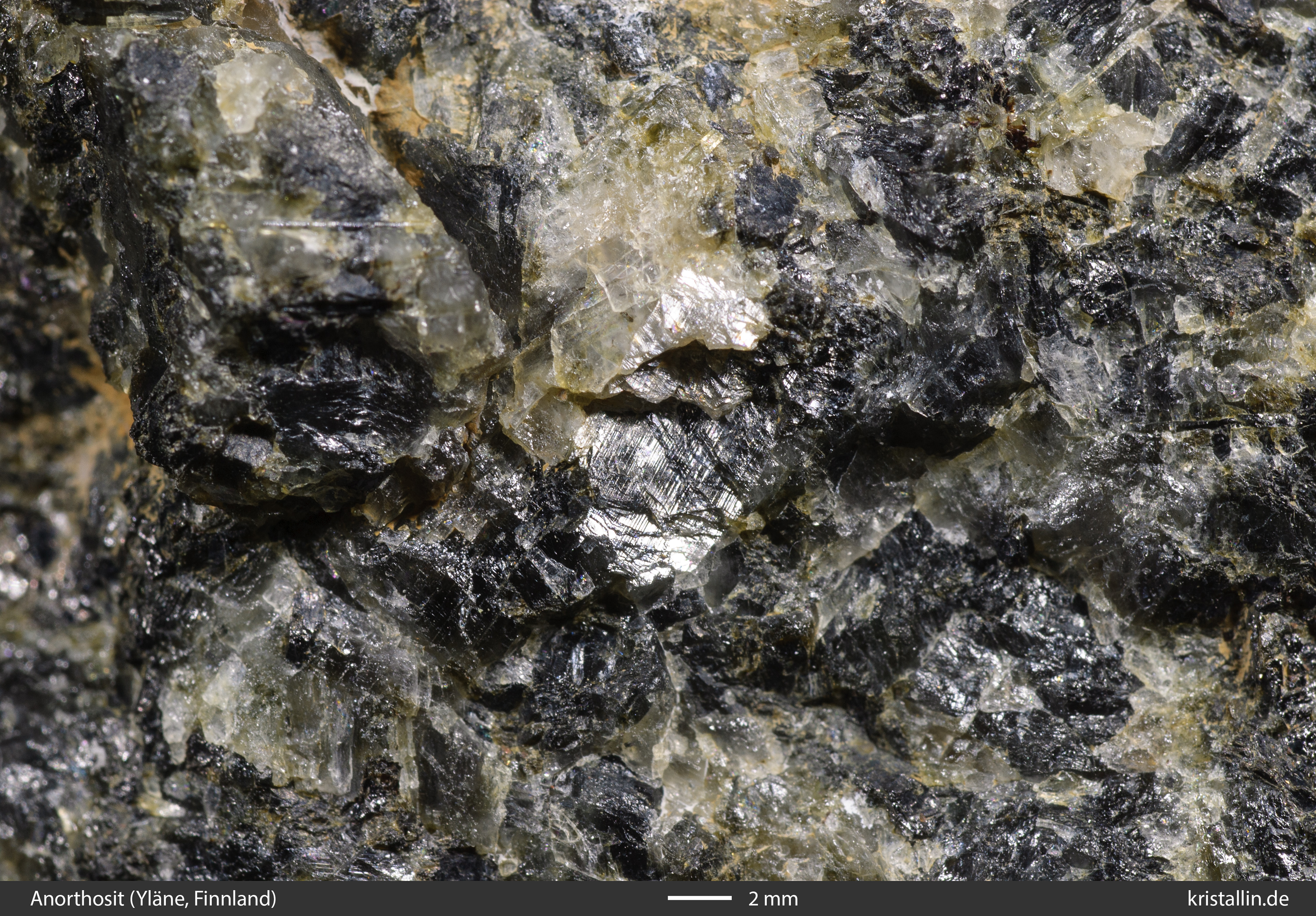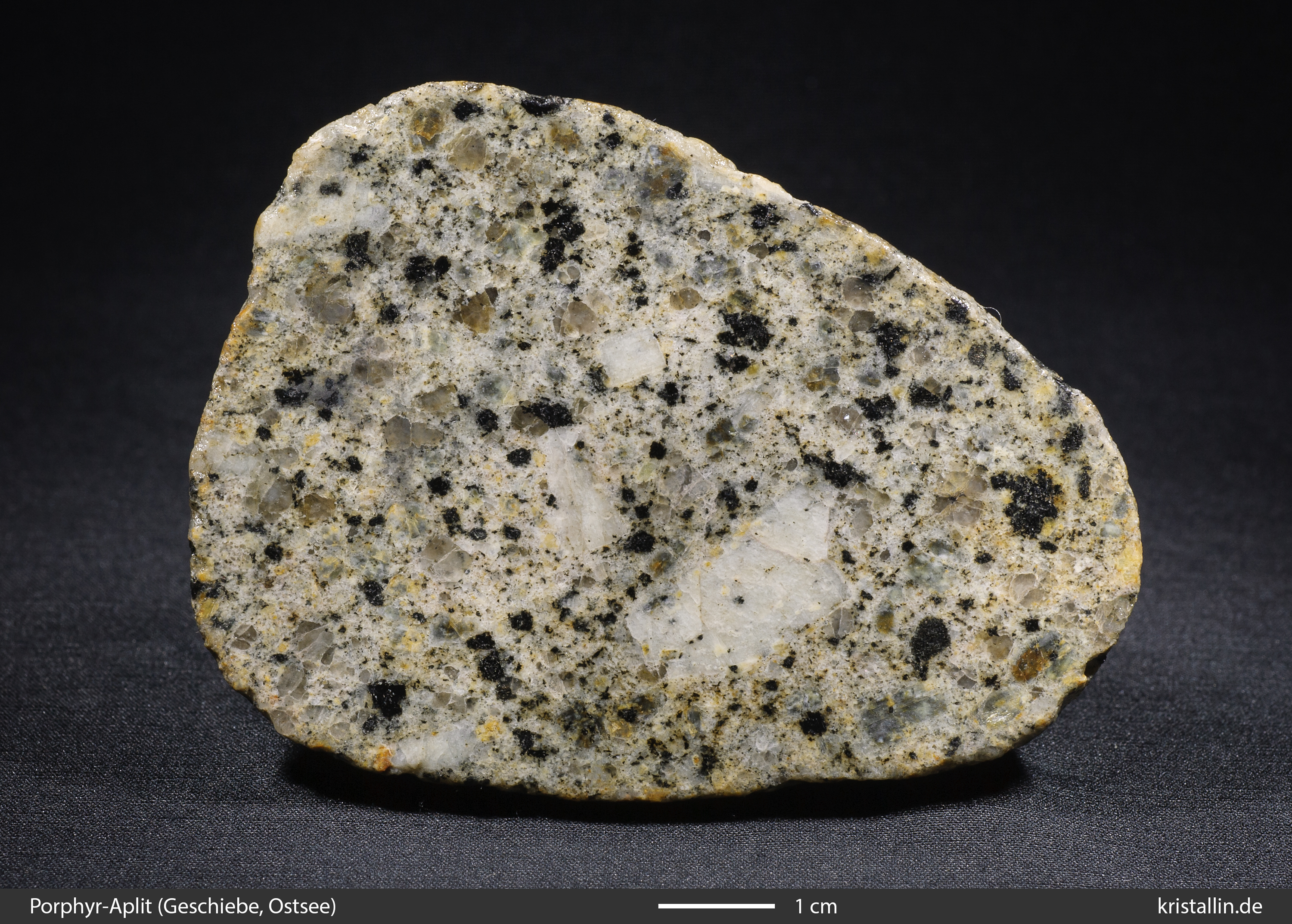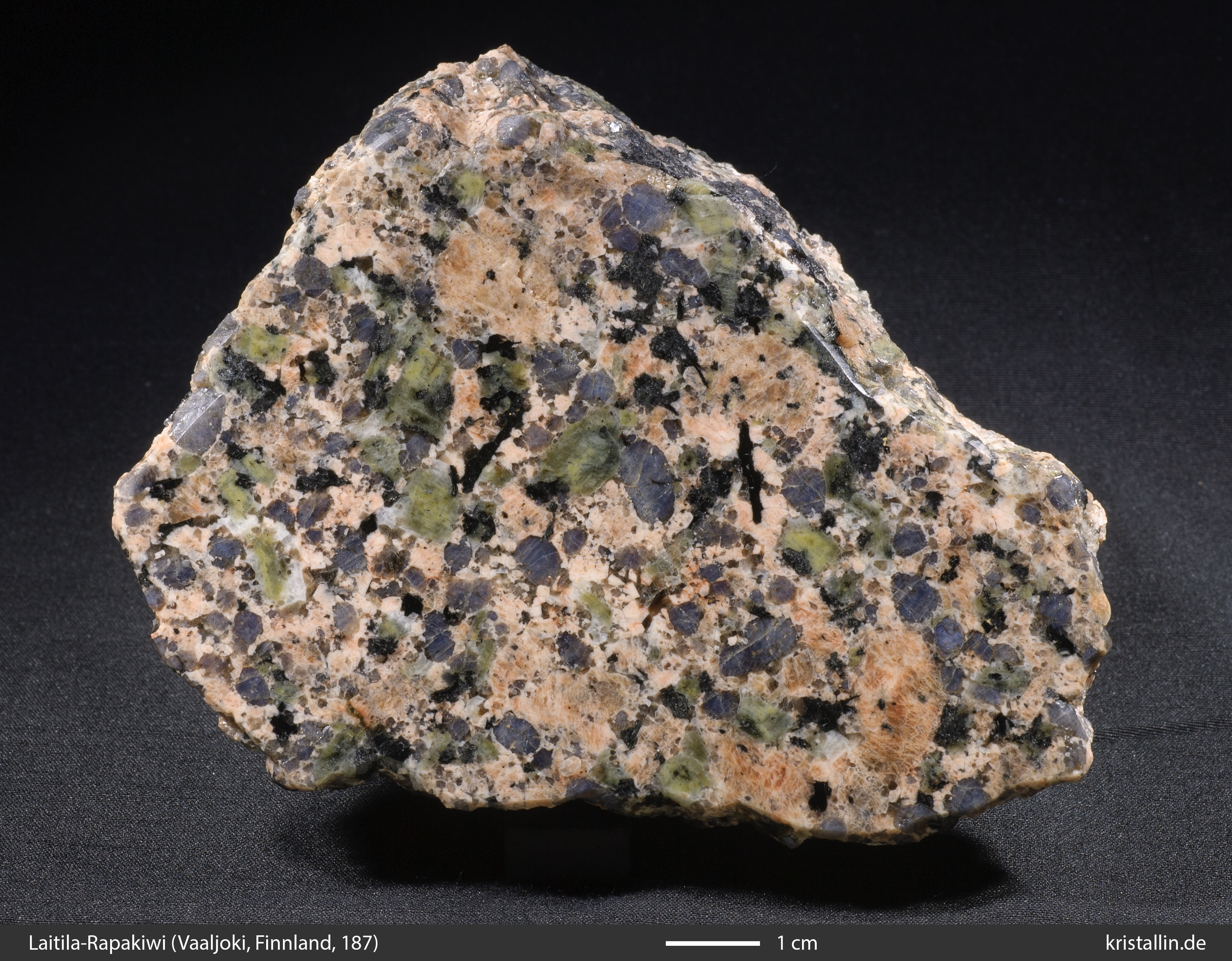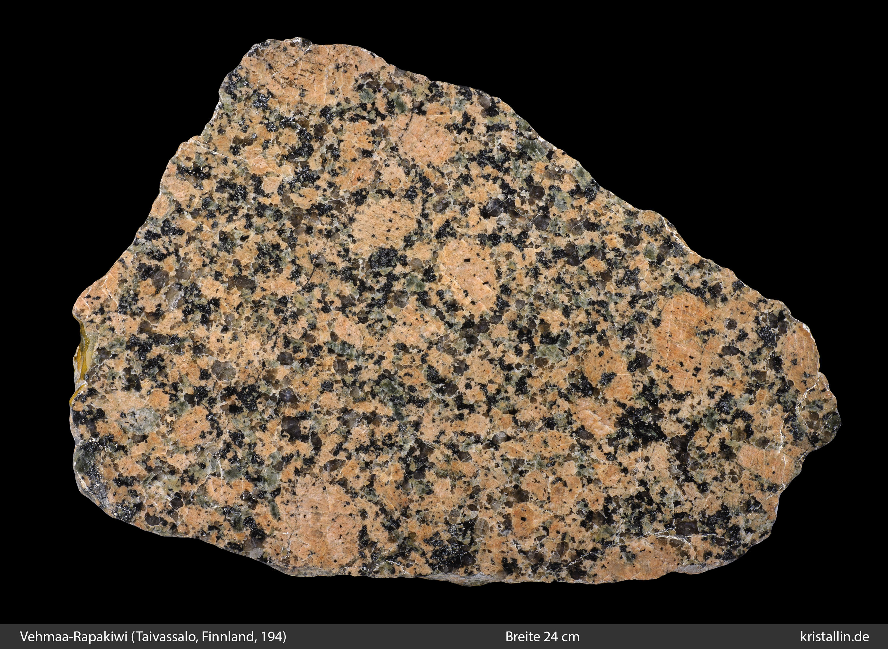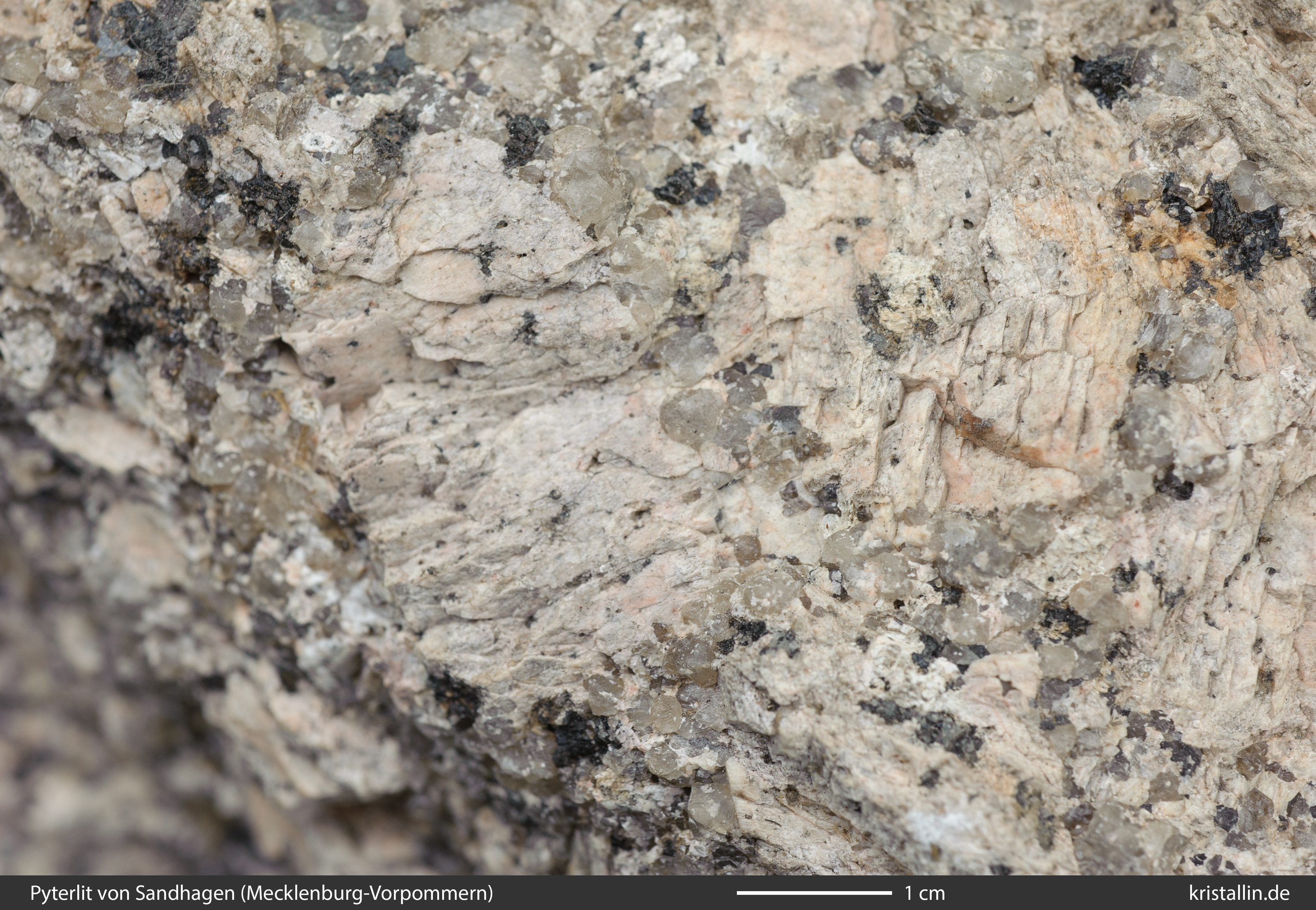 Der Alkalifeldspat ist in dieser Probe zwar etwas dunkler als bei den meisten Laitila-Vehmaa-Pyterliten, dafür ist das Gefüge als Ganzes charakteristisch.