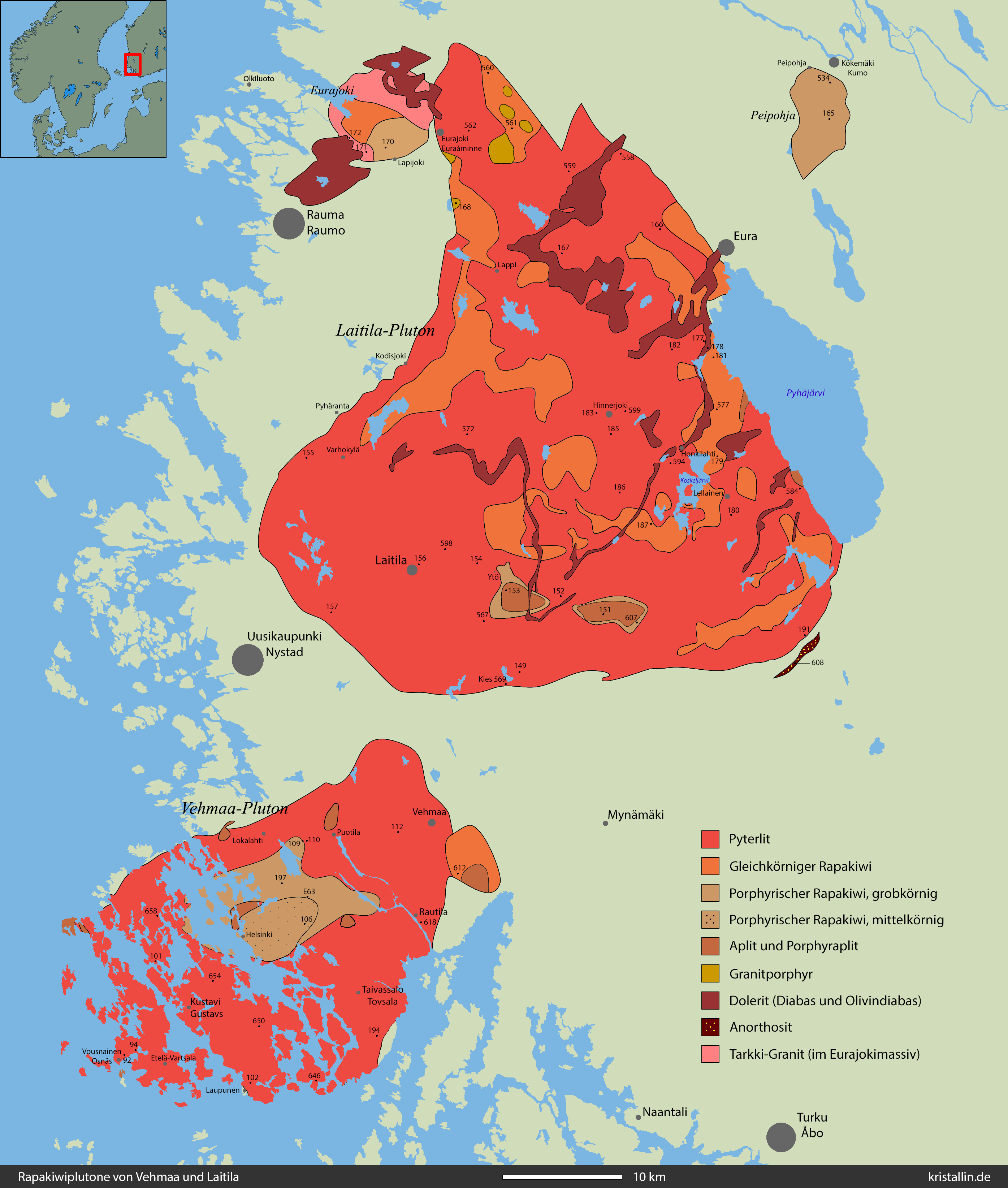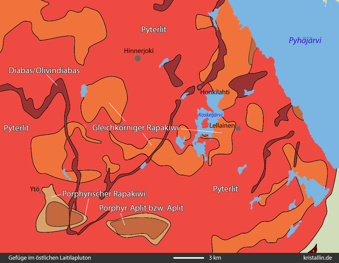 Der Laitila-Pluton ist mit etwa 1400 km2 sehr viel größer als der südwestlich liegende Vehmaa-Pluton. Auch im Laitilagebiet gibt es überwiegend Pyterlit, begleitet von porphyrischem und gleichkörnigem Rapakiwi. Wiborgitgefüge, also Ovoide mit Saum, fehlen in beiden Vorkommen völlig.