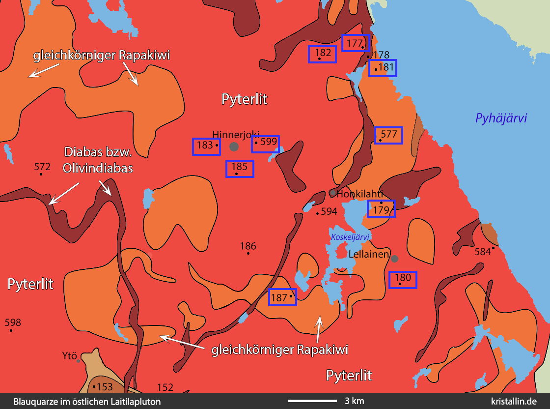 Die Karte 23 zeigt die ungefähre Ausdehnung des Blauquarzgebietes im Osten des Laitilaplutons. Jede blau umrandete Ziffer steht für eine Probe mit Blauquarz und grünem Plagioklas. Nur drei davon – 181, 187 und 577 – haben ein gleichkörniges Gefüge und nur sie sind Lellainen-Granite.