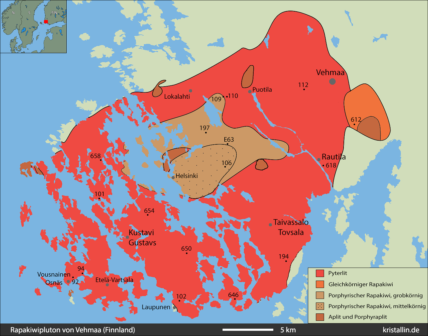 Der Vehmaa-Pluton liegt an der Südwestküste Finnlands und besteht zu großen Teilen aus Pyterlit, der einen inneren Bereich aus porphyrischem Rapakiwi umgibt. Dieser wiederum gliedert sich in einen grobkörnig-porphyrischen Mantel und einen mittelkörnig-porphyrischen Kern. Dort im Zentrum wird der Granit seit über 100 Jahren als Werkstein abgebaut.