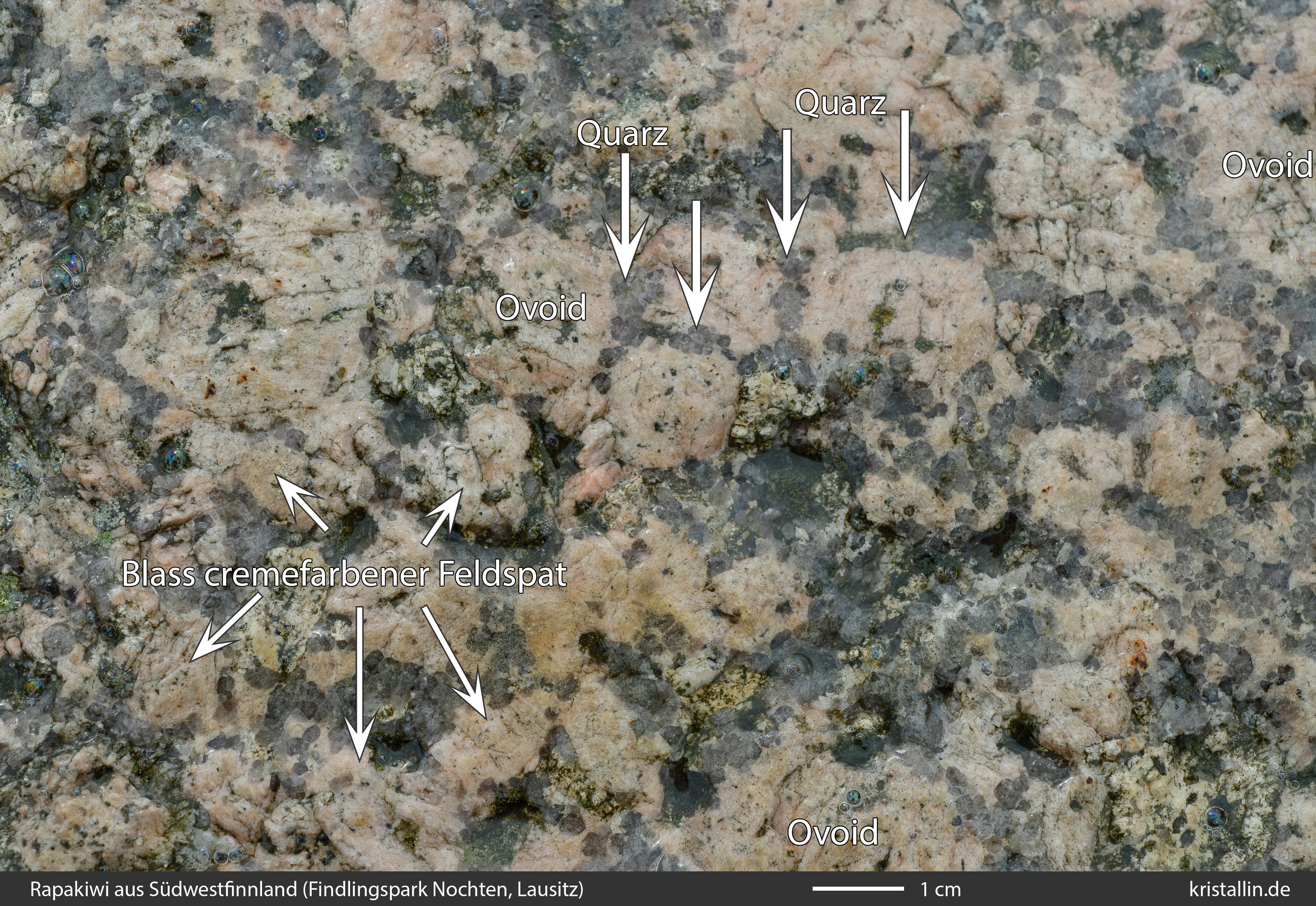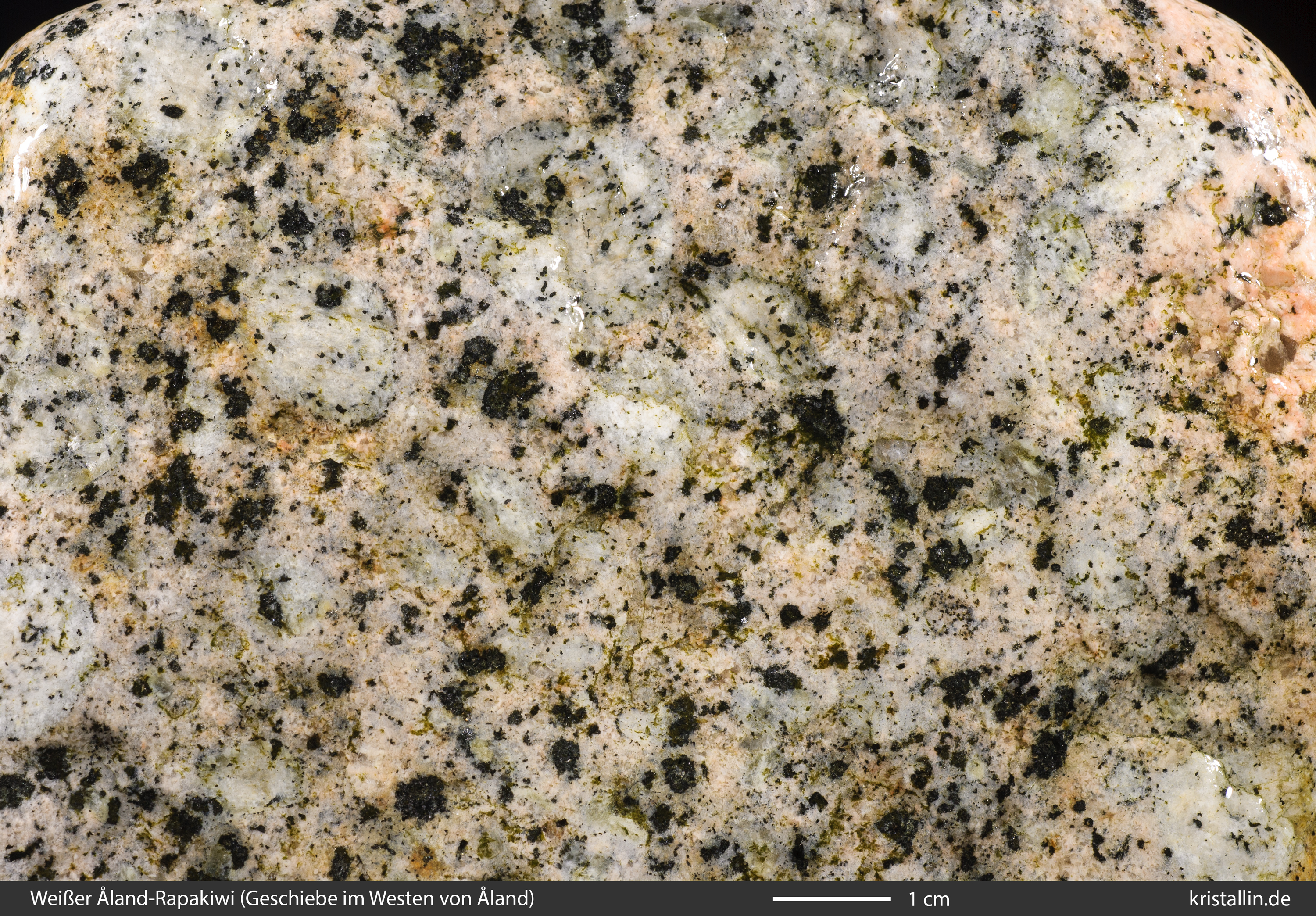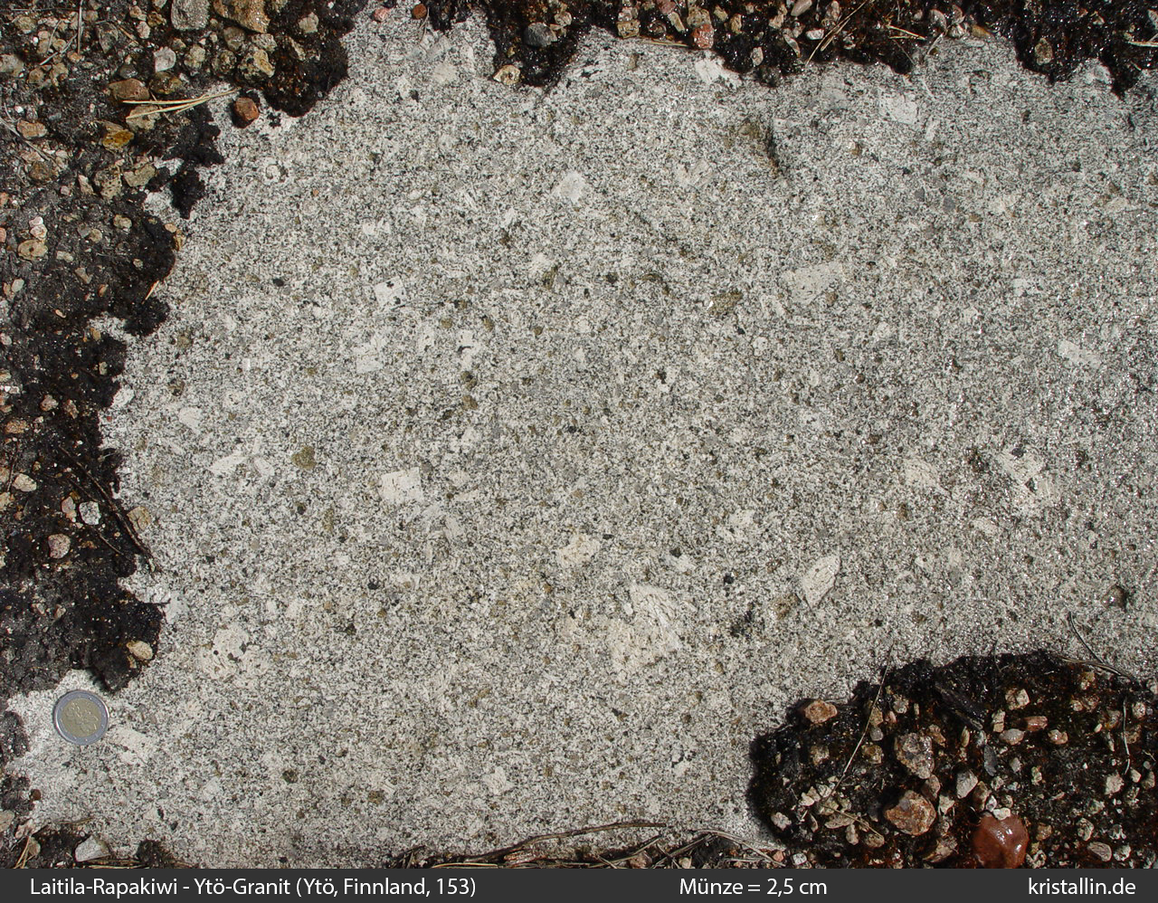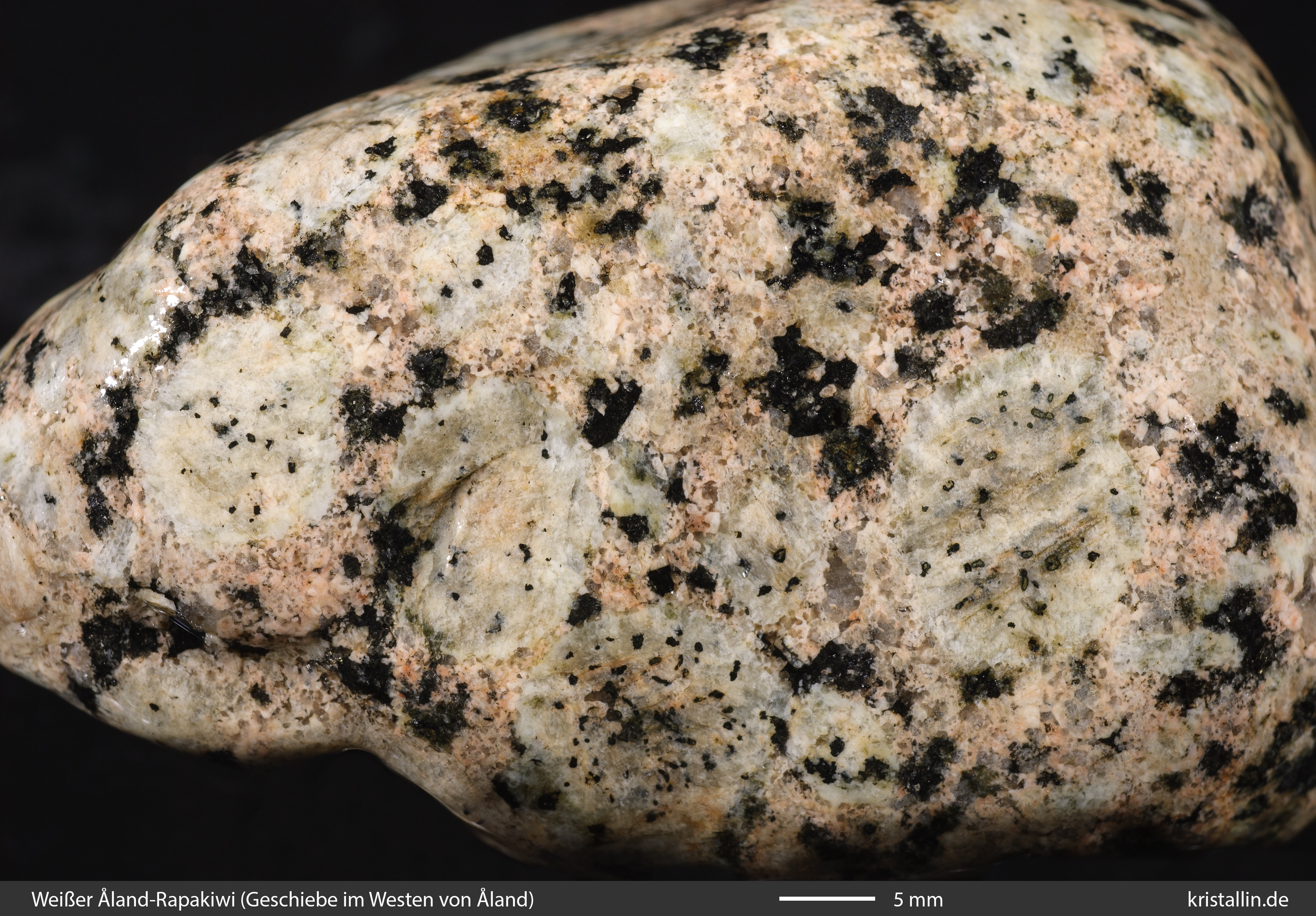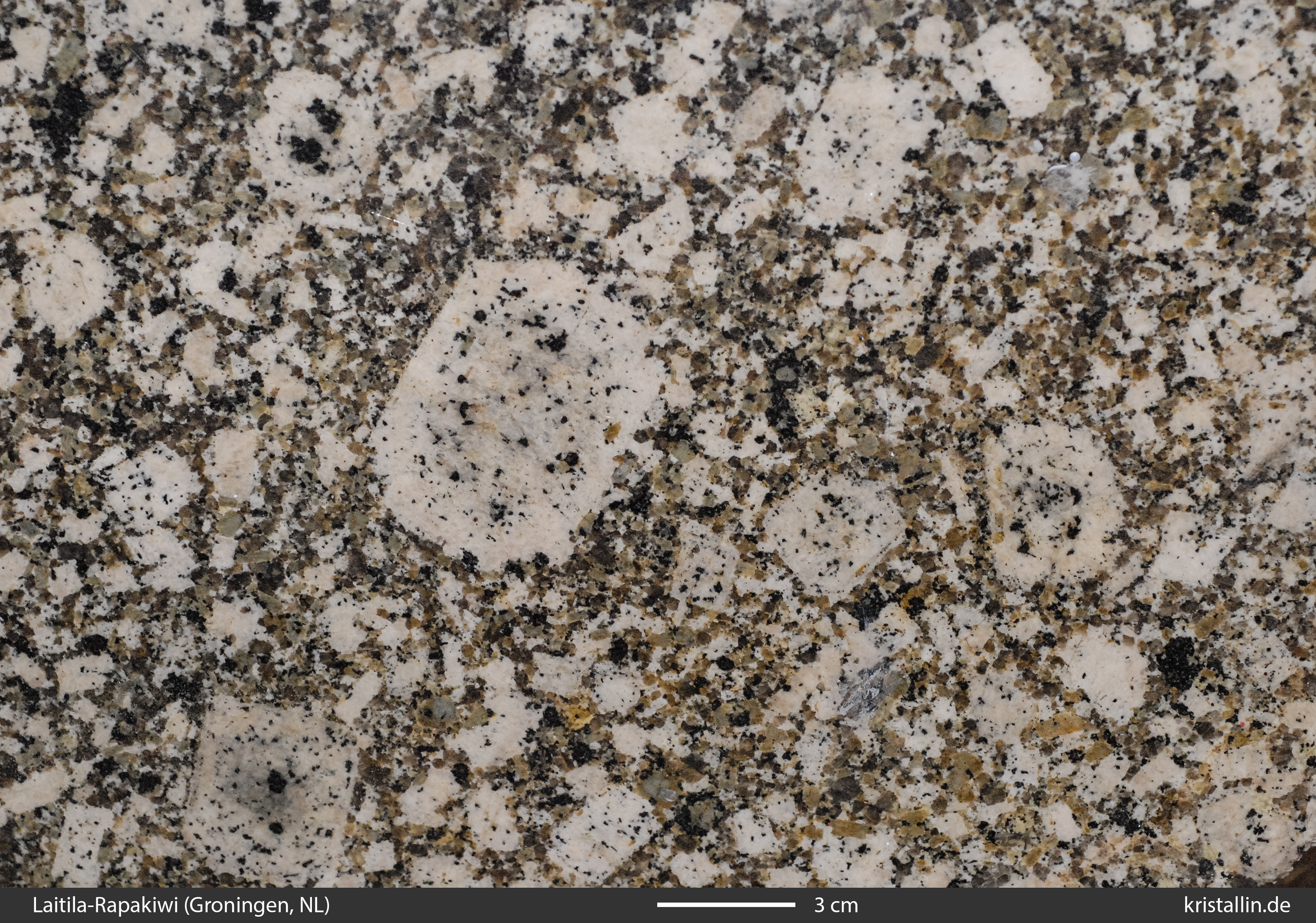 Dieser Rapakiwigranit ist fast weiß und damit eine Ausnahme. Nur einige der Ovoide sind cremefarben. Sie sind etwa 2 cm groß, was im Laitila-Pluton ein guter Durchschnittswert ist.