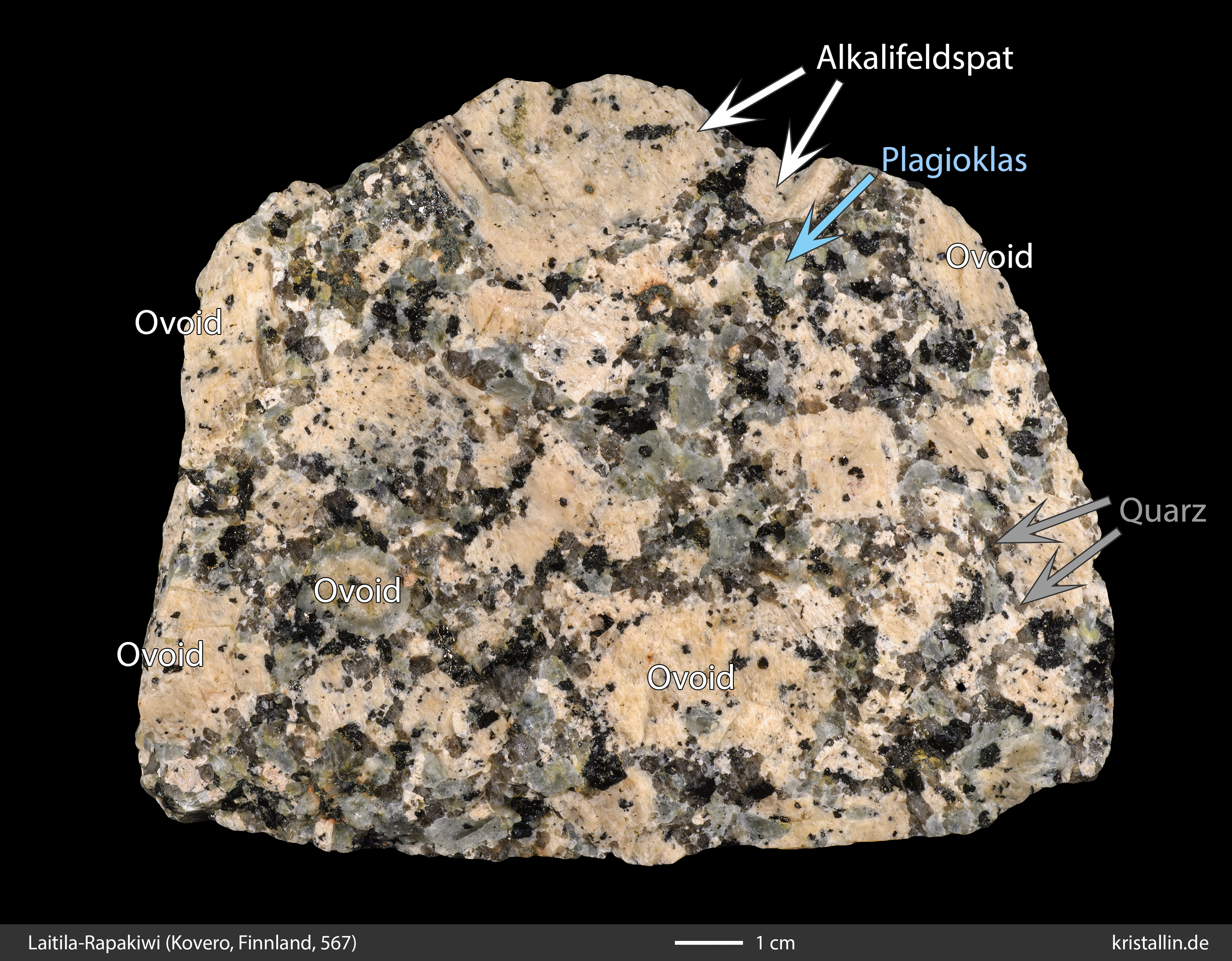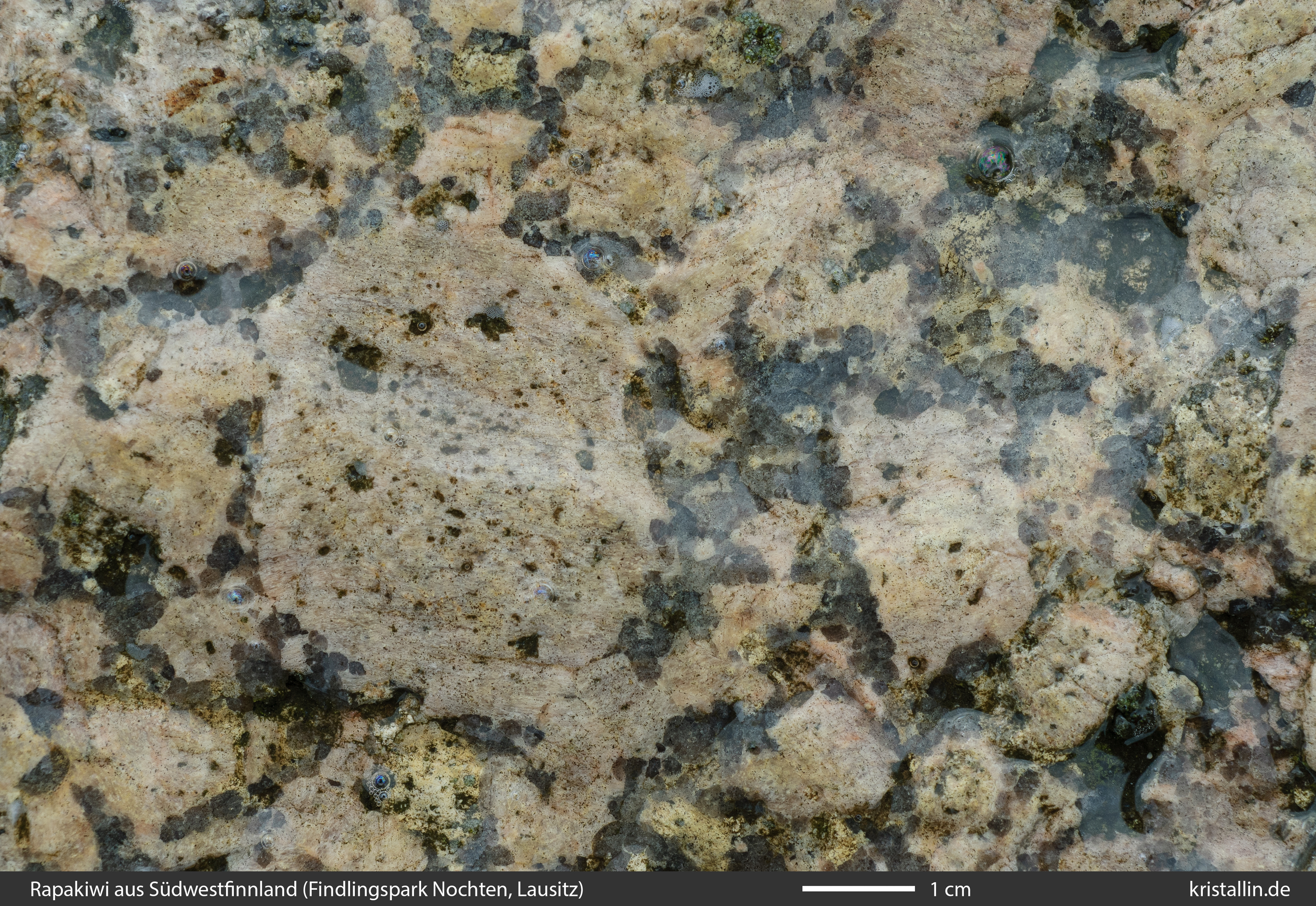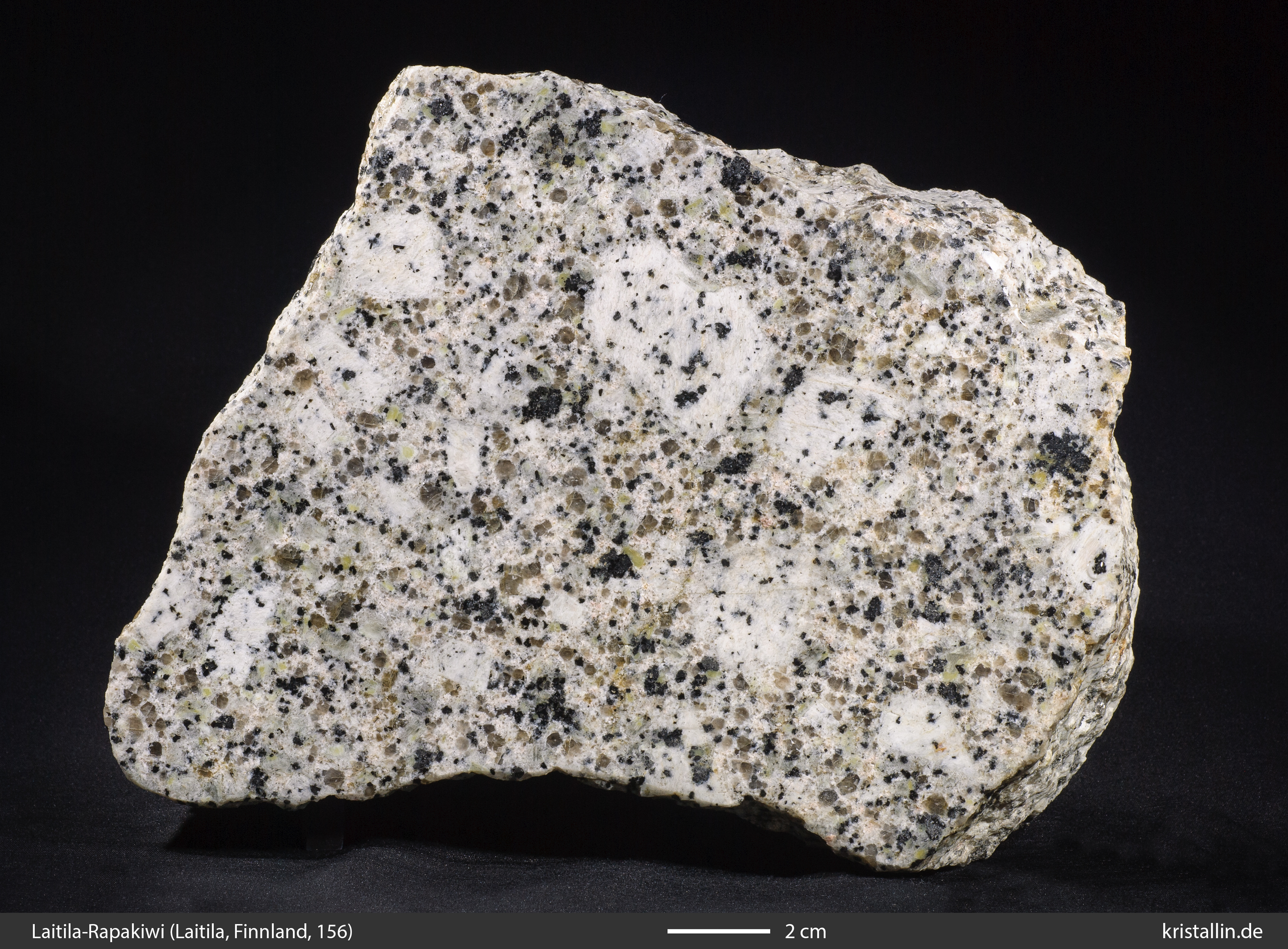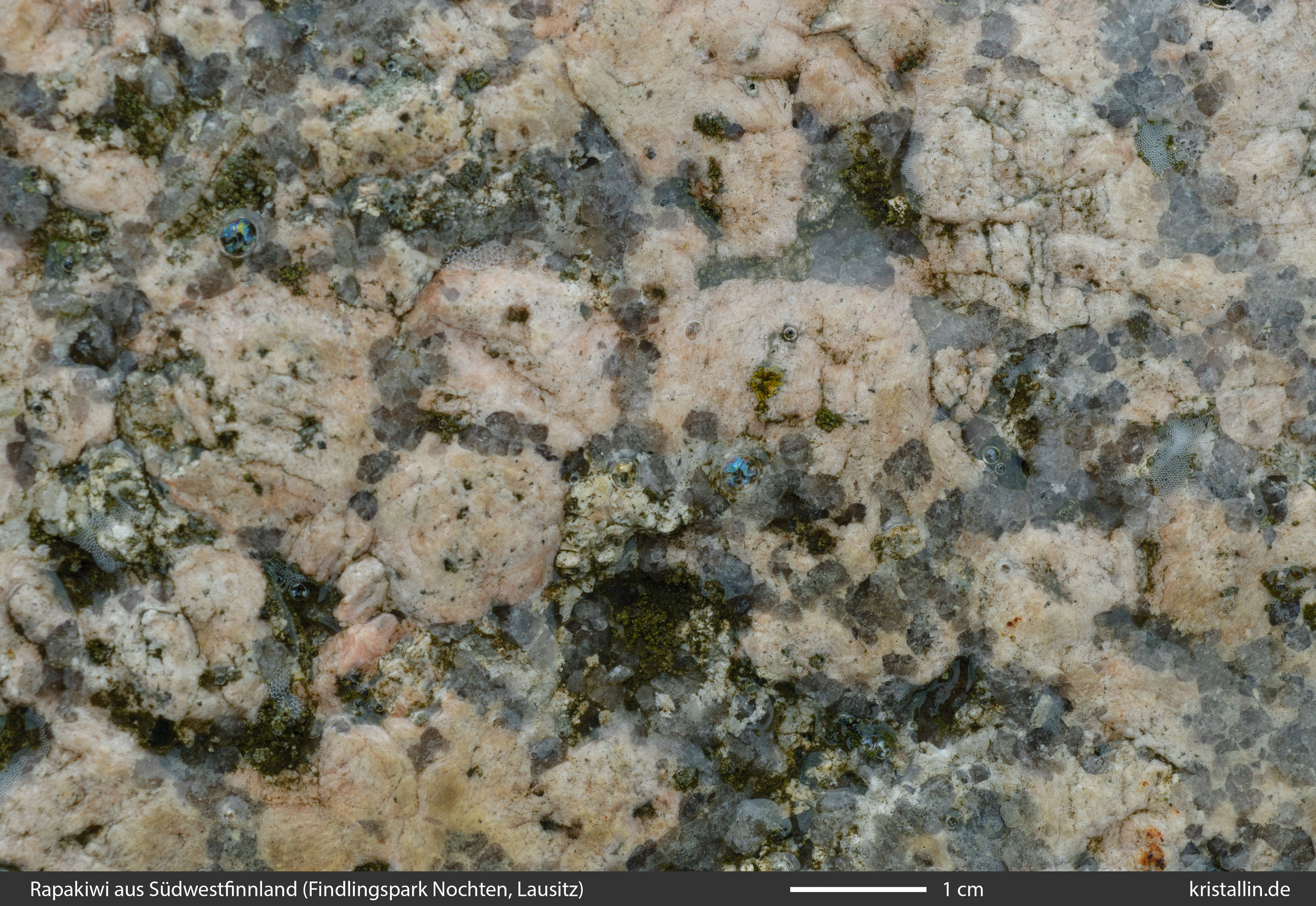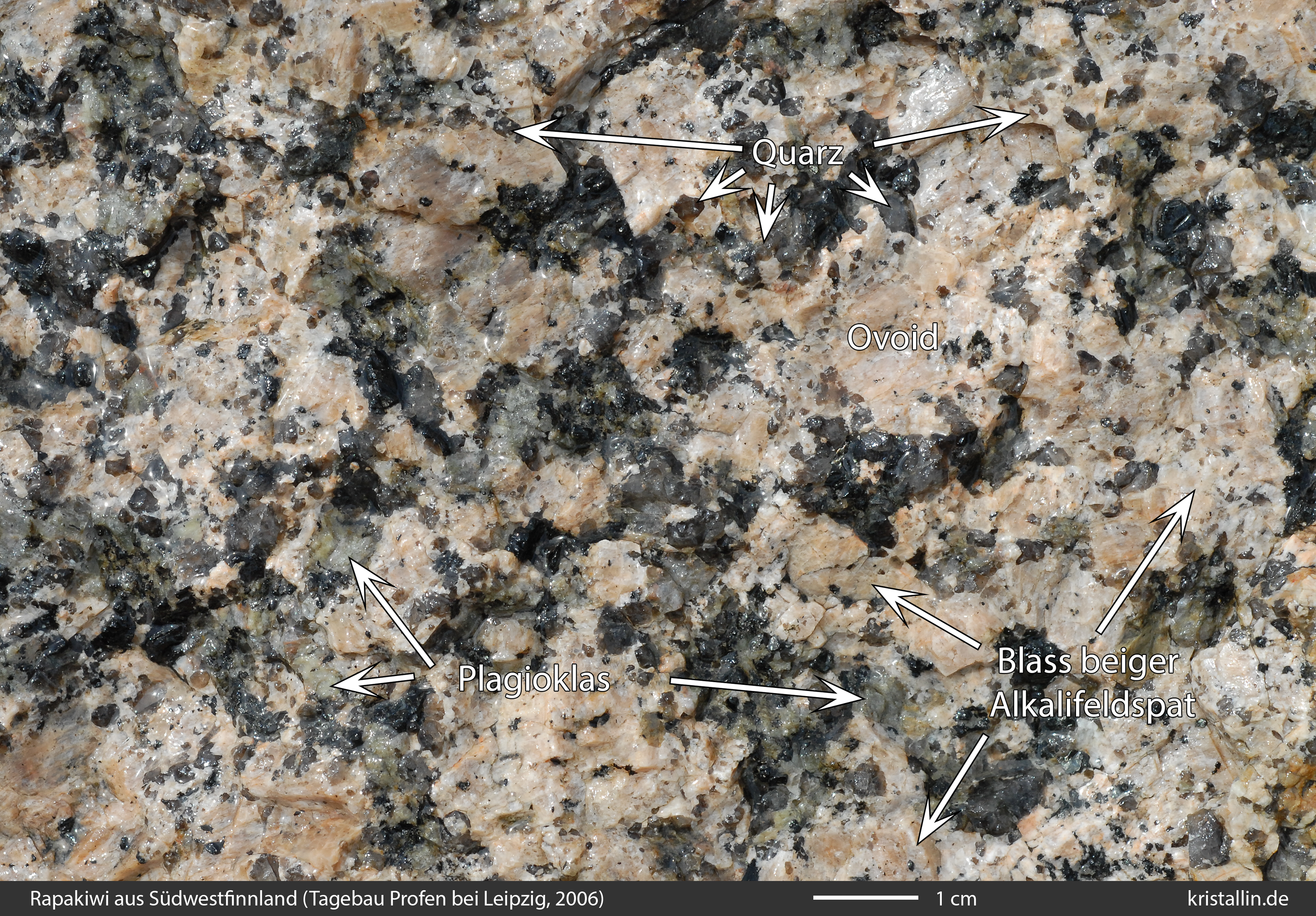 Dieser Rapakiwigranit ist fast weiß und damit eine Ausnahme. Nur einige der Ovoide sind cremefarben. Sie sind etwa 2 cm groß, was im Laitila-Pluton ein guter Durchschnittswert ist.