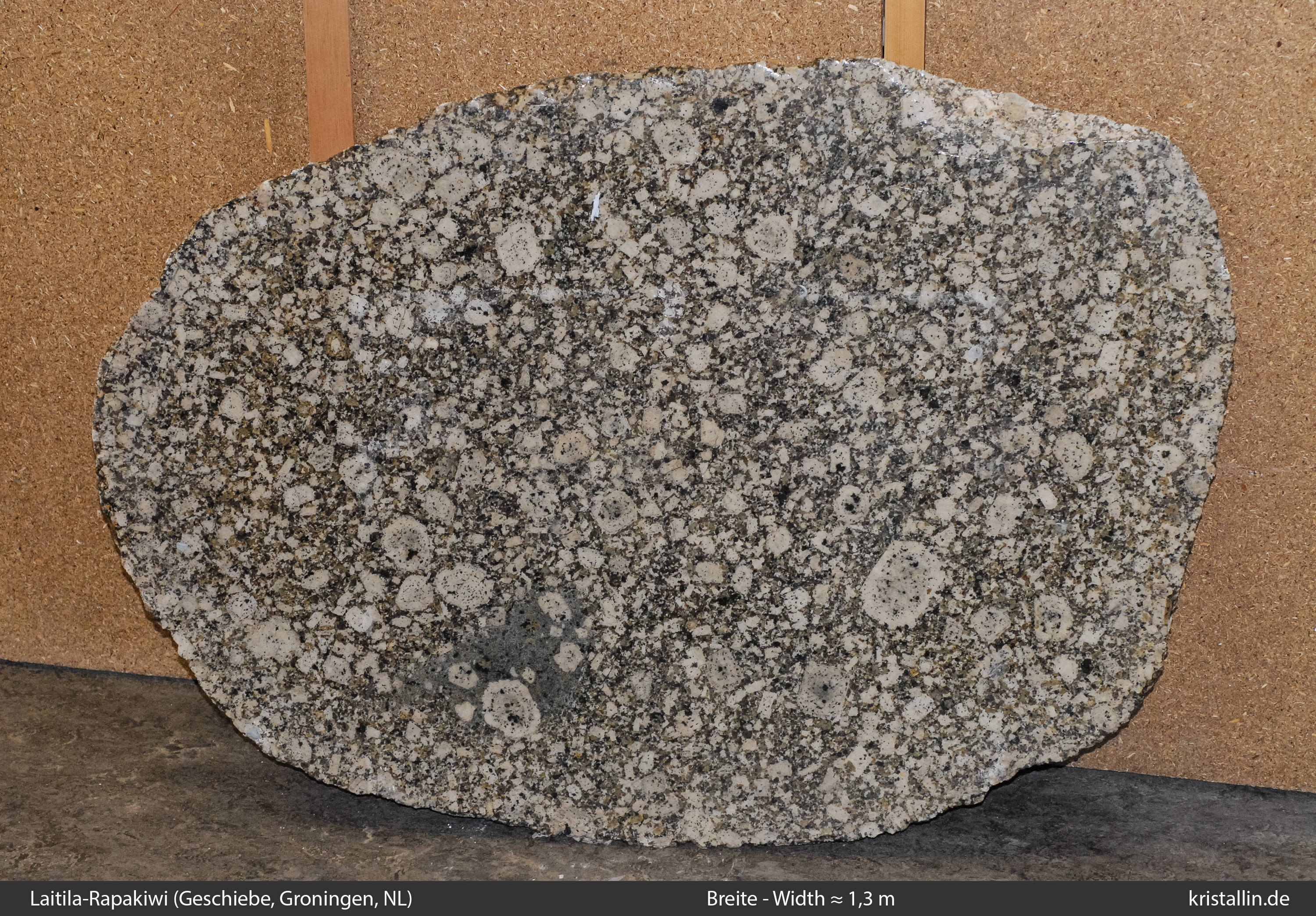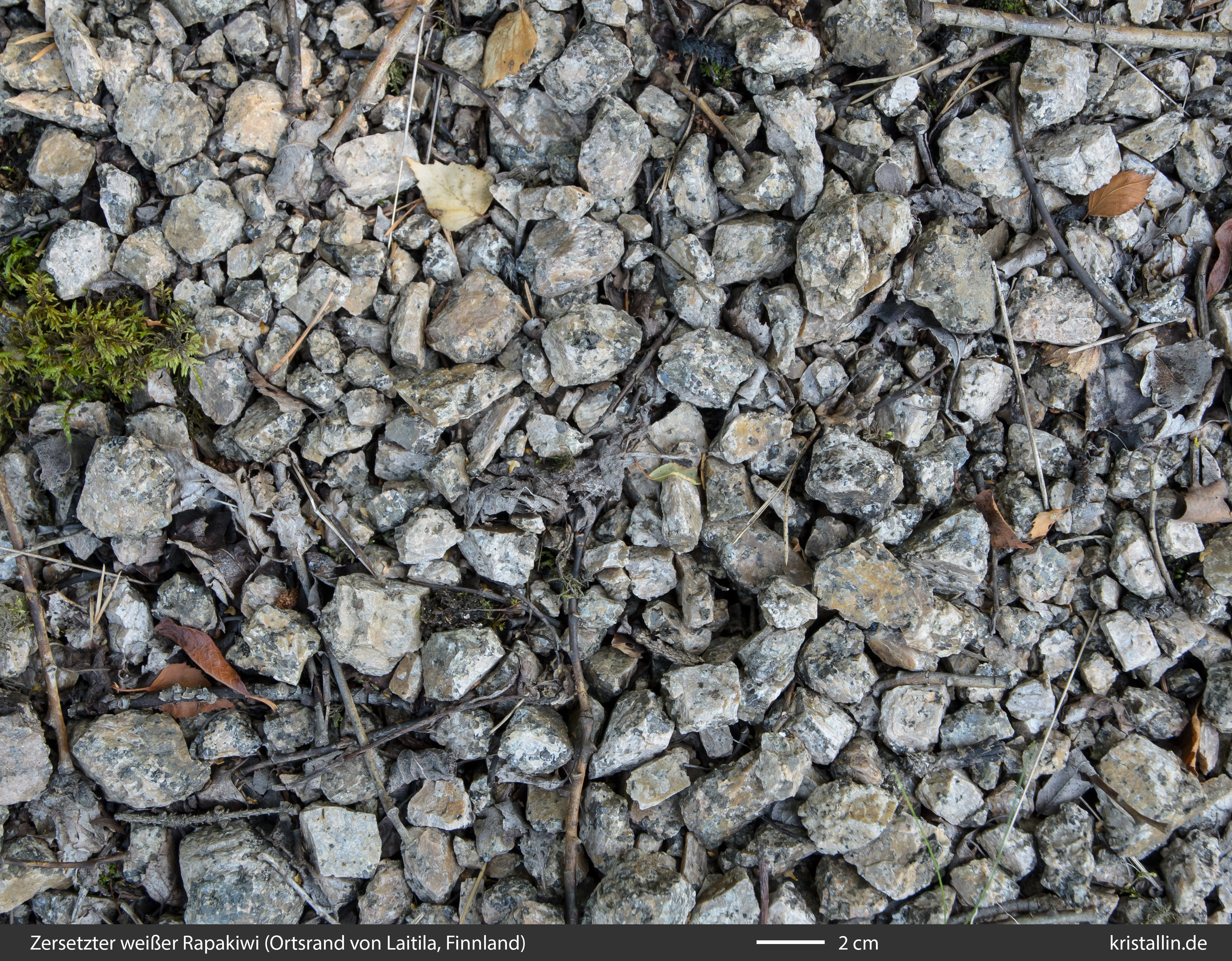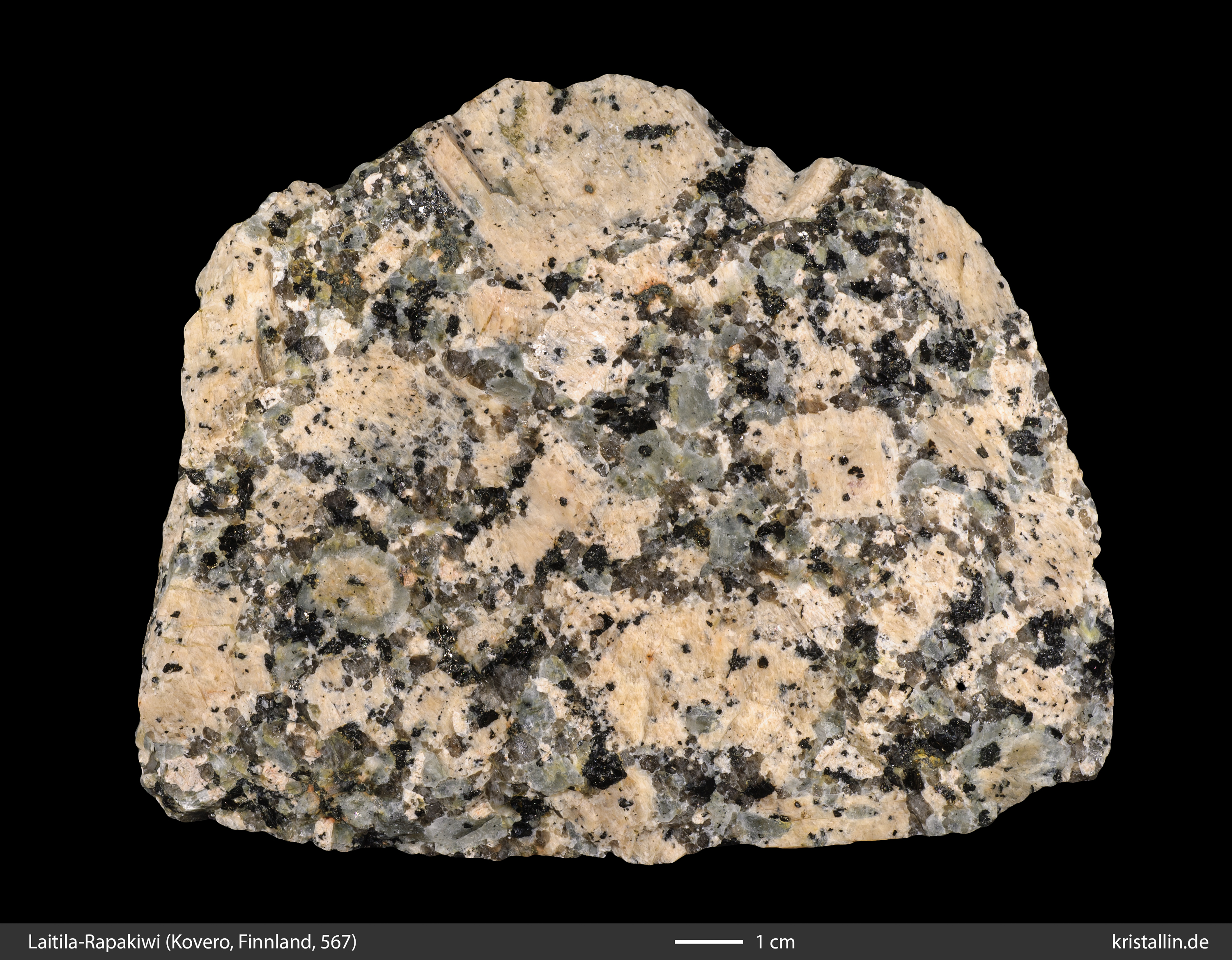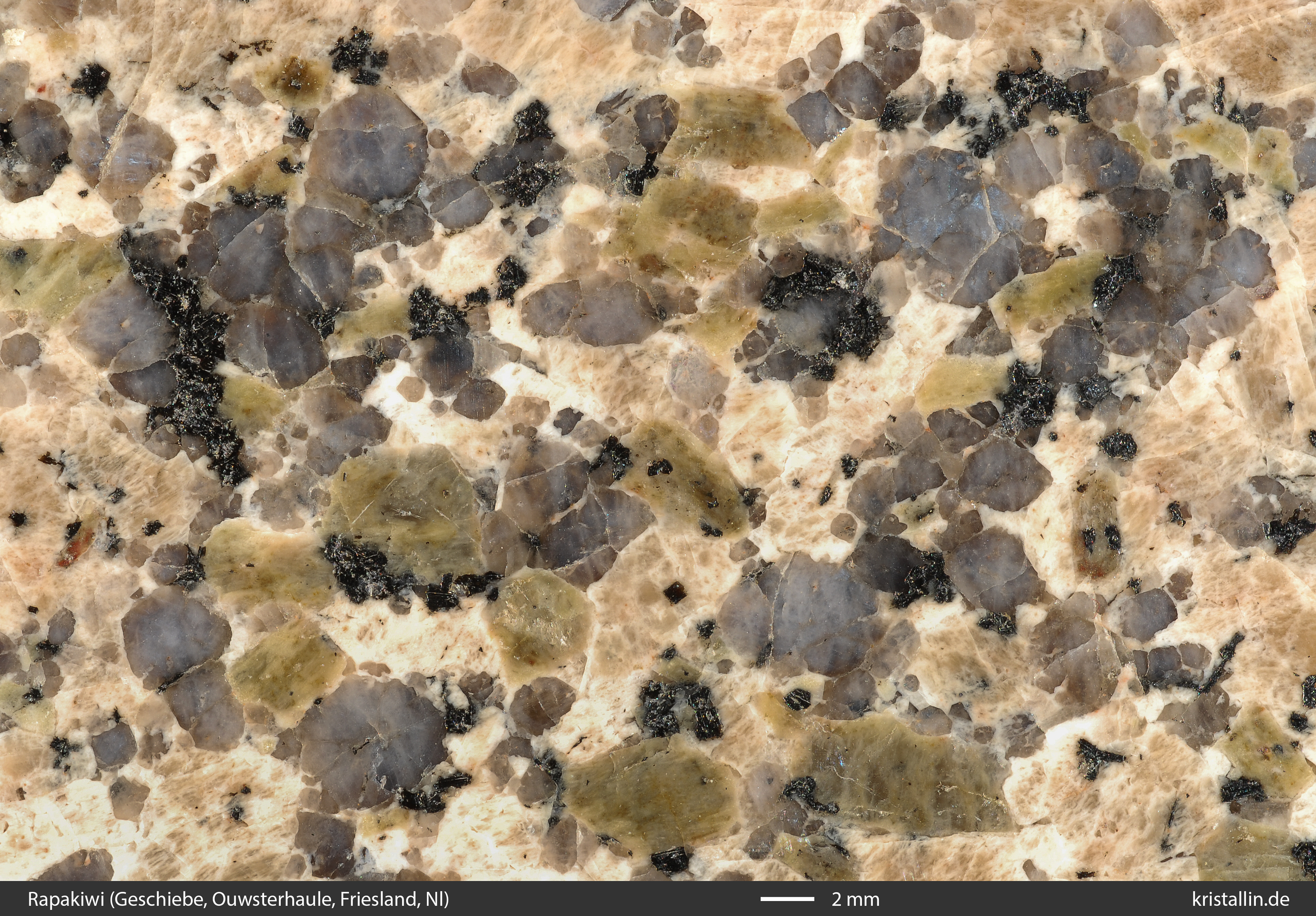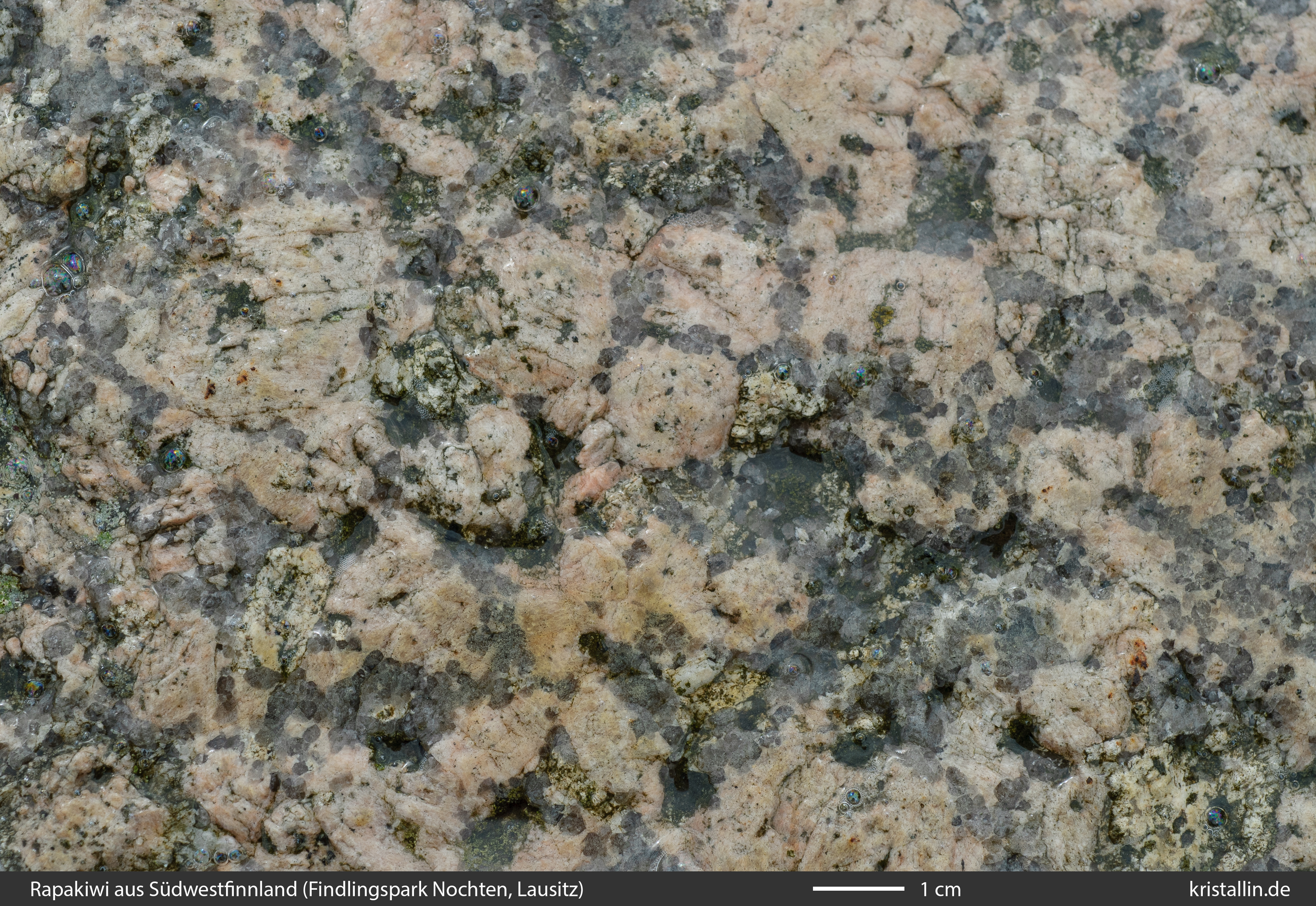 Dieser Rapakiwigranit ist fast weiß und damit eine Ausnahme. Nur einige der Ovoide sind cremefarben. Sie sind etwa 2 cm groß, was im Laitila-Pluton ein guter Durchschnittswert ist.