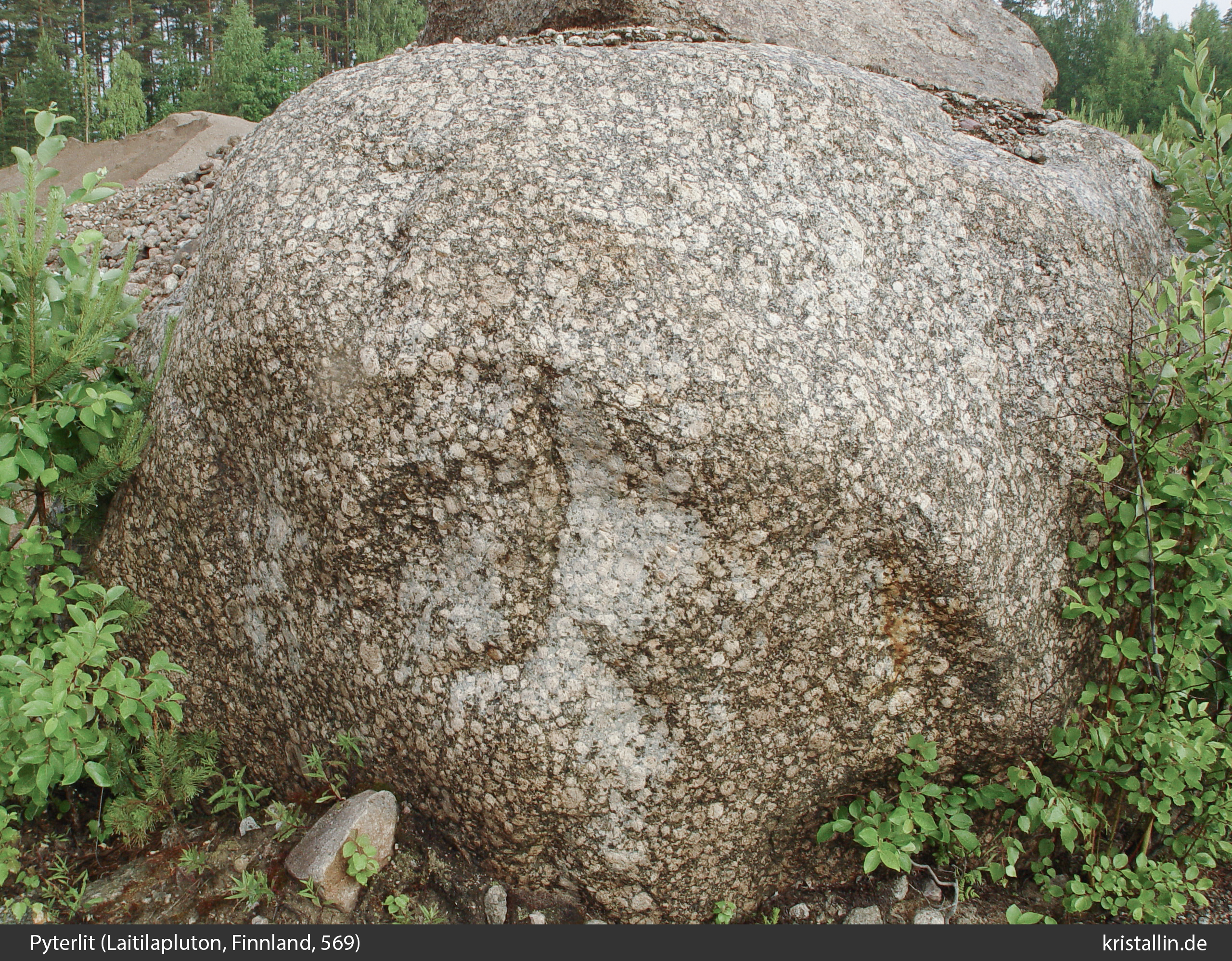Viele Laitila-Pyterlite enthalten blass-beige bis cremefarben Alkalifeldspat. Der große Findling mit dem typischen Gefüge liegt in einer Kiesgrube im Laitila-Gebiet. Er ist ein Nahgeschiebe.